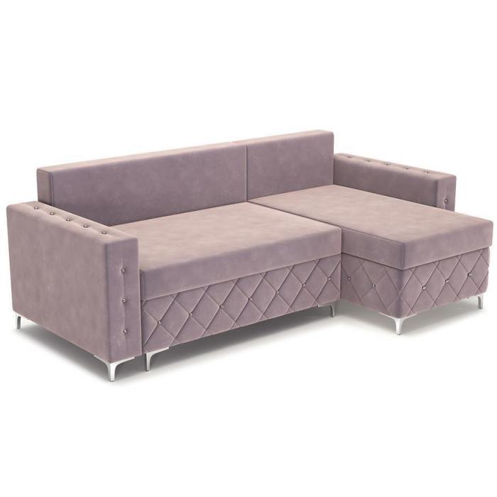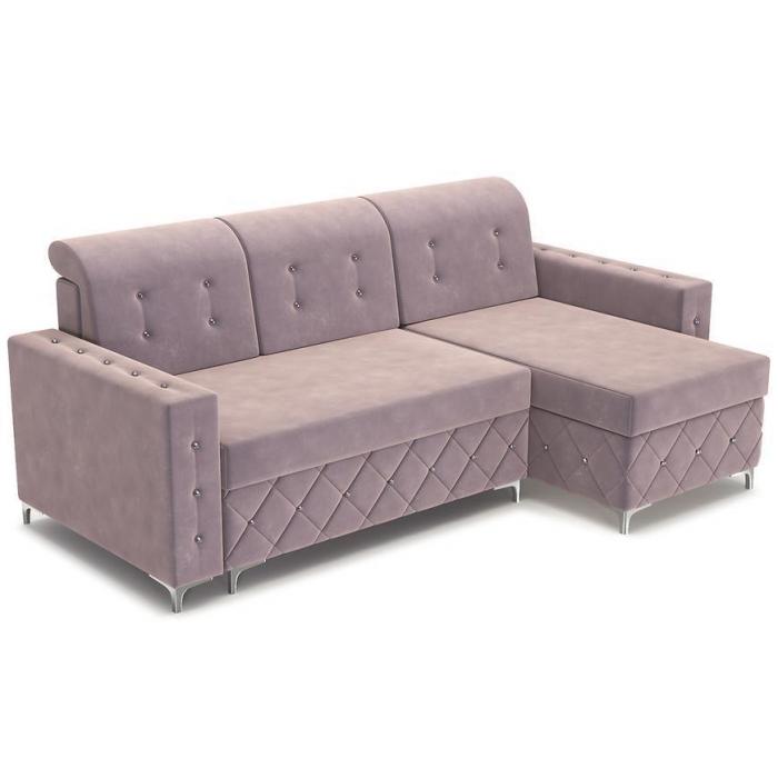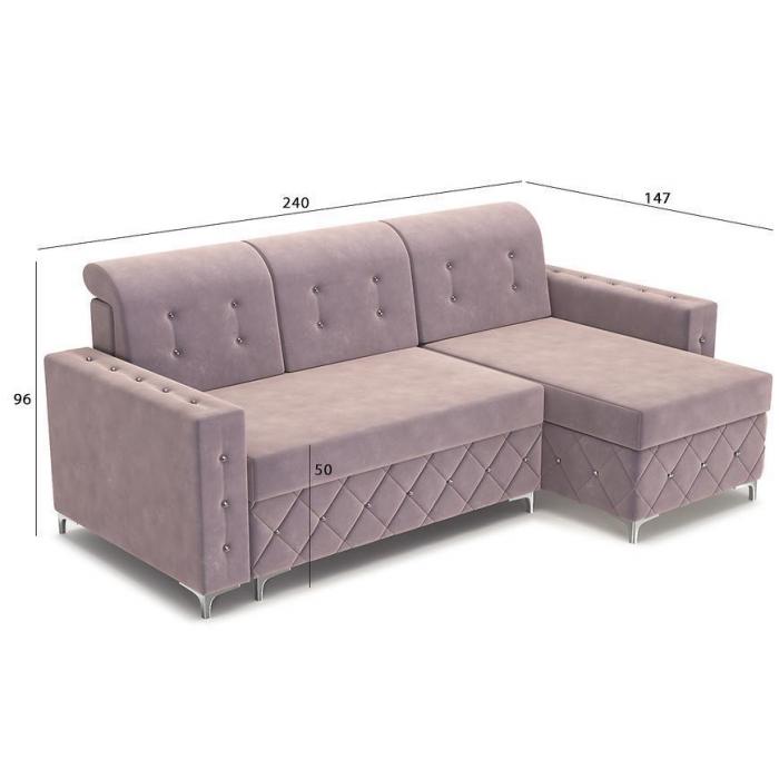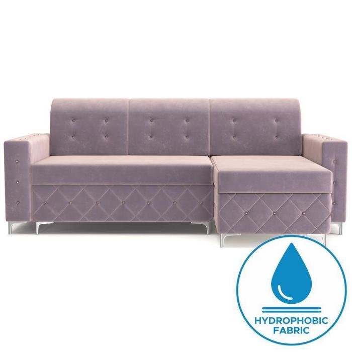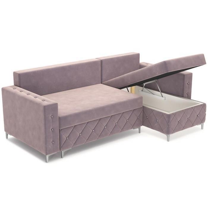 Kanapa narożna Monaco tapicerowana jest tkaniną w delikatnym, pastelowym odcieniu. Narożnik Monaco świetnie sprawdzi się w salonie czy młodzieżowym pokoju. Dodatkowego uroku dodają mu chromowane nóżki oraz pikowane oparcie i elementy siedziska. To doskonały wybór do wnętrz w stylu glamour.