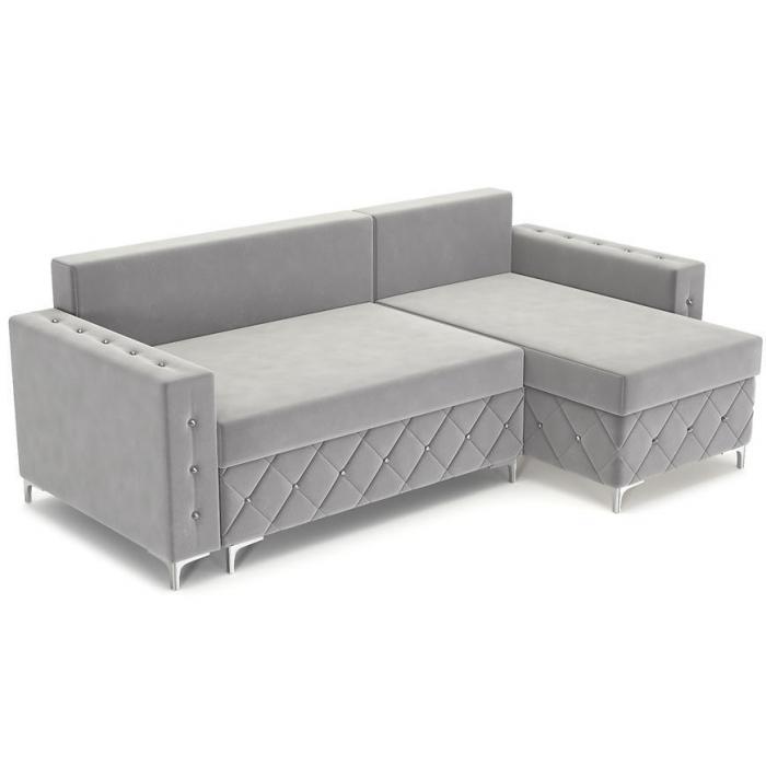 Kanapa narożna Monaco tapicerowana jest tkaniną w delikatnym, pastelowym odcieniu. Narożnik Monaco świetnie sprawdzi się w salonie czy młodzieżowym pokoju. Dodatkowego uroku dodają mu chromowane nóżki oraz pikowane oparcie i elementy siedziska. To doskonały wybór do wnętrz w stylu glamour.