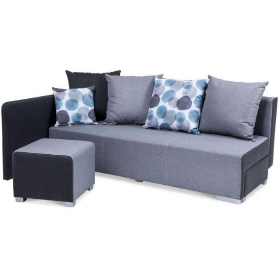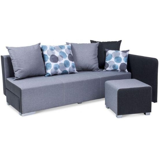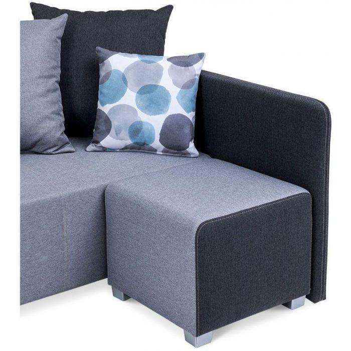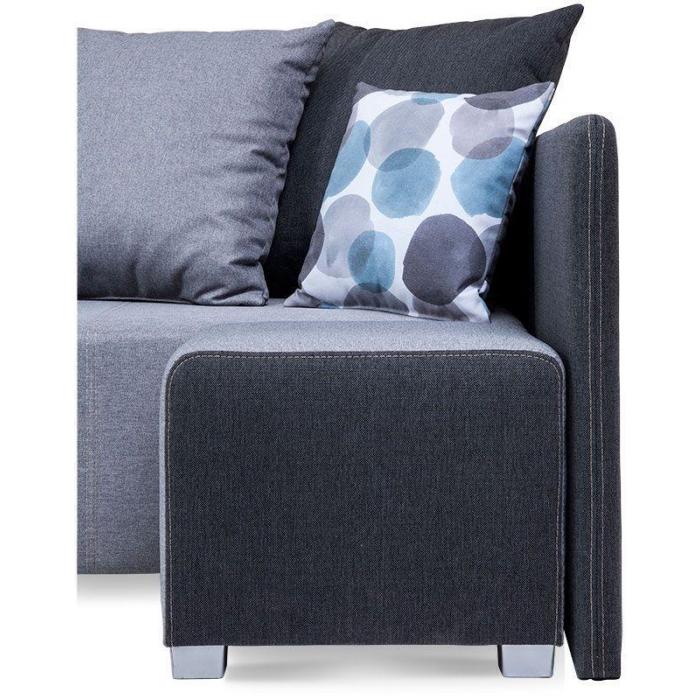 Kanapa narożna Narvik tapicerowana jest tkaniną w kolorze szarym. Kontrastowe połączenie tworzy ciekawy efekt wizualny. Nowoczesny narożnik Narvik świetnie sprawdzi się przede wszystkim w młodzieżowym pokoju, ale także salonie. W komplecie znajduje się jedna pufa, cztery duże poduszki oparciowe oraz jedna poduszka dekoracyjna.