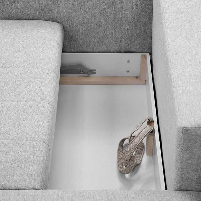 Sposób rozkładania DL pomaga szybko i bezproblemowo przekształcić kanapę w przestronne łóżko z funkcją spania. Rozkładanie tego typu jest często spotykane w narożnikach. Po rozłożeniu to okazjonalne miejsce do spania o wymiarach 144x208 cm, a pościel można schować do pojemnika umieszczonego pod siedziskiem zapewniając ład i porządek w pomieszczeniu.