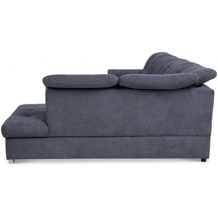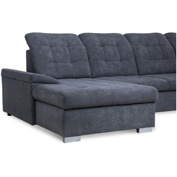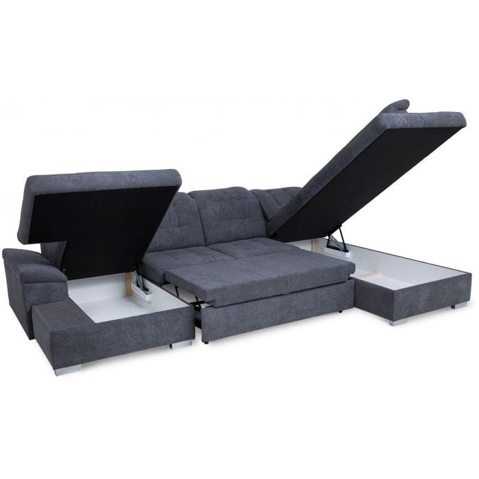 Narożna kanapa Nixon z funkcją spania posiada dodatkowe miejsce do przechowywania w formie dwóch pojemników na pościel. Powierzchnia spania po rozłożeniu narożnika wynosi 117x250 cm. Regulowane, ruchome zagłówki i oparcie oraz wygodne siedzisko wypełnione sprężyną falistą zapewnią komfortowy wypoczynek.