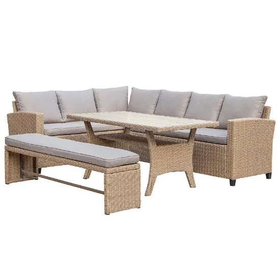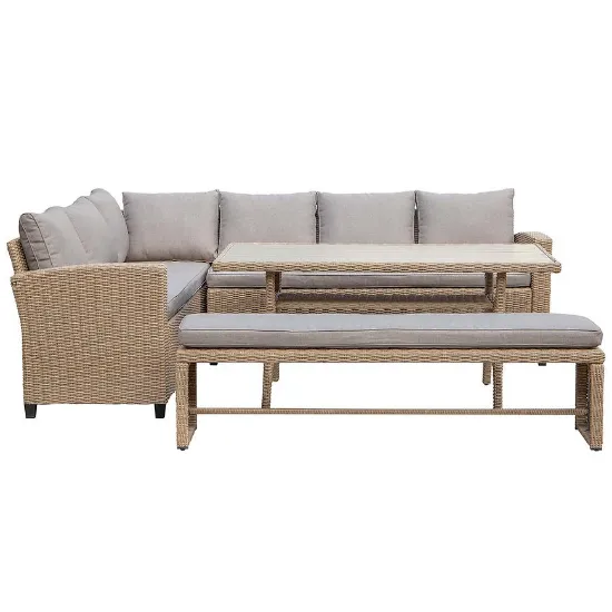 Przemyślany układ narożnika z dodatkiem ławki umożliwia wygodne rozmieszczenie większej liczby osób, a miękkie poduszki w zestawie zwiększają komfort wypoczynku. Naturalna kolorystyka doskonale wpisuje się w otoczenie zieleni, tworząc przytulną i nowoczesną strefę relaksu na świeżym powietrzu. Idealny wybór na sezon letni i wspólne chwile z rodziną czy przyjaciółmi.