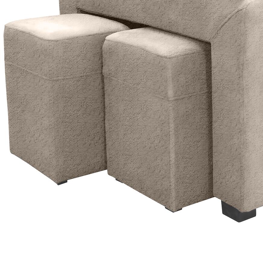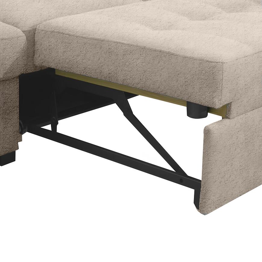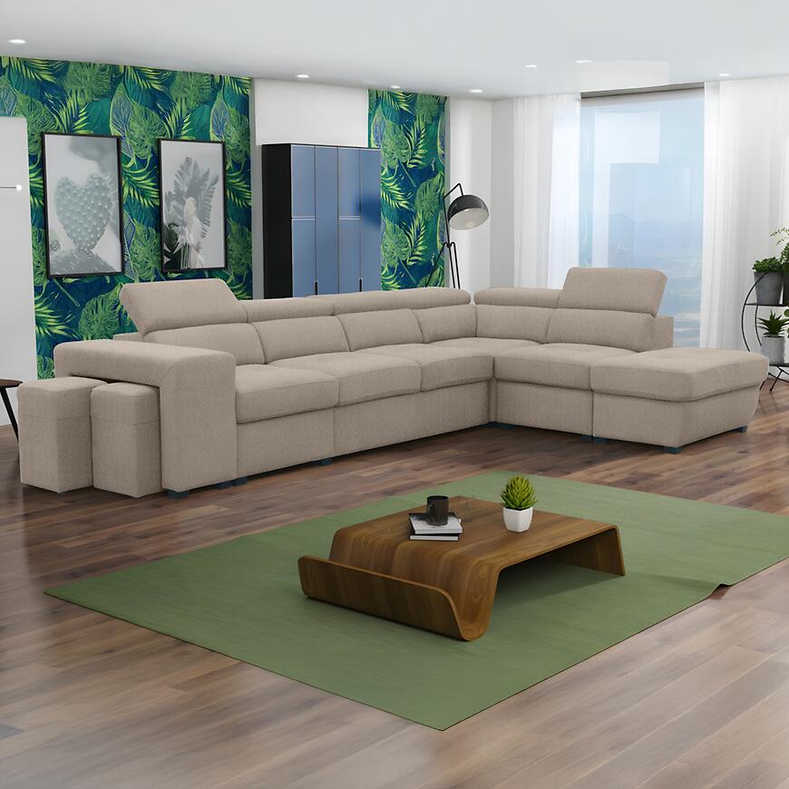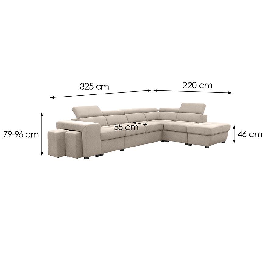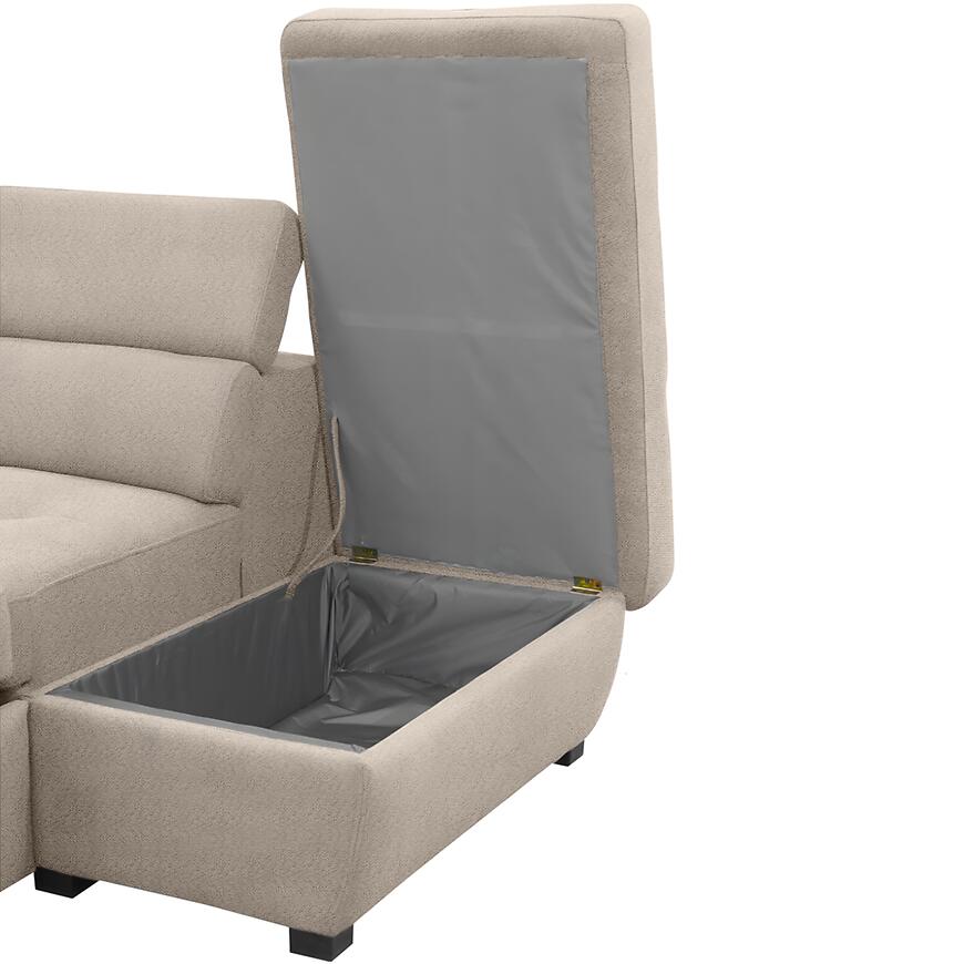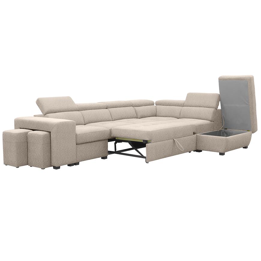 Narożnik Positano 2XPUFA+B+1+2F+R+1+OTM Antology 02 BE łączy nowoczesny design z funkcjonalnością. Mebel w kształcie litery L o wymiarach 325x220 cm wyposażono w komfortowe siedzisko z wypełnieniem sprężyną bonell i sprężyną falistą oraz regulowane zagłówki. Narożnik posiada praktyczną funkcję spania o powierzchni 184x125 cm, mechanizm rozkładania delfin oraz pojemny pojemnik na pościel. W zestawie znajduje się również pufa, a całość wspierają stabilne czarne nogi. Tapicerka w kolorze beżowym z trwałej tkaniny nadaje elegancji, a modułowa konstrukcja umożliwia dopasowanie narożnika do wnętrza.
