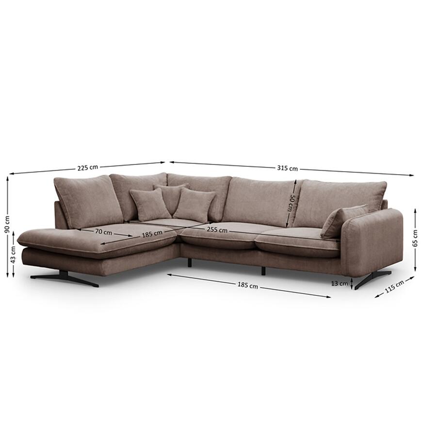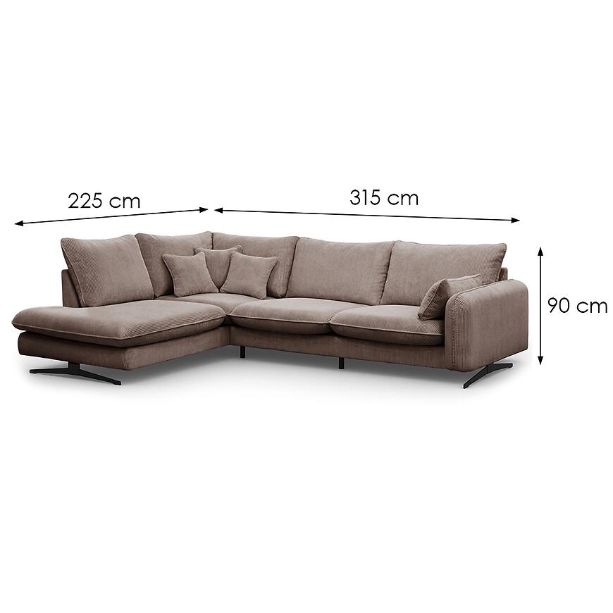 Model Prince L to narożnik w kształcie litery L, który zapewnia dużą powierzchnię do siedzenia. Wymiary mebla – 315 cm szerokości, 225 cm głębokości oraz 90 cm wysokości – czynią go doskonałym wyborem do większych pomieszczeń, gdzie może pełnić funkcję centralnego punktu strefy wypoczynkowej.