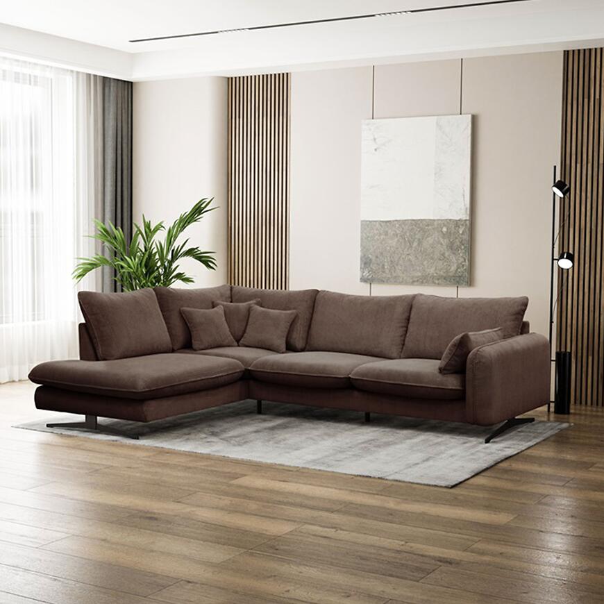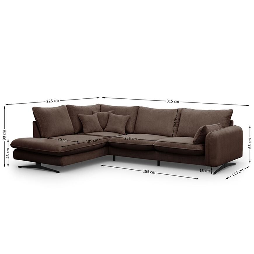 Narożnik Prince L lewostronny w kolorze brązowym to propozycja dla osób, które poszukują dużego narożnika do salonu, łączącego wygodę codziennego użytkowania z estetyką dopasowaną do nowoczesnych i klasycznych wnętrz. Konstrukcja w kształcie litery L oraz lewa orientacja sprawiają, że mebel doskonale porządkuje przestrzeń wypoczynkową, oferując dużo miejsca do siedzenia dla domowników i gości. Szerokość 315 cm oraz głębokość 225 cm czynią z tego modelu narożnik duży, przeznaczony do przestronnych pomieszczeń, w których liczy się zarówno komfort, jak i wyrazisty wygląd strefy relaksu. Wysokość całkowita 90 cm pozwala na wygodne oparcie pleców i stabilne podparcie podczas dłuższego odpoczynku.