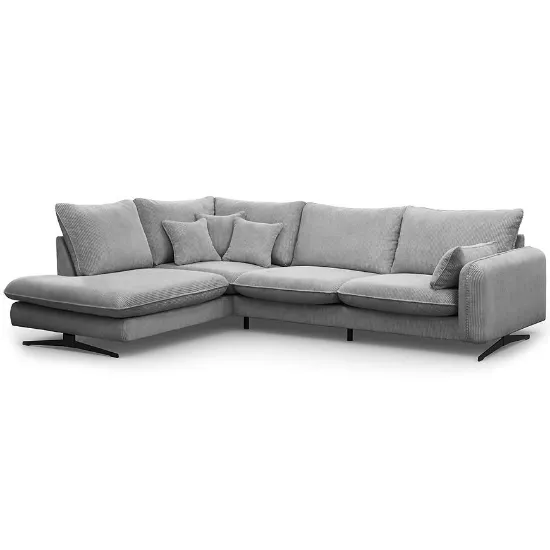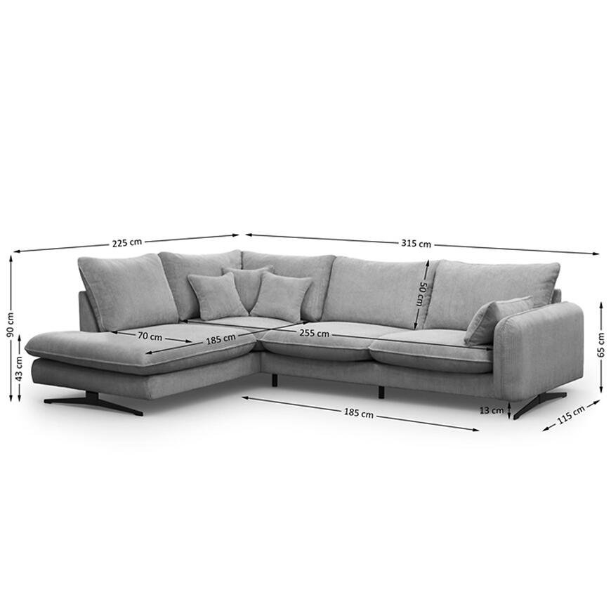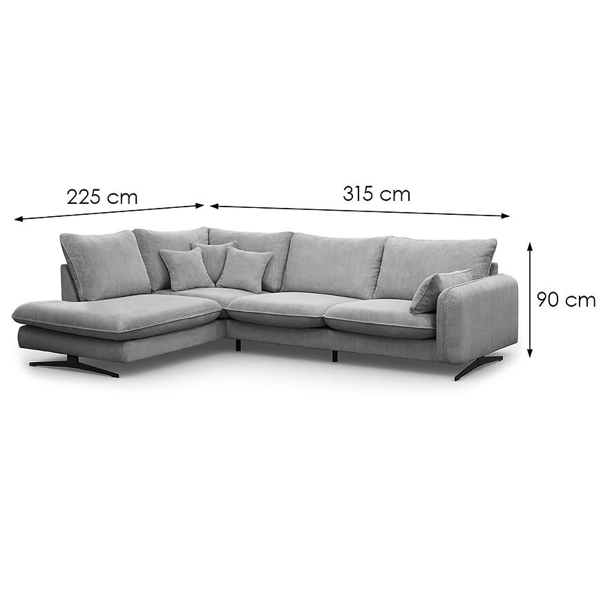 Narożnik Prince L lewostronny w kolorze jasny szary to propozycja dla osób, które poszukują dużego narożnika do salonu, łączącego wygodę codziennego użytkowania z estetyką dopasowaną do nowoczesnych i klasycznych wnętrz. Konstrukcja w kształcie litery L oraz lewa orientacja sprawiają, że mebel doskonale porządkuje przestrzeń wypoczynkową, oferując dużo miejsca do siedzenia dla domowników i gości. Szerokość 315 cm oraz głębokość 225 cm czynią z tego modelu narożnik duży, przeznaczony do przestronnych pomieszczeń, w których liczy się zarówno komfort, jak i wyrazisty wygląd strefy relaksu. Wysokość całkowita 90 cm pozwala na wygodne oparcie pleców i stabilne podparcie podczas dłuższego odpoczynku.