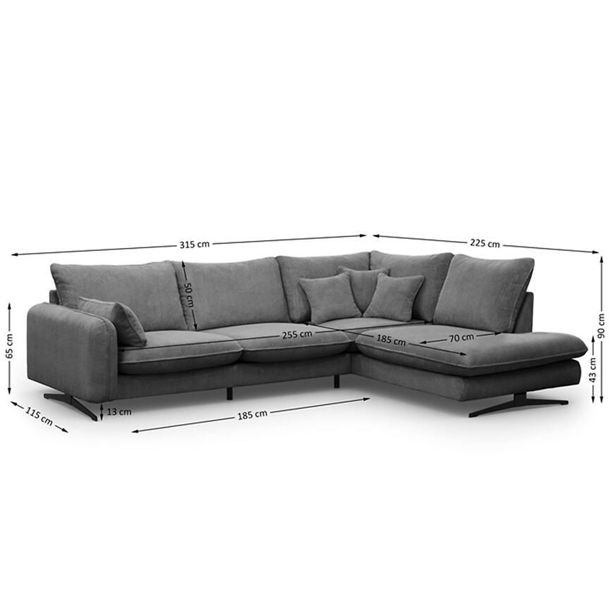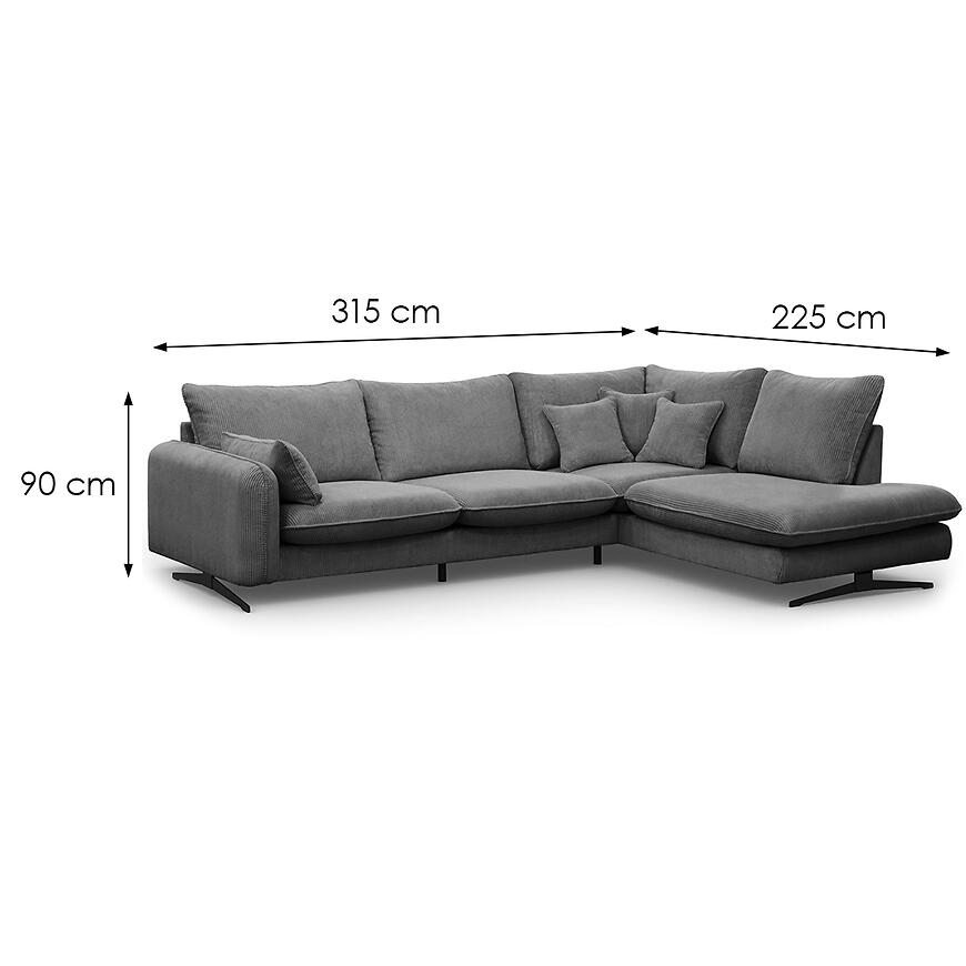 Narożnik Prince L prawostronny w kolorze szarym to propozycja dla osób, które poszukują dużego narożnika do salonu, łączącego wygodę codziennego użytkowania z estetyką dopasowaną do nowoczesnych i klasycznych wnętrz. Konstrukcja w kształcie litery L oraz prawa orientacja sprawiają, że mebel doskonale porządkuje przestrzeń wypoczynkową, oferując dużo miejsca do siedzenia dla domowników i gości. Szerokość 315 cm oraz głębokość 225 cm czynią z tego modelu narożnik duży, przeznaczony do przestronnych pomieszczeń, w których liczy się zarówno komfort, jak i wyrazisty wygląd strefy relaksu. Wysokość całkowita 90 cm pozwala na wygodne oparcie pleców i stabilne podparcie podczas dłuższego odpoczynku.