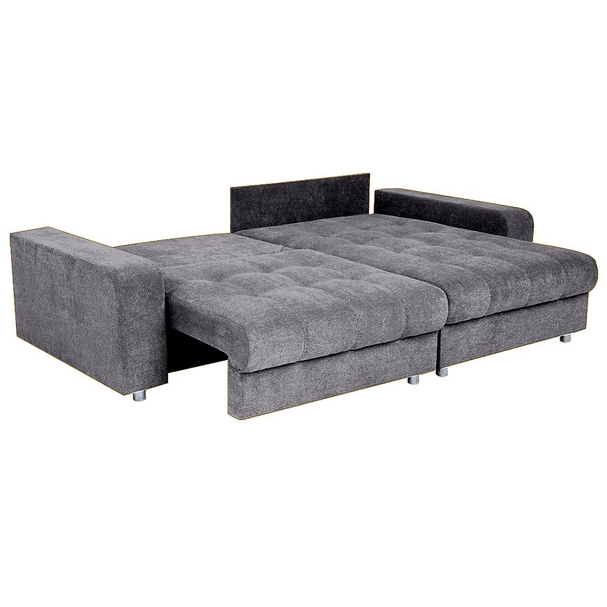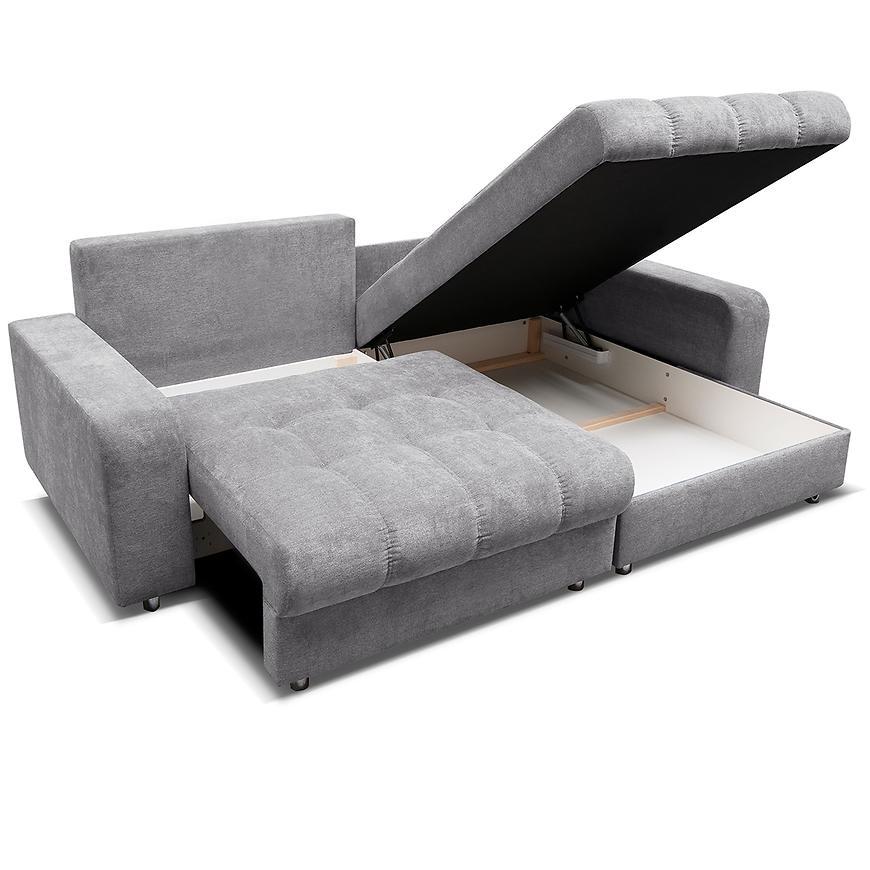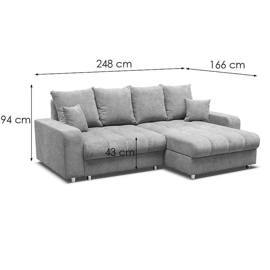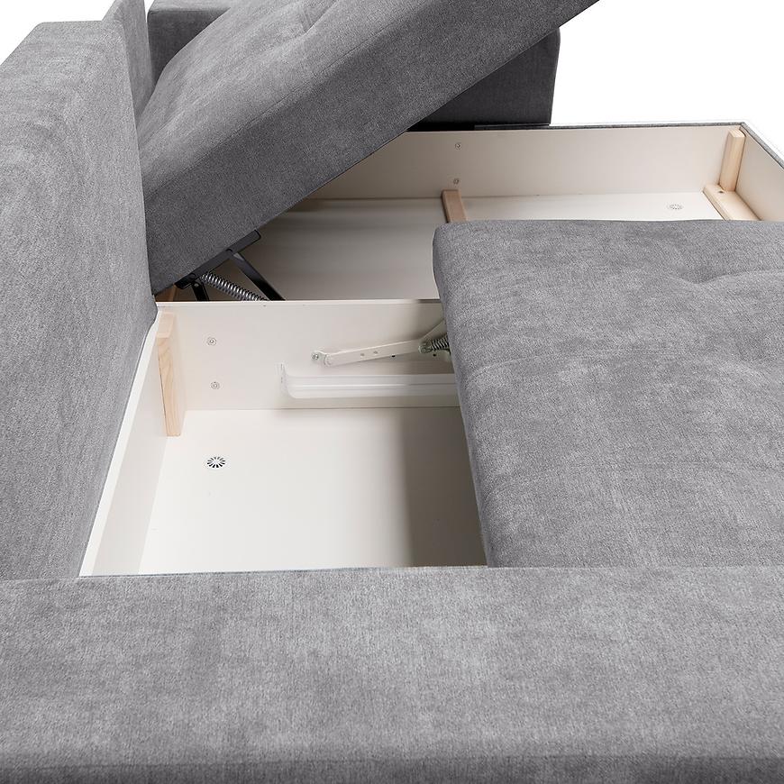 Tapicerka z miękkiej tkaniny gwarantuje przyjemne w dotyku siedzenie. Wypełnienie siedziska sprężyną falistą zapewnia wygodę i trwałość przez wiele lat. To mebel, który nie tylko dobrze wygląda, ale także jest przyjazny dla Twojego ciała. Narożnik Rodos jest wyposażony w funkcję spania, co czyni go doskonałym rozwiązaniem, gdy przyjmujesz gości, po rozłożeniu to okazjonalne miejsce do spania 158x203 cm. Dodatkowym atutem jest schowek na pościel oraz dwa pojemniki na pościel. To idealne miejsce do przechowywania pościeli i innych rzeczy, co pozwoli na utrzymanie porządku w salonie. Narożnik jest wyposażony w srebrne nogi, które dodają mu elegancji i stabilności. Jego nowoczesny design sprawia, że idealnie wpasuje się w różne aranżacje wnętrz.