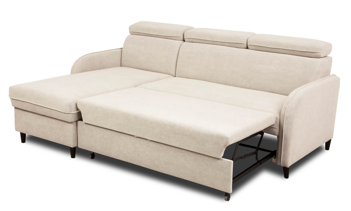 Jednym z głównych atutów narożnika Boho jest jego funkcja spania. Dzięki mechanizmowi rozkładania typu Delfin, przekształcenie narożnika w łóżko jest niezwykle proste i szybkie. Po rozłożeniu narożnika otrzymujemy wygodną powierzchnię spania o wymiarach 125x195 cm, co zapewnia komfortowy sen dla jednej lub dwóch osób. Dodatkowym atutem jest to, że funkcja spania jest tapicerowana tkaniną Curio, co gwarantuje przyjemne doznania podczas użytkowania.