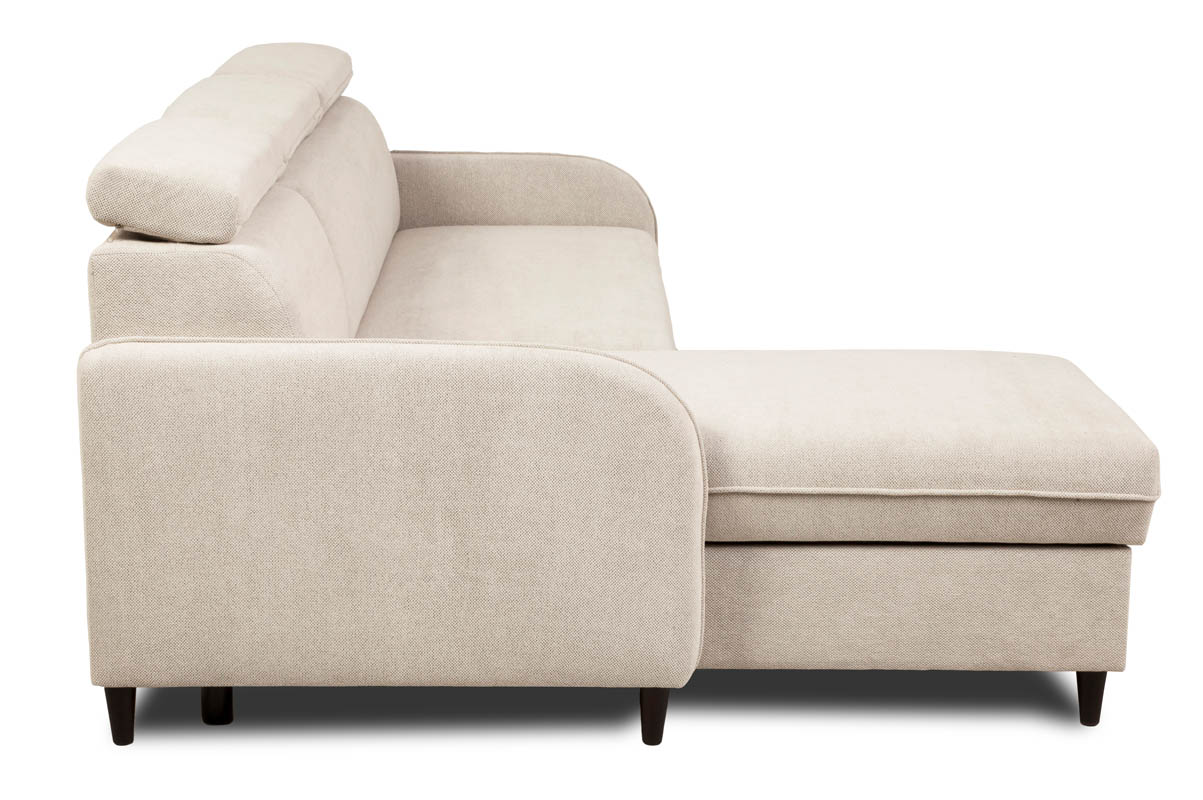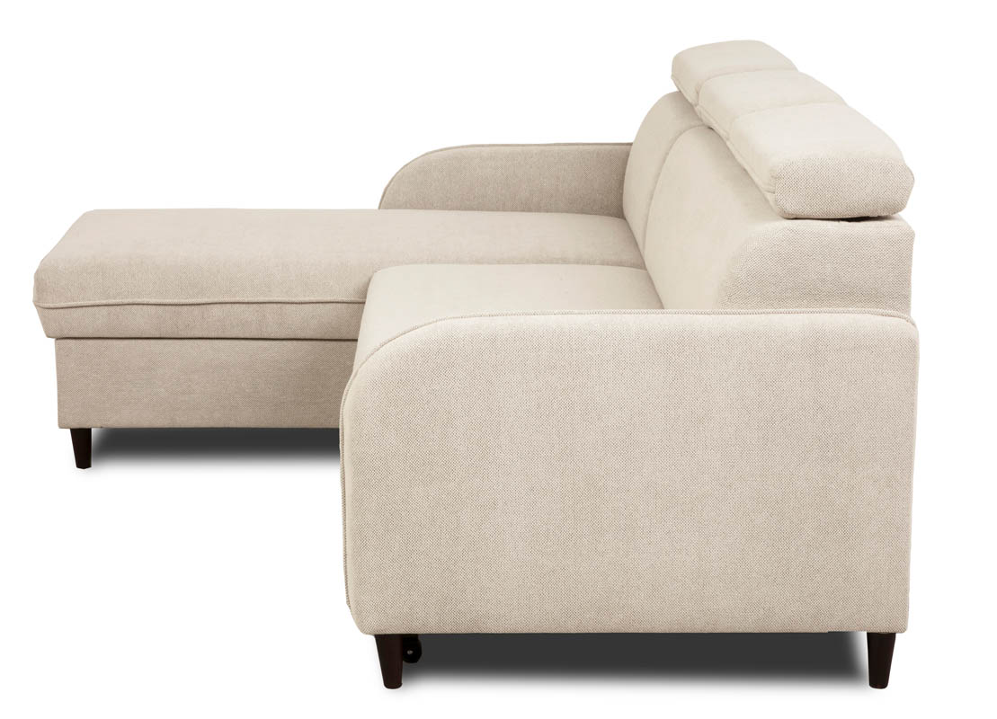 Nóżki narożnika wykonane są z drewna w kolorze wenge, co dodaje elegancji i stabilności całej konstrukcji. Mebel został wykonany z tkaniny Curio w kolorze beżowym, która jest nie tylko przyjemna w dotyku, ale także trwała i łatwa w utrzymaniu czystości. Dodatkowym elementem dekoracyjnym są ozdobne lamówki na siedzisku i bokach, które nadają narożnikowi wyjątkowego charakteru i stylu.
