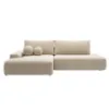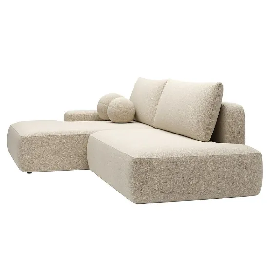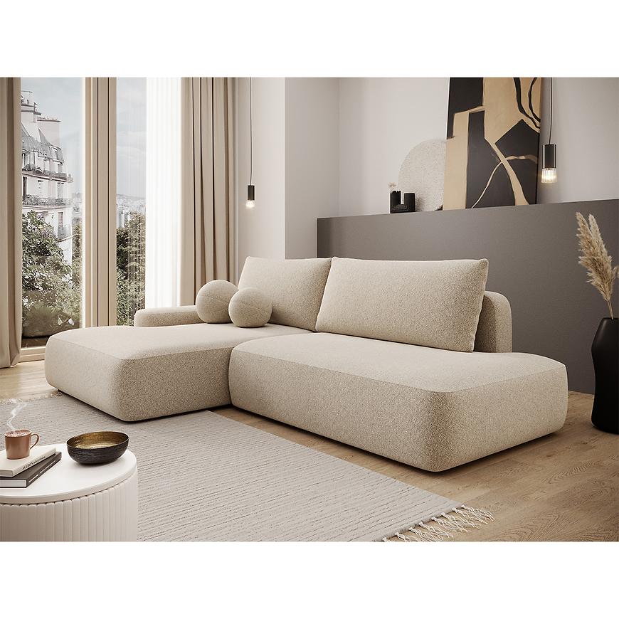 Tapicerowany przyjemną w dotyku tkaniną Raven 22 w eleganckim, kremowym odcieniu, narożnik Bouli O świetnie odnajdzie się w jasnych, przestronnych aranżacjach, a także ociepli bardziej nowoczesne lub minimalistyczne wnętrza. Dzięki możliwości wyboru wersji prawej lub lewej, mebel można dopasować do układu niemal każdego pomieszczenia.