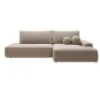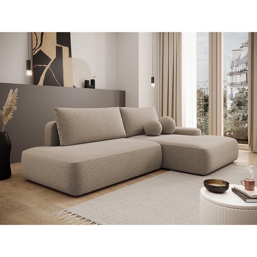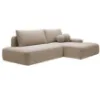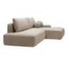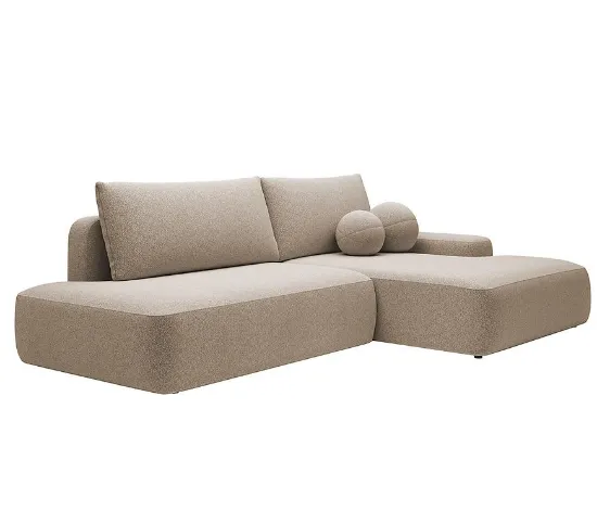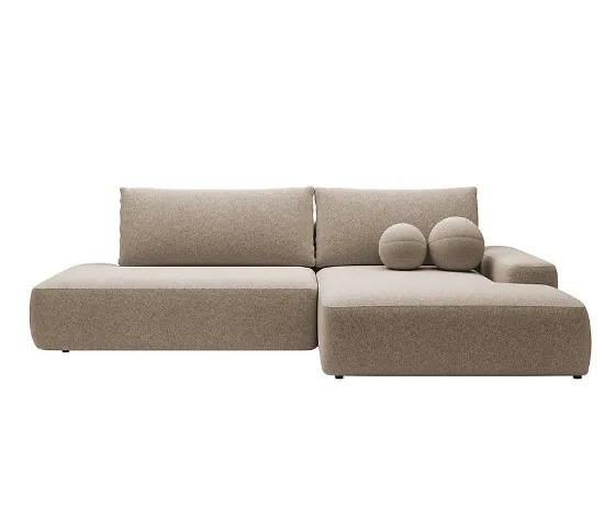 Mebel tapicerowany jest tkaniną Raven 30 w głębokim, brązowym odcieniu, który wprowadza do wnętrza ciepło i przytulność. Narożnik występuje w wersji prawej lub lewej, co pozwala dopasować go idealnie do układu pomieszczenia. Jego kształt litery L doskonale wypełnia przestrzeń, oferując miejsce zarówno do siedzenia, jak i relaksu w pozycji leżącej.