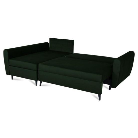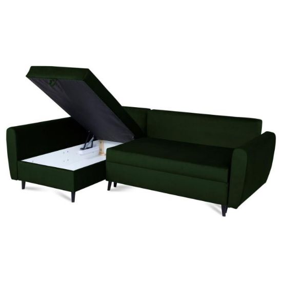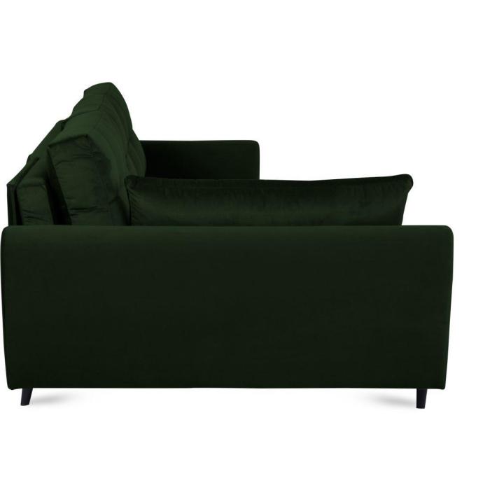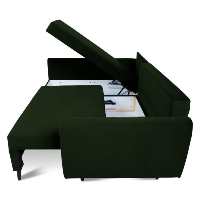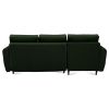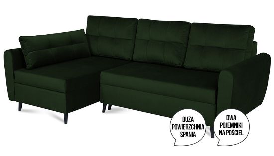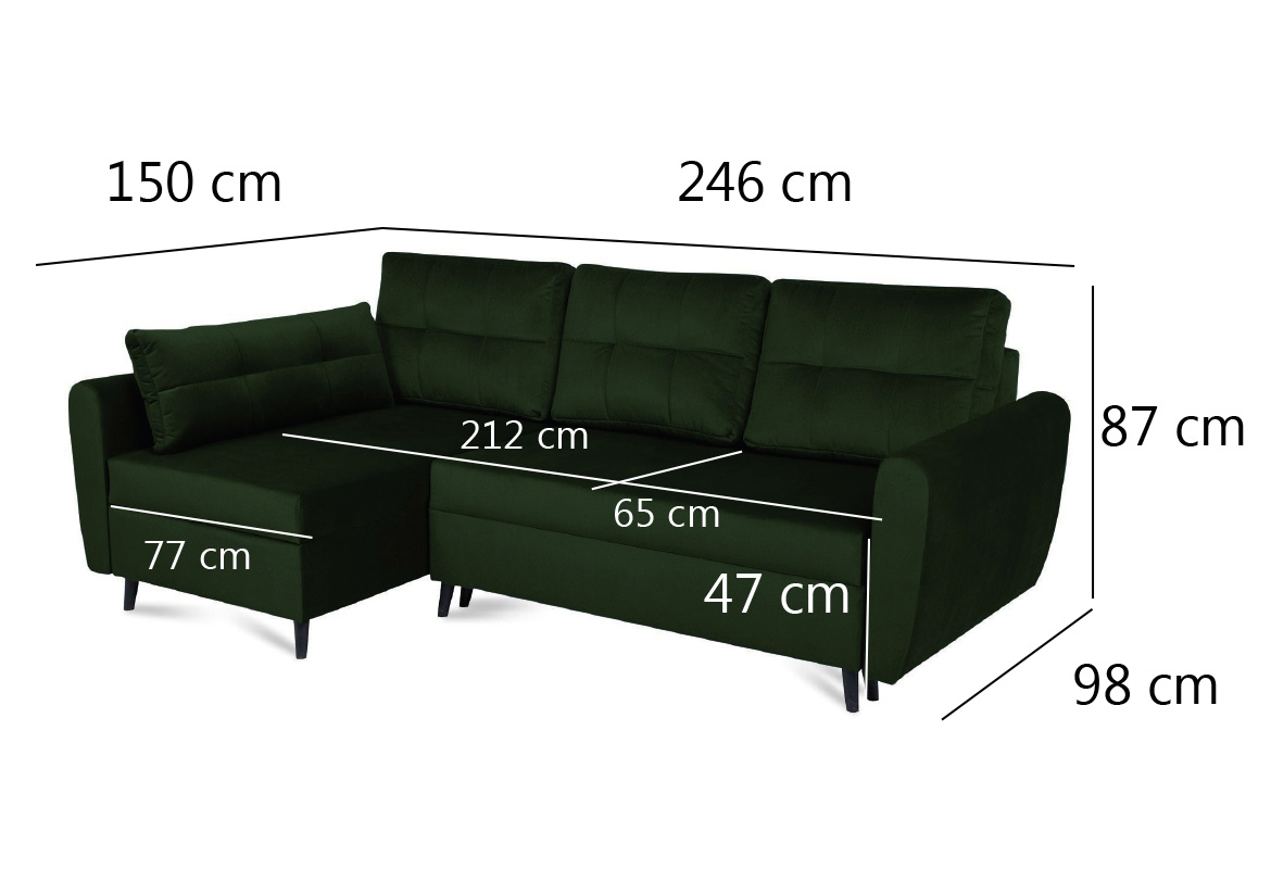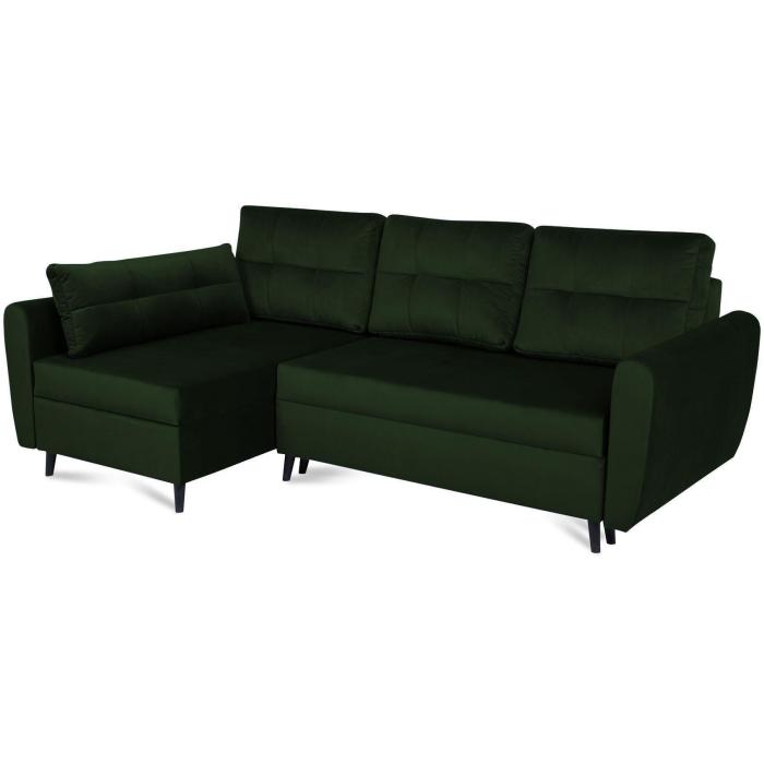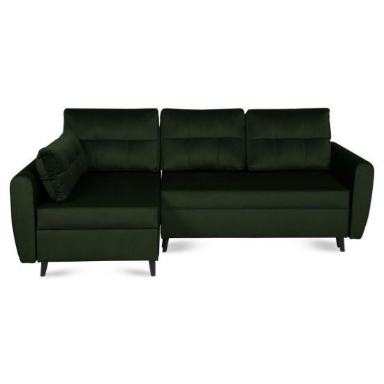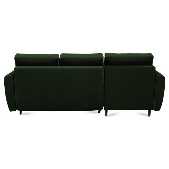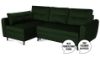 Tapicerka narożnika wykonana jest z przyjemnej w dotyku tkaniny Kronos w kolorze ciemnej zieleni. Elegancka i prosta forma narożnika oraz kształt litery L sprawiają, że wypoczynek będzie idealnym dopełnieniem wnętrza w każdym stylu. Wygodne poduszki oparciowe oraz podłokietniki nie tylko stanowią element dekoracyjny, ale poprawiają jakość wypoczynku.