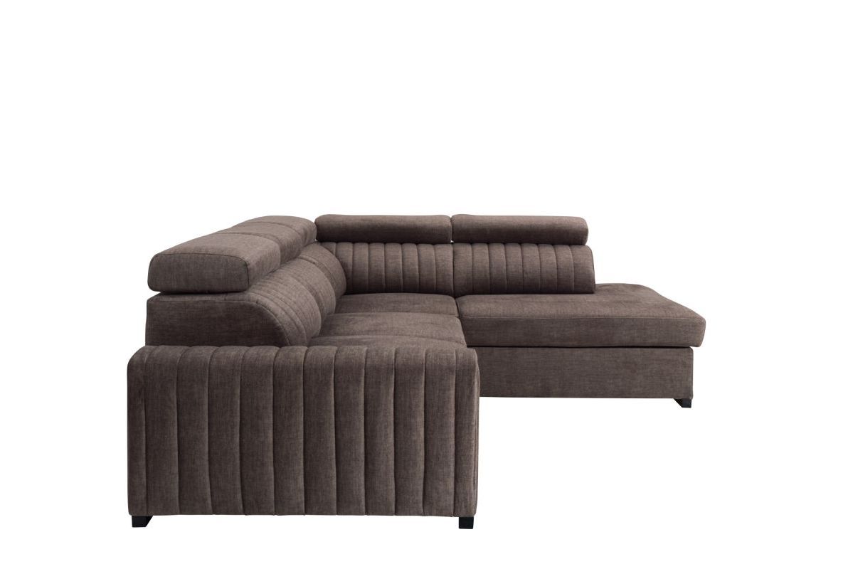 Narożnik Leny został wykonany z tkaniny Vogue w ciepłym brązowym kolorze, nadając mu elegancki i nowoczesny wygląd. Ozdobne przeszycia na oparciu oraz bokach dodają meblowi wyjątkowego charakteru, sprawiając, że staje się on centralnym punktem aranżacji salonu.