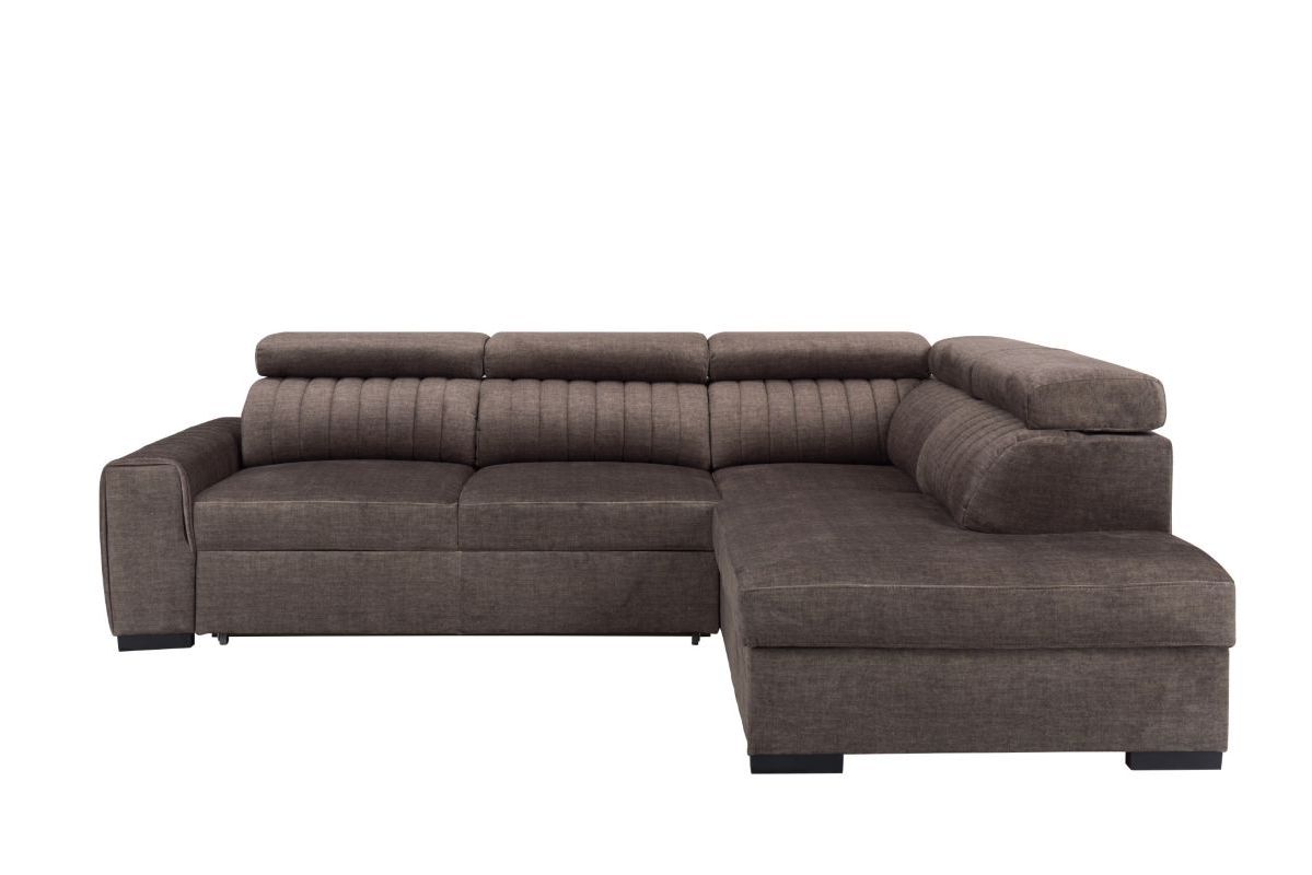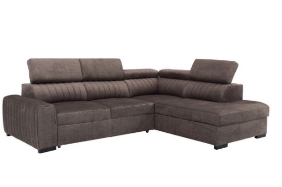 Narożnik Leny został wykonany z tkaniny Vogue w ciepłym brązowym kolorze, nadając mu elegancki i nowoczesny wygląd. Ozdobne przeszycia na oparciu oraz bokach dodają meblowi wyjątkowego charakteru, sprawiając, że staje się on centralnym punktem aranżacji salonu.