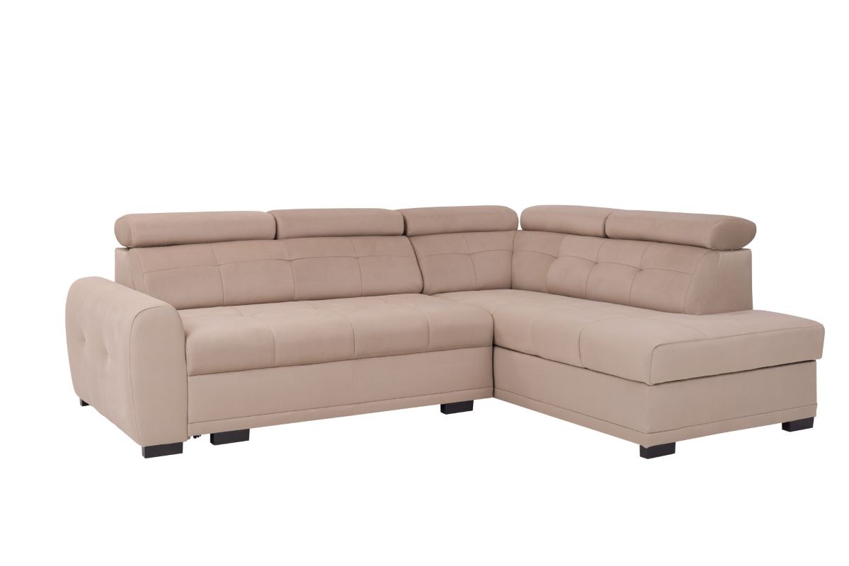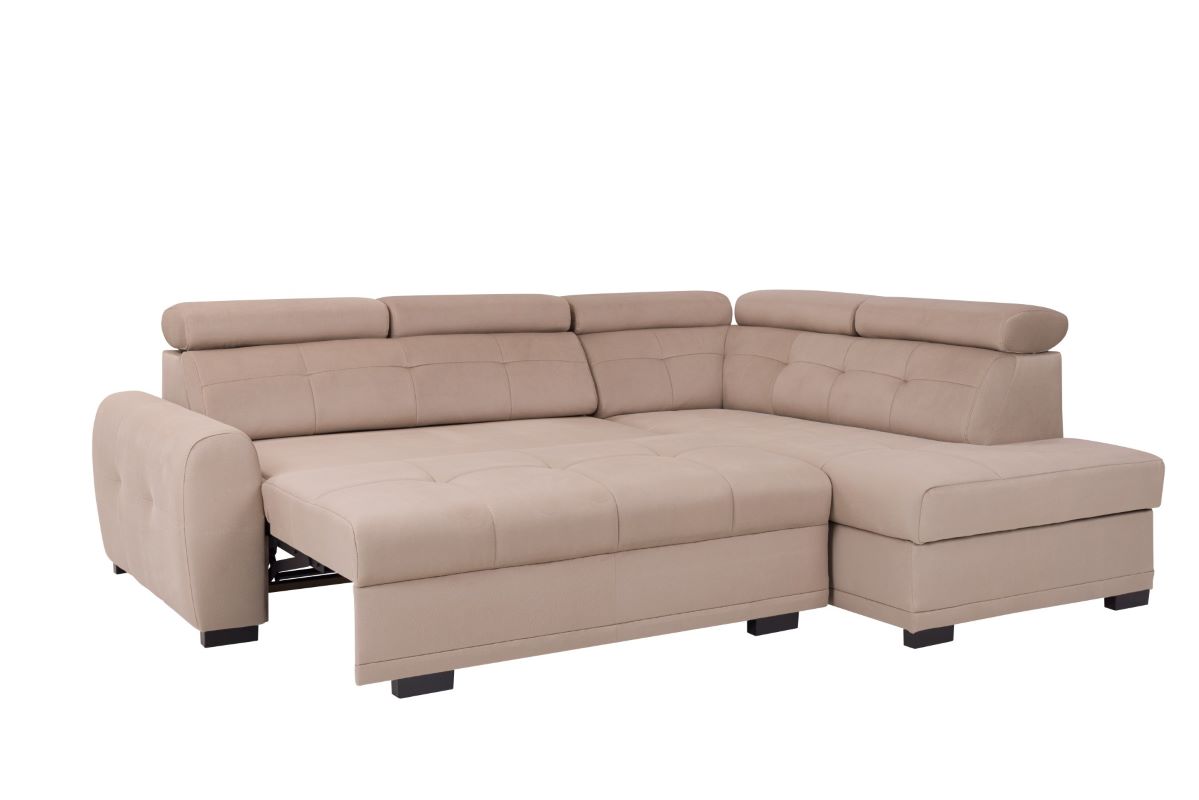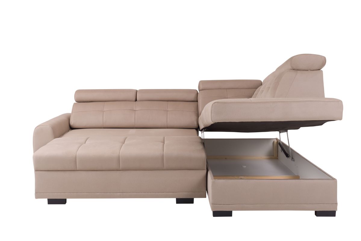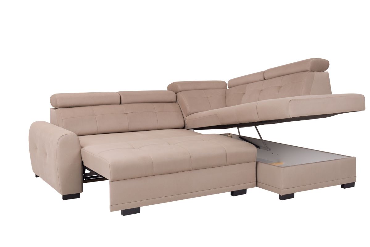 Dodatkowym atutem narożnika Loris jest praktyczny pojemnik na pościel, umieszczony wewnątrz mebla. To idealne rozwiązanie dla tych, którzy pragną zachować porządek w pomieszczeniu i mieć zawsze pod ręką świeżą pościel. Pojemnik jest łatwo dostępny i pomieści niezbędne akcesoria do spania.