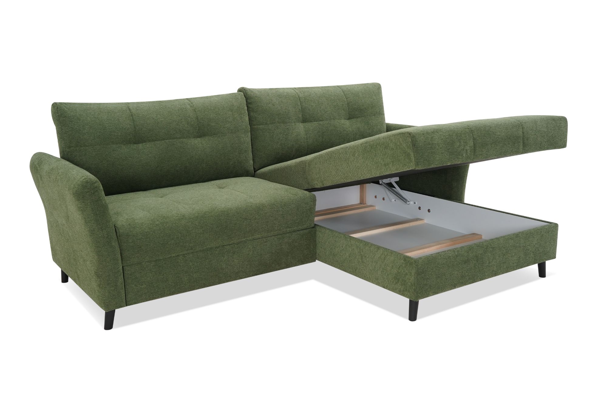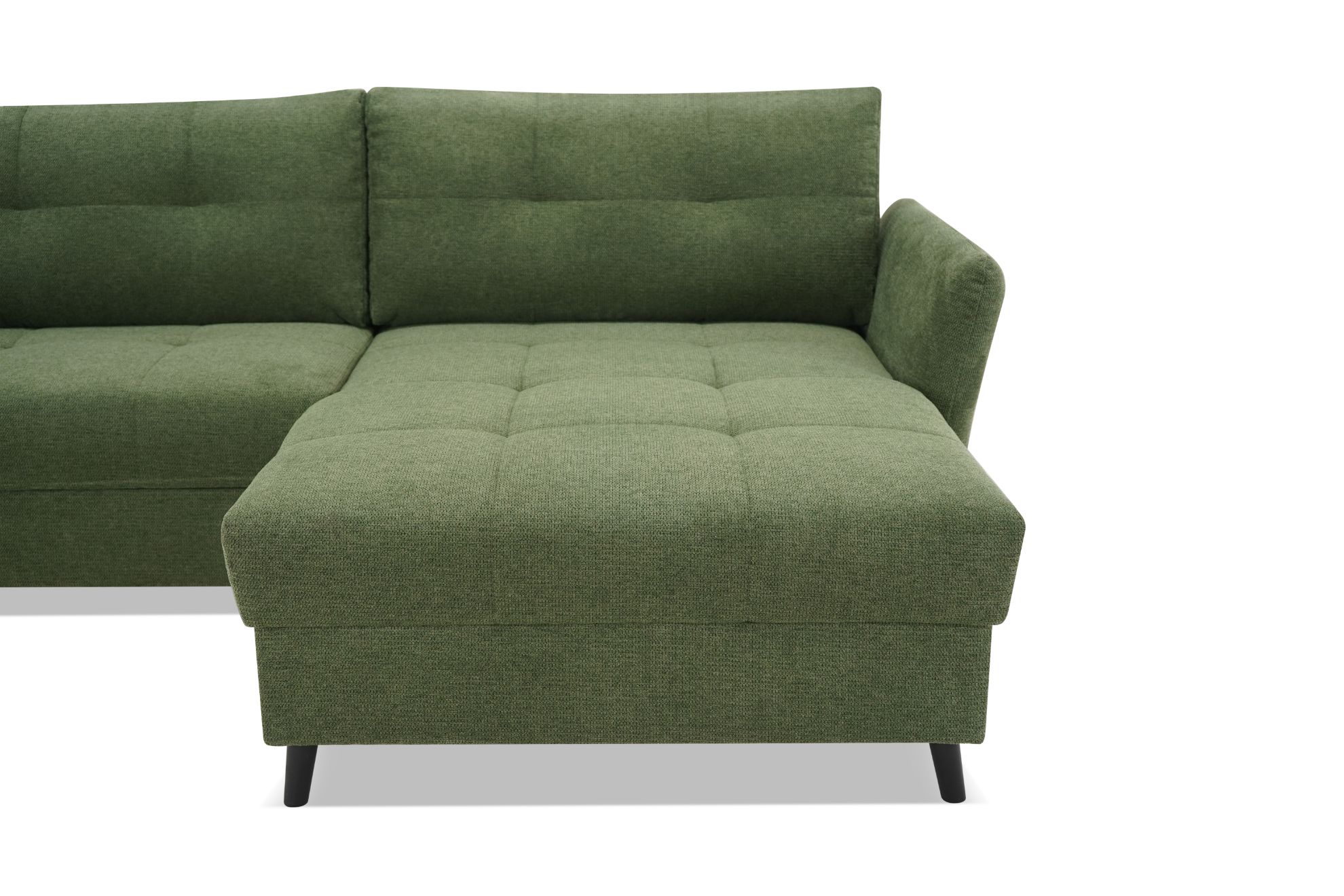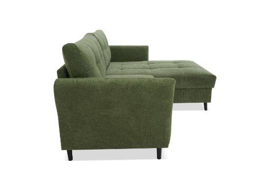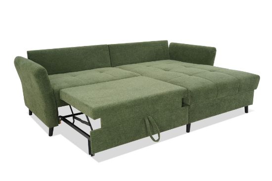 Narożnik Sandro to nie tylko doskonałe miejsce do odpoczynku, ale także funkcjonalne łóżko dzięki wbudowanej funkcji spania. System rozkładania Delfin sprawia, że zmiana z sofy na łóżko jest szybka i łatwa. Dodatkowo, pojemnik na pościel umożliwia przechowywanie dodatkowych kołder czy poduszek, zachowując porządek w salonie.