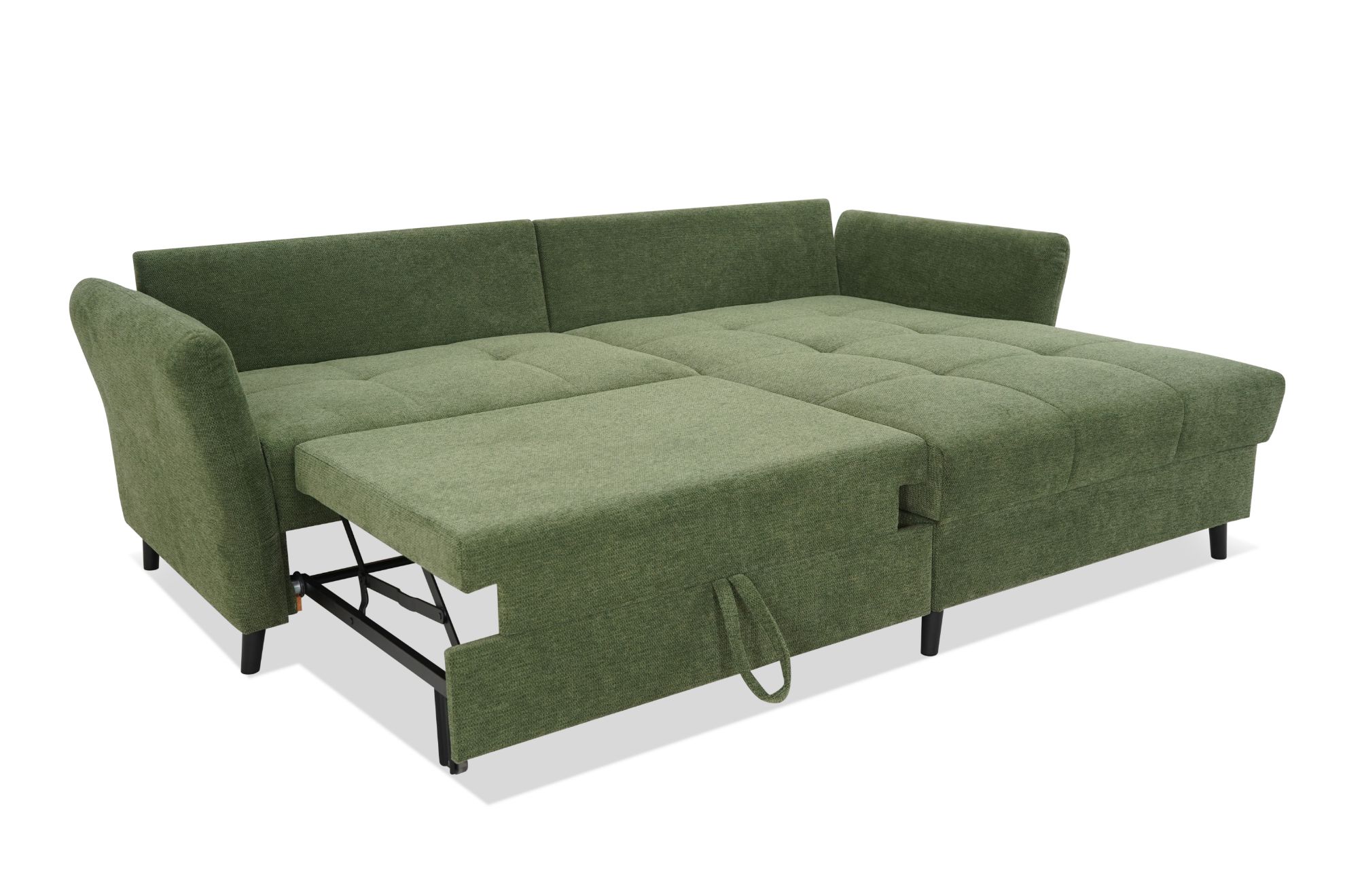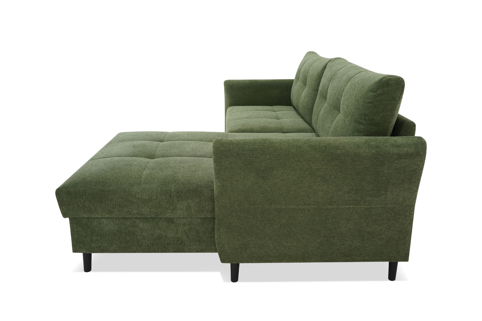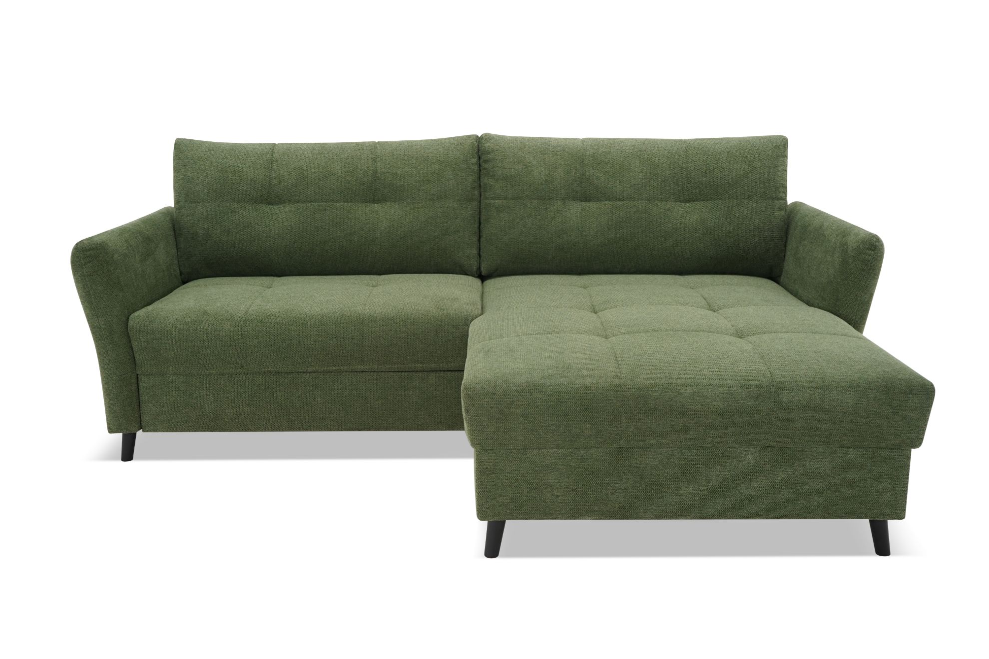 Narożnik Sandro to nie tylko doskonałe miejsce do odpoczynku, ale także funkcjonalne łóżko dzięki wbudowanej funkcji spania. System rozkładania Delfin sprawia, że zmiana z sofy na łóżko jest szybka i łatwa. Dodatkowo, pojemnik na pościel umożliwia przechowywanie dodatkowych kołder czy poduszek, zachowując porządek w salonie.