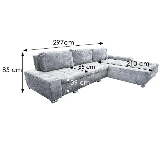 Duża powierzchnia spania 255x150 cm oraz sposób rozkładania DL z automatem sprawiają, że Toscania Vega 13 doskonale sprawdza się jako mebel do spania codziennego lub okazjonalnego. Praktyczny pojemnik na pościel pomaga w organizacji i przechowywaniu dodatkowych tekstyliów, co zwiększa funkcjonalność mebla. Mimo swojej dużej szerokości 297 cm i głębokości 210 cm, narożnik prezentuje się lekko i nowocześnie, również dzięki chromowanym nogom i prostym liniom.