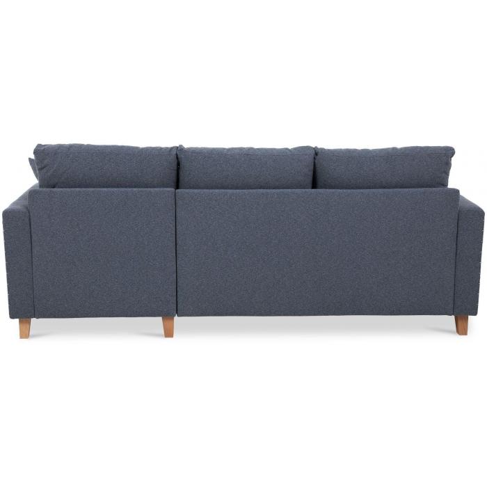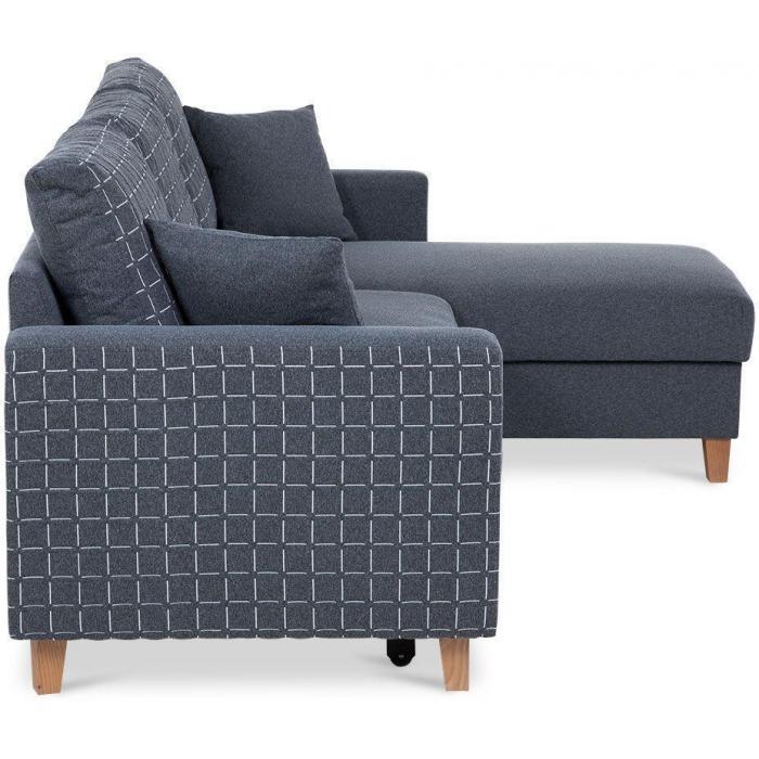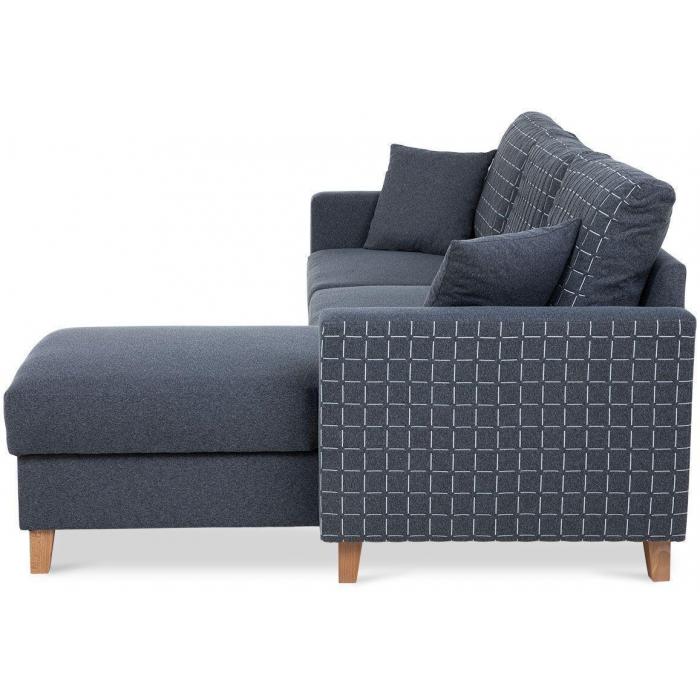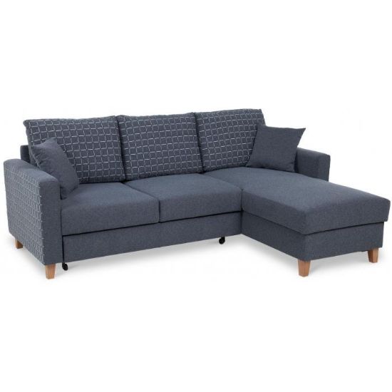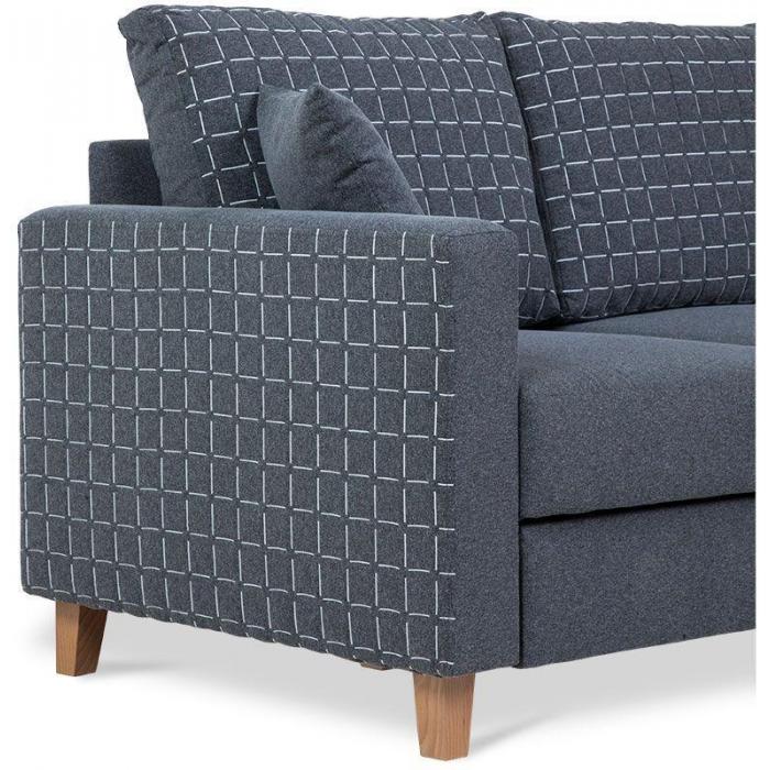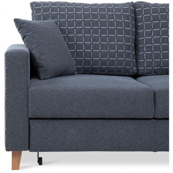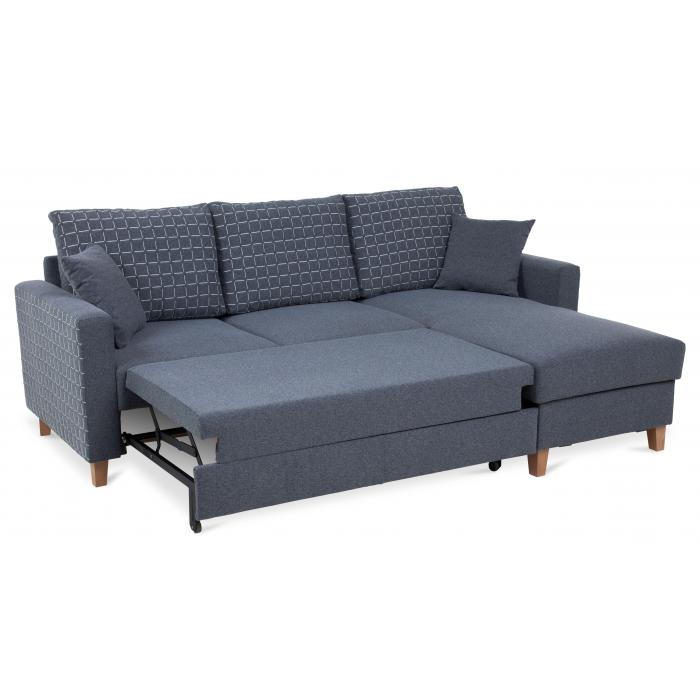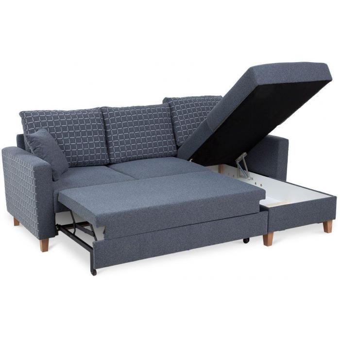 Sofa narożna posiada pojemnik na pościel, w którym zmieszczą się kołdry zachowując porządek w pomieszczeniu. Narożnik z funkcją spania wyposażony w sprężyny faliste oraz wygodne oparcie zadowoli nawet najbardziej wymagających miłośników wielogodzinnych drzemek.