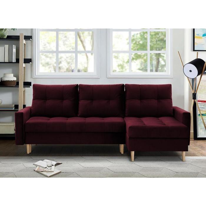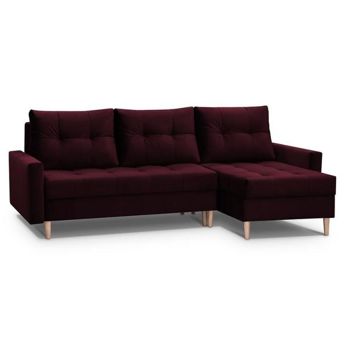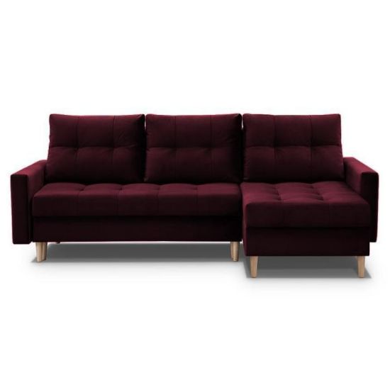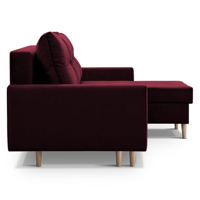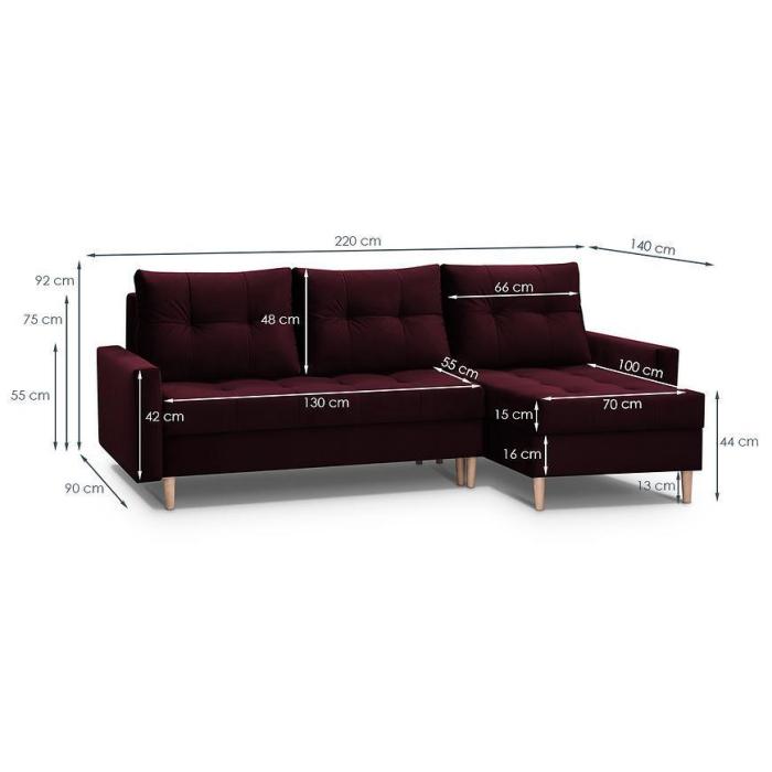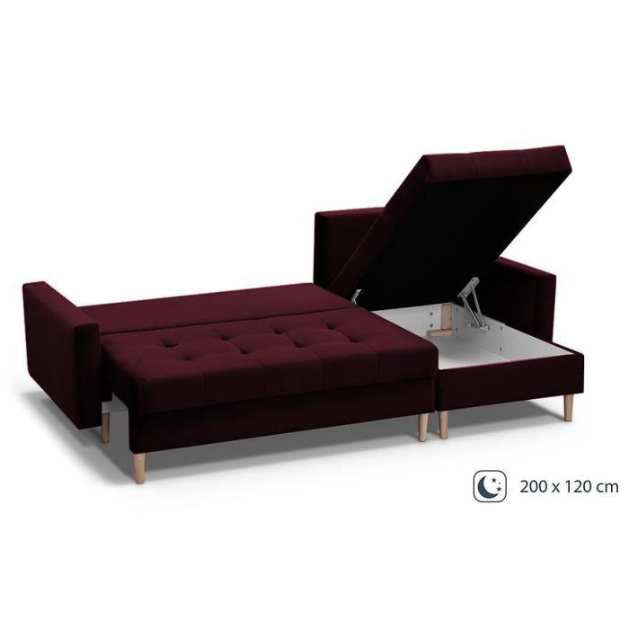 Narożnik Scandi z funkcją spania został pokryty tkaniną. Prostotę i łatwość użytkowania gwarantuje system rozkładania typu DL. Jest to szybki, prosty i wygodny sposób rozkładania. Jest jednym z najbardziej popularnych systemów rozkładania, który jest wykorzystywany w narożnikach. Po rozłożeniu powierzchnia spania wynosi 120x200 cm. Mebel posiada dwa pojemniki, do którego można schować pościel, dodatkowe koce czy też poduszki. W siedzisku zastosowano sprężynę bonell, która dostosowuje się do ciężaru i kształtu ciała, zapewniając tym samym wysoki komfort siedzenia. Ten niepowtarzalny mebel wypoczynkowy stworzono z myślą o funkcjonalności i eleganckim wyglądzie. Narożnik dostępny w wersji uniwersalnej.