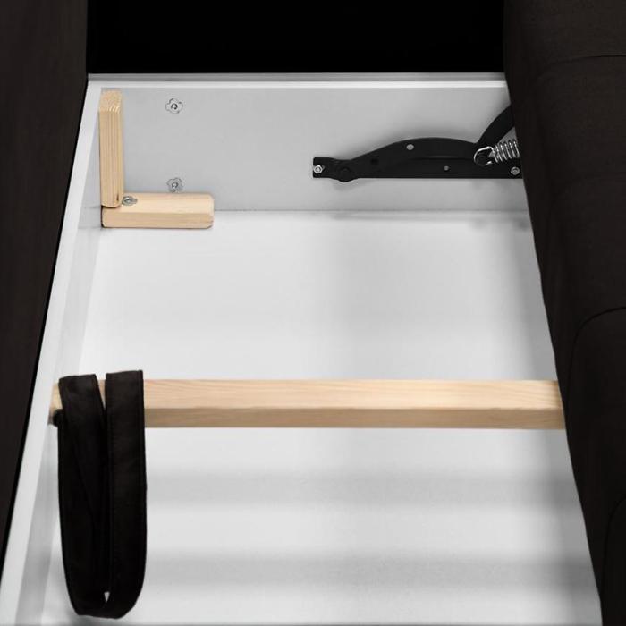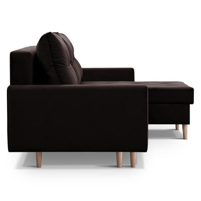 Narożnik Scandi z funkcją spania został pokryty tkaniną. Prostotę i łatwość użytkowania gwarantuje system rozkładania typu DL. Jest to szybki, prosty i wygodny sposób rozkładania. Jest jednym z najbardziej popularnych systemów rozkładania, który jest wykorzystywany w narożnikach. Po rozłożeniu powierzchnia spania wynosi 120x200 cm. Mebel posiada dwa pojemniki, do którego można schować pościel, dodatkowe koce czy też poduszki. W siedzisku zastosowano sprężynę bonell, która dostosowuje się do ciężaru i kształtu ciała, zapewniając tym samym wysoki komfort siedzenia. Ten niepowtarzalny mebel wypoczynkowy stworzono z myślą o funkcjonalności i eleganckim wyglądzie. Narożnik dostępny w wersji uniwersalnej.
