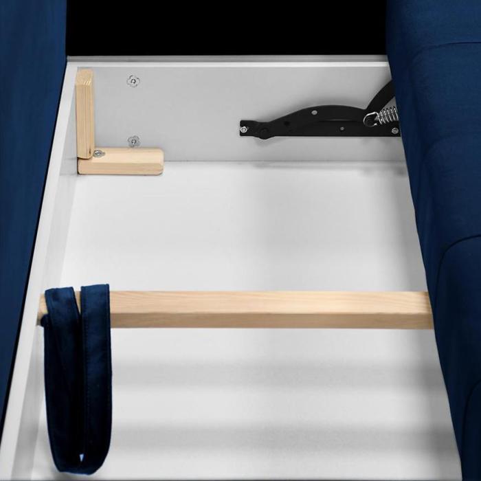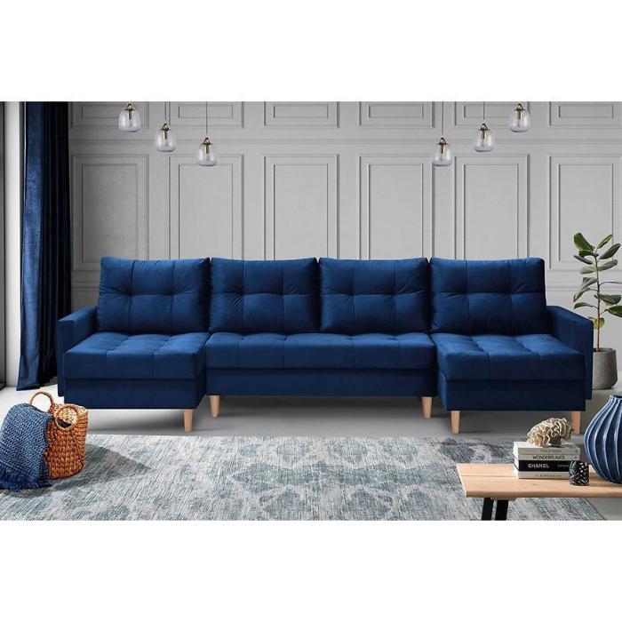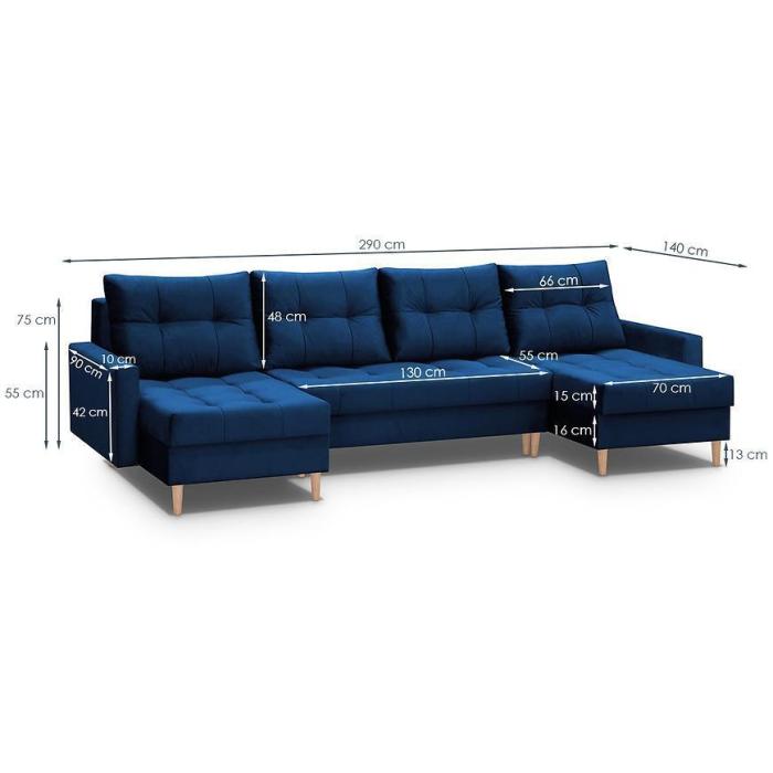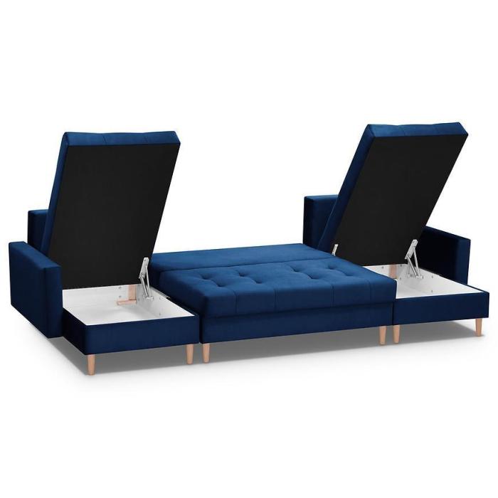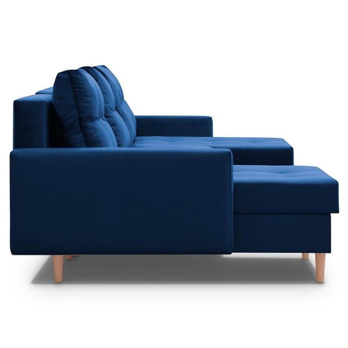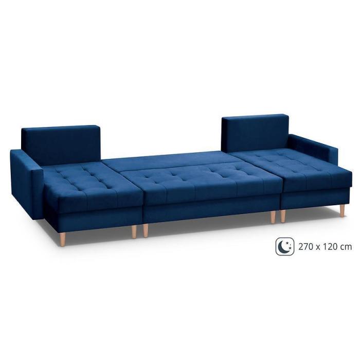 Narożnik Scandi z funkcją spania został pokryty tkaniną. Prostotę i łatwość użytkowania gwarantuje system rozkładania typu DL. Jest to szybki, prosty i wygodny sposób rozkładania. Jest jednym z najbardziej popularnych systemów rozkładania, który jest wykorzystywany w narożnikach. Po rozłożeniu powierzchnia spania wynosi 120x270 cm. Mebel posiada trzy pojemniki, do których można schować pościel, dodatkowe koce czy też poduszki. W siedzisku zastosowano sprężynę bonell, która dostosowuje się do ciężaru i kształtu ciała, zapewniając tym samym wysoki komfort siedzenia. Ten niepowtarzalny mebel wypoczynkowy stworzono z myślą o funkcjonalności i eleganckim wyglądzie. Narożnik dostępny w wersji uniwersalnej.