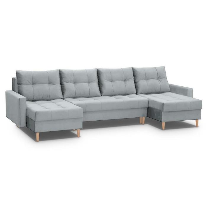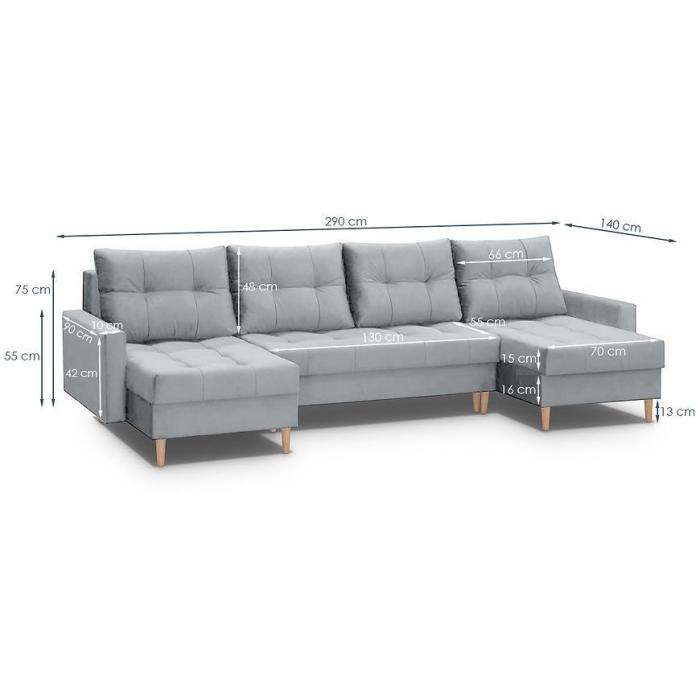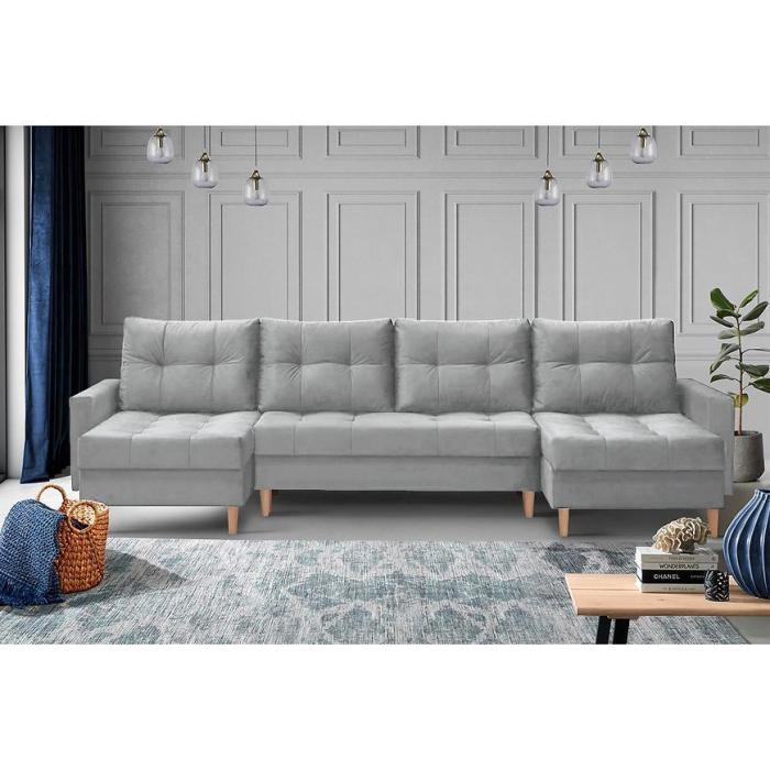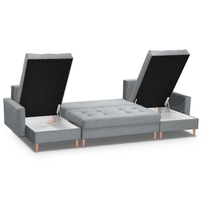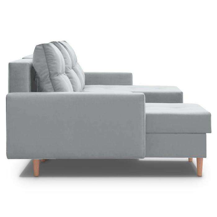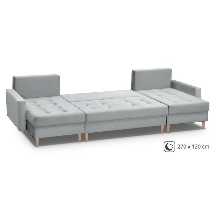 Narożnik Scandi z funkcją spania został pokryty tkaniną. Prostotę i łatwość użytkowania gwarantuje system rozkładania typu DL. Jest to szybki, prosty i wygodny sposób rozkładania. Jest jednym z najbardziej popularnych systemów rozkładania, który jest wykorzystywany w narożnikach. Po rozłożeniu powierzchnia spania wynosi 120x270 cm. Mebel posiada trzy pojemniki, do których można schować pościel, dodatkowe koce czy też poduszki. W siedzisku zastosowano sprężynę bonell, która dostosowuje się do ciężaru i kształtu ciała, zapewniając tym samym wysoki komfort siedzenia. Ten niepowtarzalny mebel wypoczynkowy stworzono z myślą o funkcjonalności i eleganckim wyglądzie. Narożnik dostępny w wersji uniwersalnej.