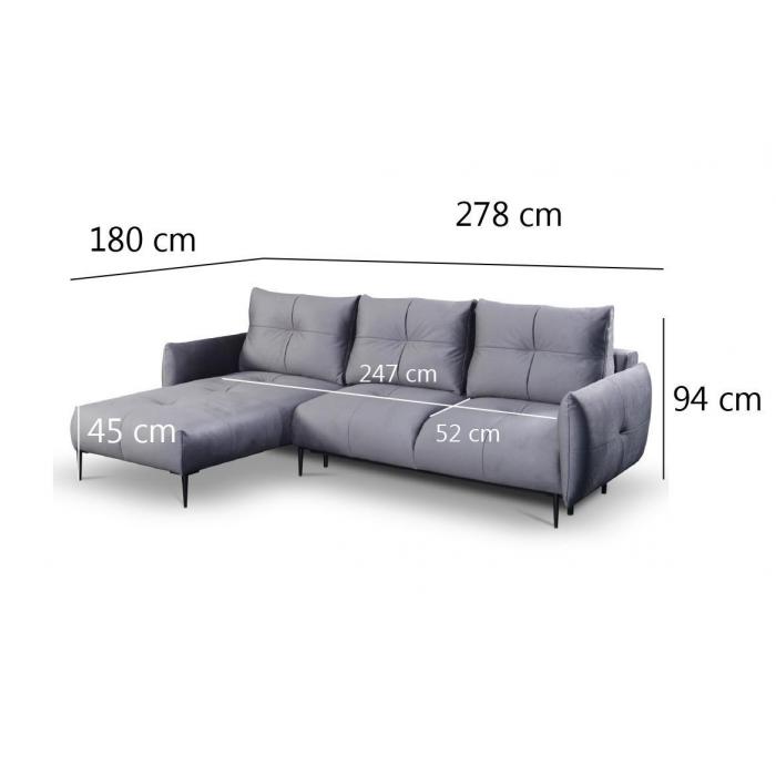 Sofa narożna Spezia to najbardziej praktyczny mebel, który będzie pasował do salonu, ale znajdzie swoje miejsce również w innym pomieszczeniu. Nowoczesne narożniki rozkładane to doskonały wybór na długie lata. Funkcja spania to szczególnie ważne i świetne rozwiązanie, które zapewni miejsce snu w komfortowych warunkach. Powierzchnia spania wynosi 125x247cm. Spezia posiada jeden pojemnik na pościel, a system rozkładania typu DL to szybki, prosty i wygodny sposób rozkładania. Głębokość siedziska z poduchą oparciową wynosi 52cm, a bez poduchy 79cm.