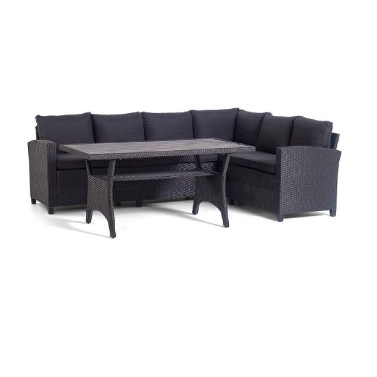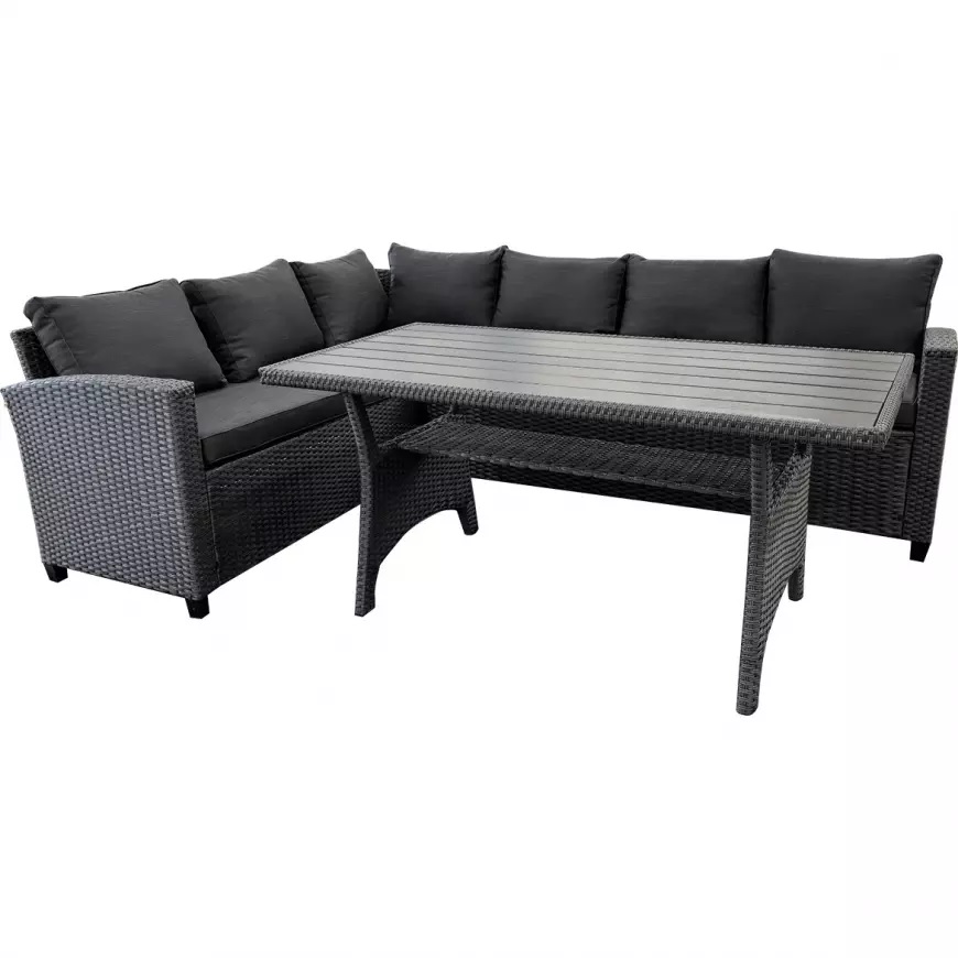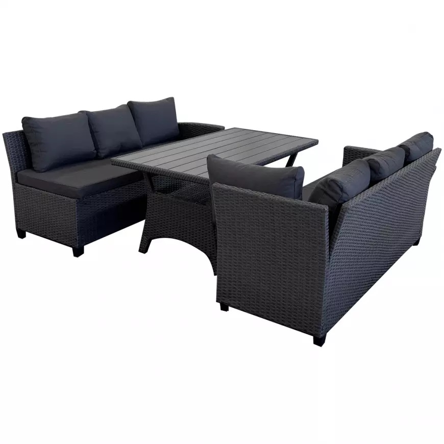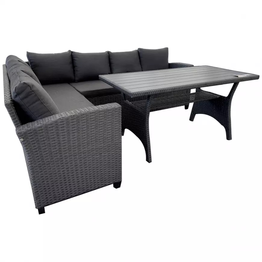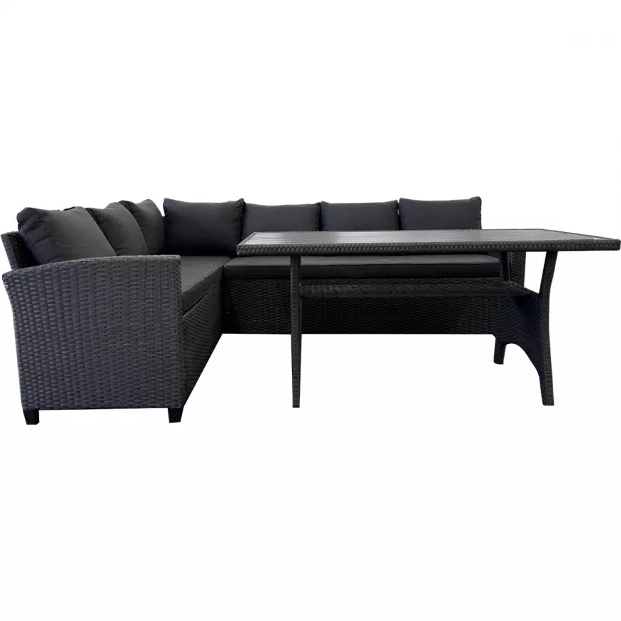Narożnik technorattanowy Stanso w kolorze czarnym z wysokim stołem obiadowym to połączenie funkcjonalności, nowoczesnego designu i trwałych materiałów, stworzone z myślą o Twoim komforcie.