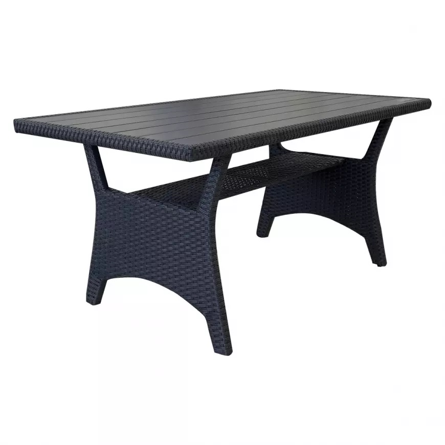 W skład zestawu wchodzi również wysoki stół obiadowy o wymiarach 144 x 74 x 67 cm. Jego blat wykonany z odpornego polywood, tworzywa sztucznego imitującego drewno, sprawia, że stół jest łatwy w utrzymaniu czystości i odporny na zarysowania. Idealne miejsce do spożywania posiłków na świeżym powietrzu czy organizowania letnich spotkań.