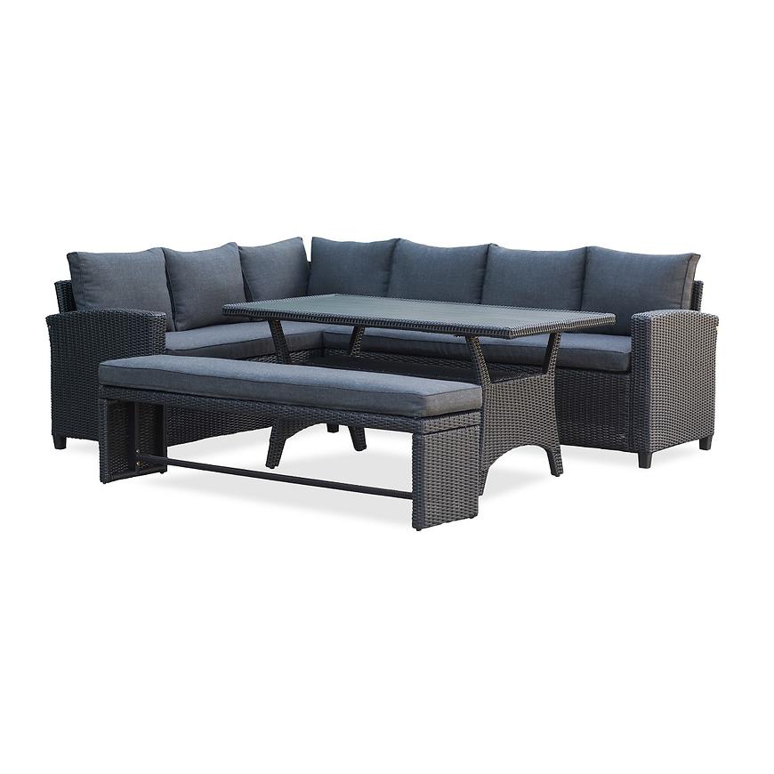 Grube, wygodne poduszki w kolorze grafitu, w komplecie z narożnikiem i ławką, zapewniają nie tylko komfort podczas siedzenia, ale także relaks i przyjemność spędzania czasu na świeżym powietrzu. Poszewki poduszek są zdejmowane i można je prać w niskich temperaturach, co ułatwia utrzymanie czystości.