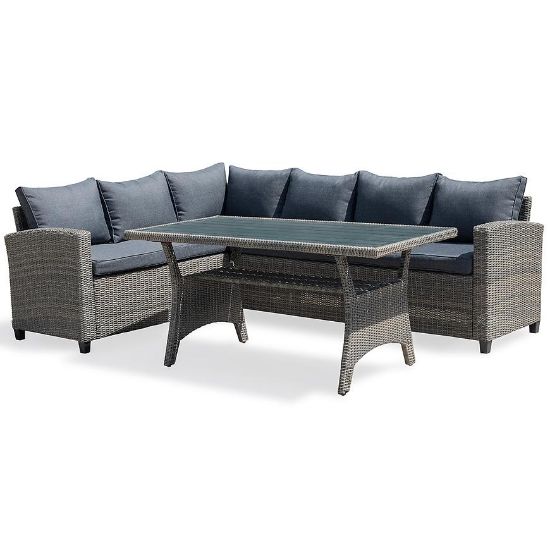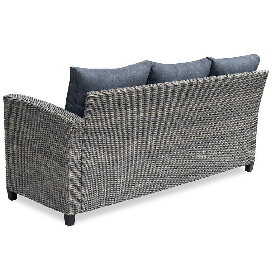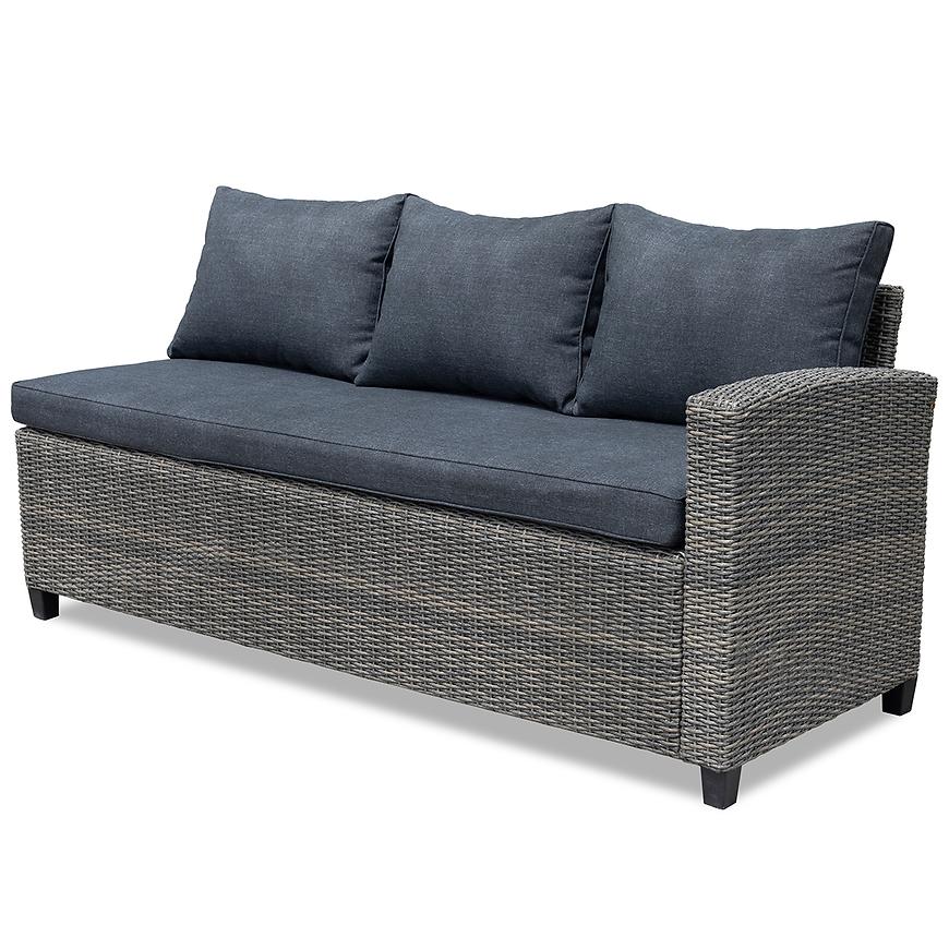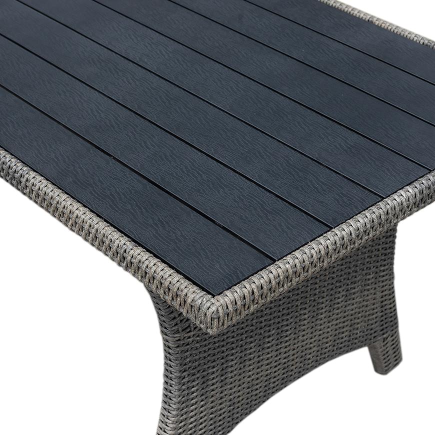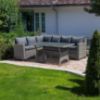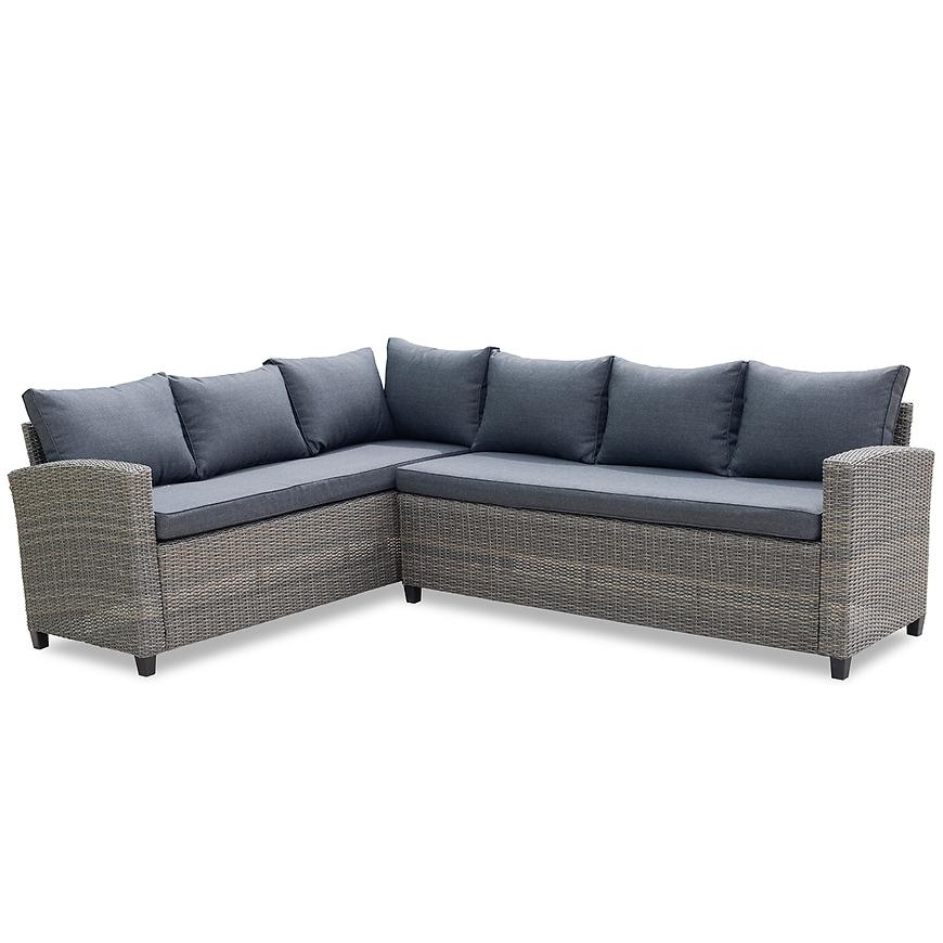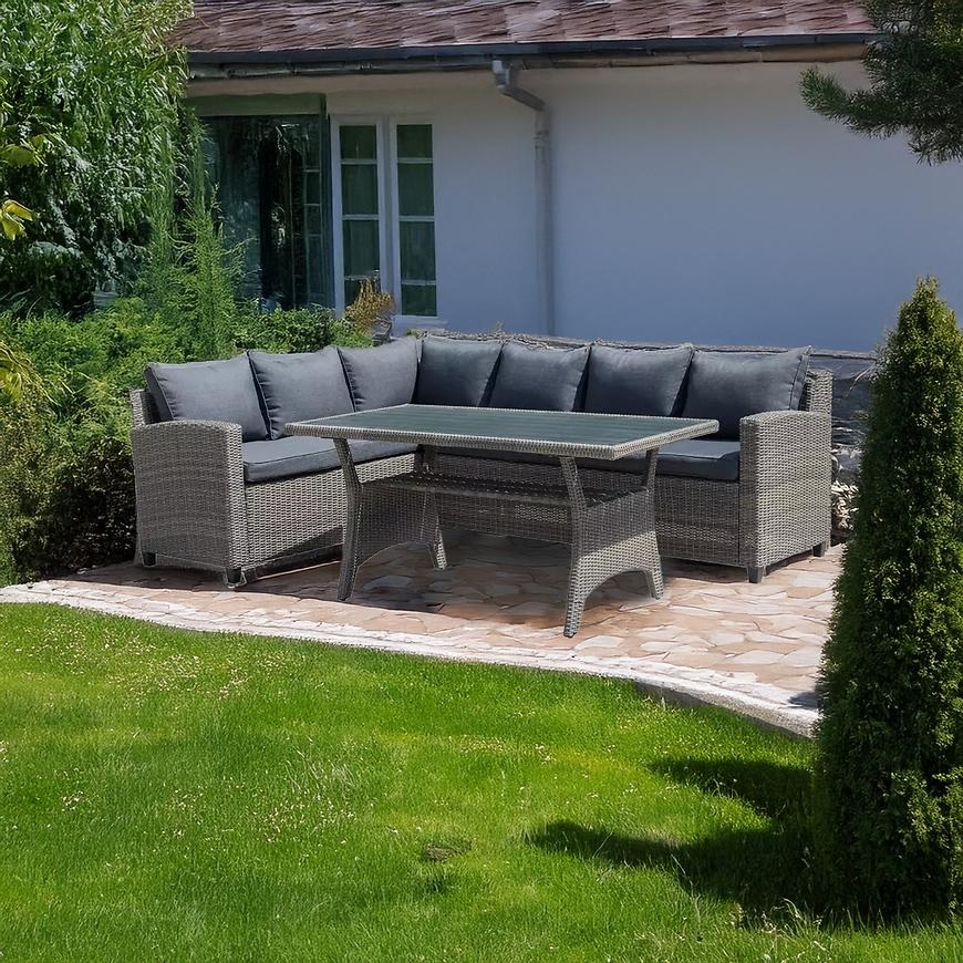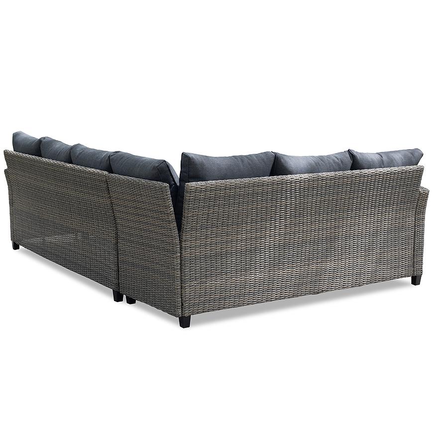 Zestaw jest przeznaczony dla 6 osób, co sprawia, że każdy gość będzie miał zapewniony odpowiednią wygodę i przestrzeń podczas wspólnych spotkań. Kolorystyka w szarych tonacjach oraz grafitowymi poduszki dodają narożnikowi stylu i elegancji, doskonale komponując się z otoczeniem ogrodu.