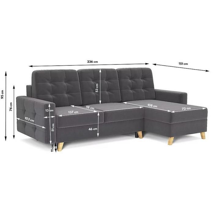 Sofa narożna Vegas to najbardziej praktyczny mebel, który będzie pasował do małego salonu, ale znajdzie swoje miejsce również w innym pomieszczeniu. Nowoczesne narożniki rozkładane to doskonały wybór na długie lata to szczególnie ważne i świetne rozwiązanie, które zapewni miejsce snu w komfortowych warunkach. Powierzchnia wynosi 146x206cm. Vegas posiada jeden pojemnik na pościel, a system rozkładania typu DL to szybki, prosty i wygodny sposób rozkładania.