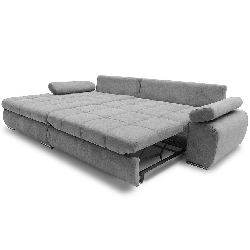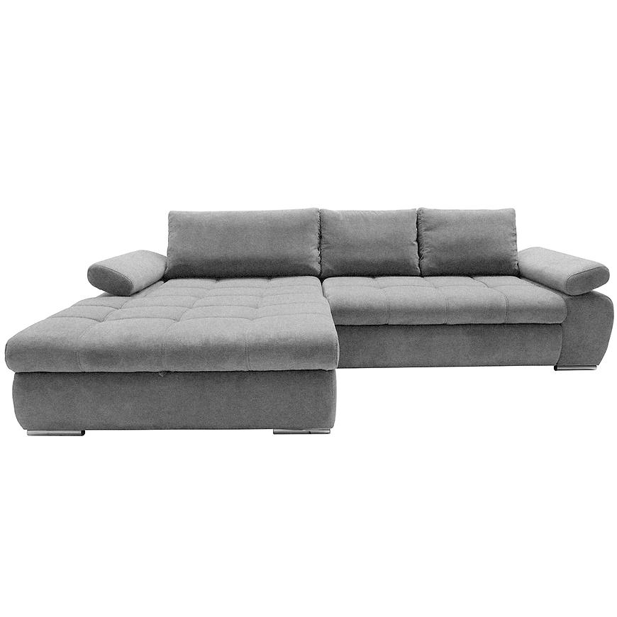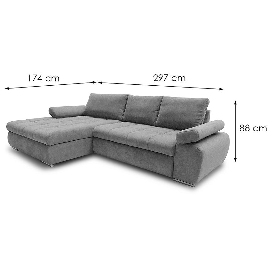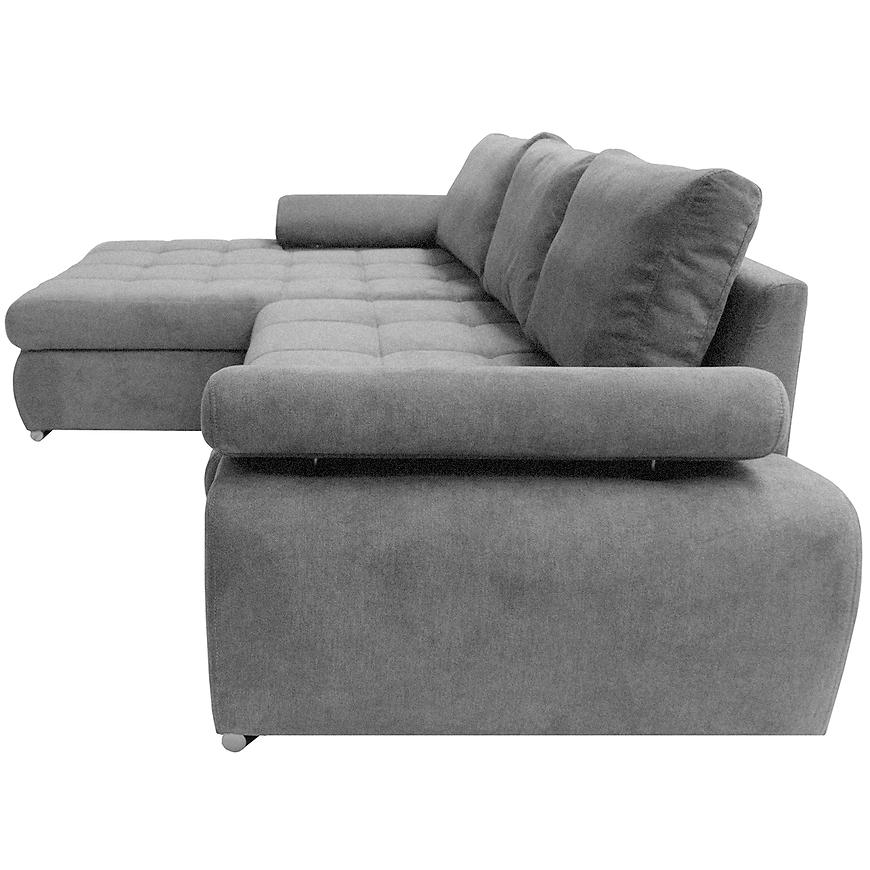 Narożnik Vienna L Aston 17 to duży narożnik w kształcie litery L o wymiarach 297x174x88 cm z funkcją spania 230x160 cm. Posiada pojemnik na pościel oraz mechanizm rozkładania delfin. Siedzisko wypełnione sprężyną falistą i pianką PU, tapicerka wykonana z tkaniny w kolorze szarym. Narożnik wyposażono w regulowane podłokietniki i nowoczesny design, zapewniając komfort i funkcjonalność w przestronnych wnętrzach.