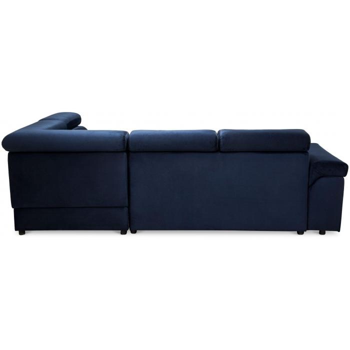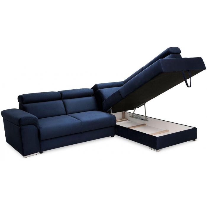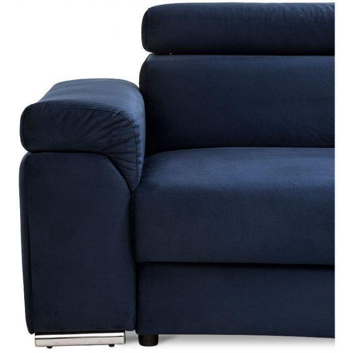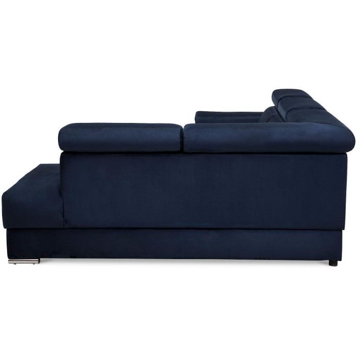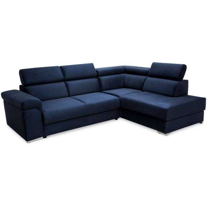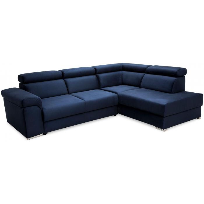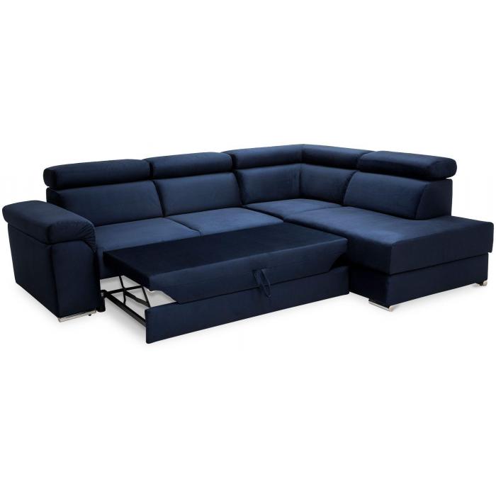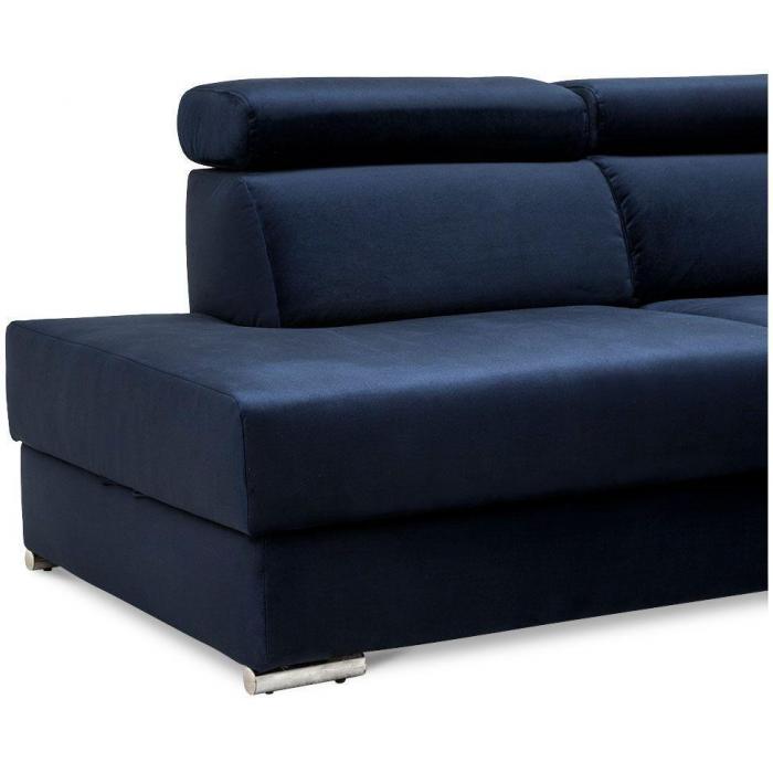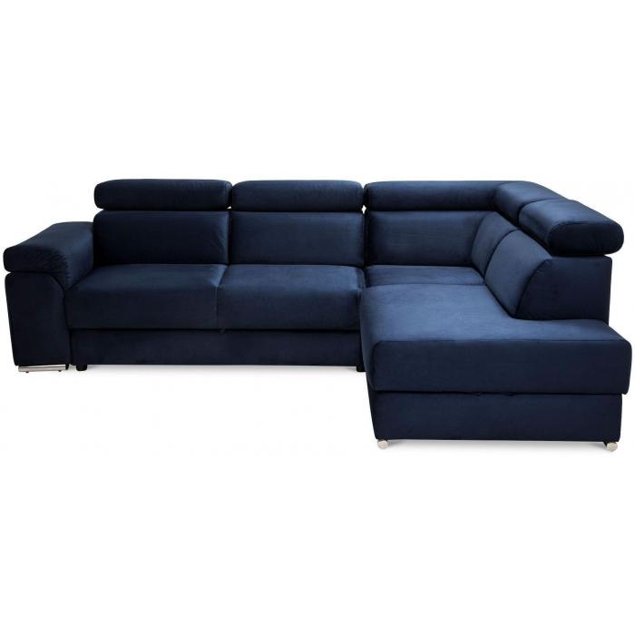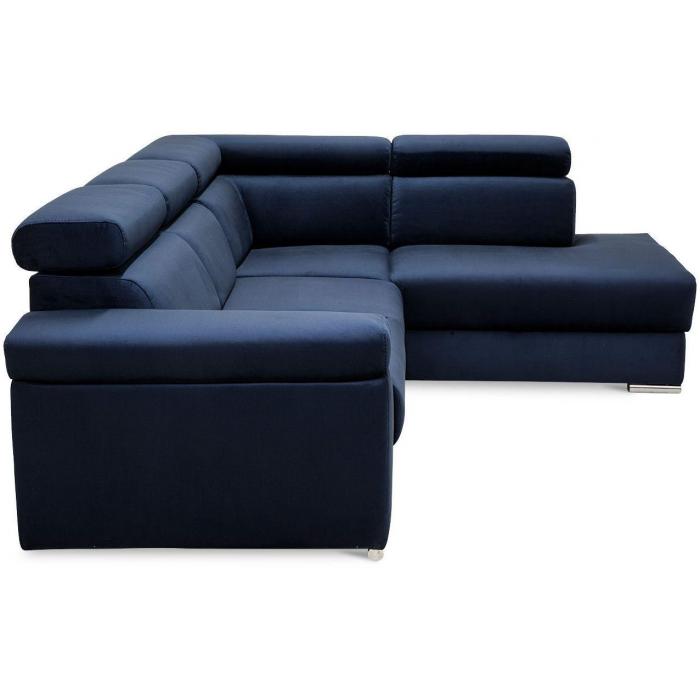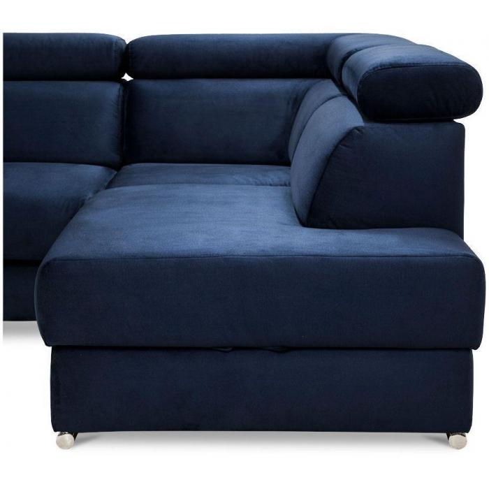 Sofa narożna Wersal w kolorze granatowym z funkcją spania, mechanizmem ułatwiającym rozkładanie oraz pojemnikiem na pościel. Model dostępny w opcji prawej lub lewej. W konstrukcji narożnika użyto pianek wysokoelastycznych T35, wózek tworzący powierzchnię spania posiada sprężyny faliste. Powierzchnia spania o wymiarach 125x195 cm. Nóżki metalowe chromowane. Mebel pakowany jest w dwie paczki o wymiarach: 1/2. 101x83x173; 2/2. 101x85x205 cm.