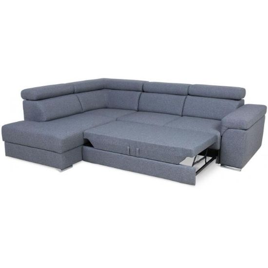 Kanapa narożna Wersal posiada jeden pojemnik na pościel, a system rozkładania typu wózek, to szybki, prosty i wygodny sposób rozkładania.