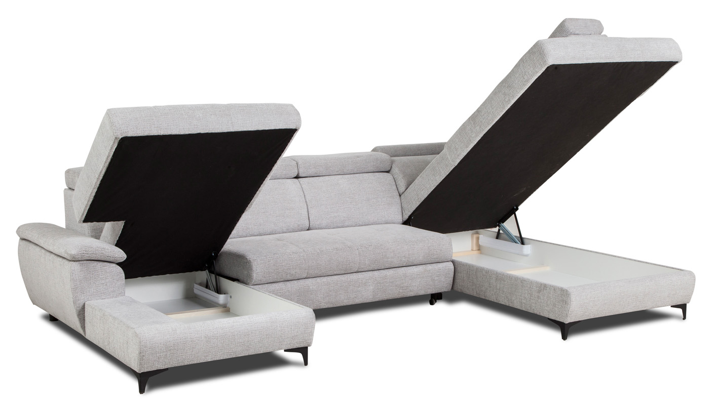 Model Harris wyposażono w dwa pojemniki na pościel, idealne do przechowywania kołder, zestawów pościeli, koców czy innych domowych tekstyliów. Schowki są łatwo dostępne i umieszczone w sposób, który nie ogranicza wygody użytkowania narożnika. Dzięki temu salon staje się bardziej uporządkowany, a wolna przestrzeń może zostać wykorzystana w praktyczniejszy sposób.