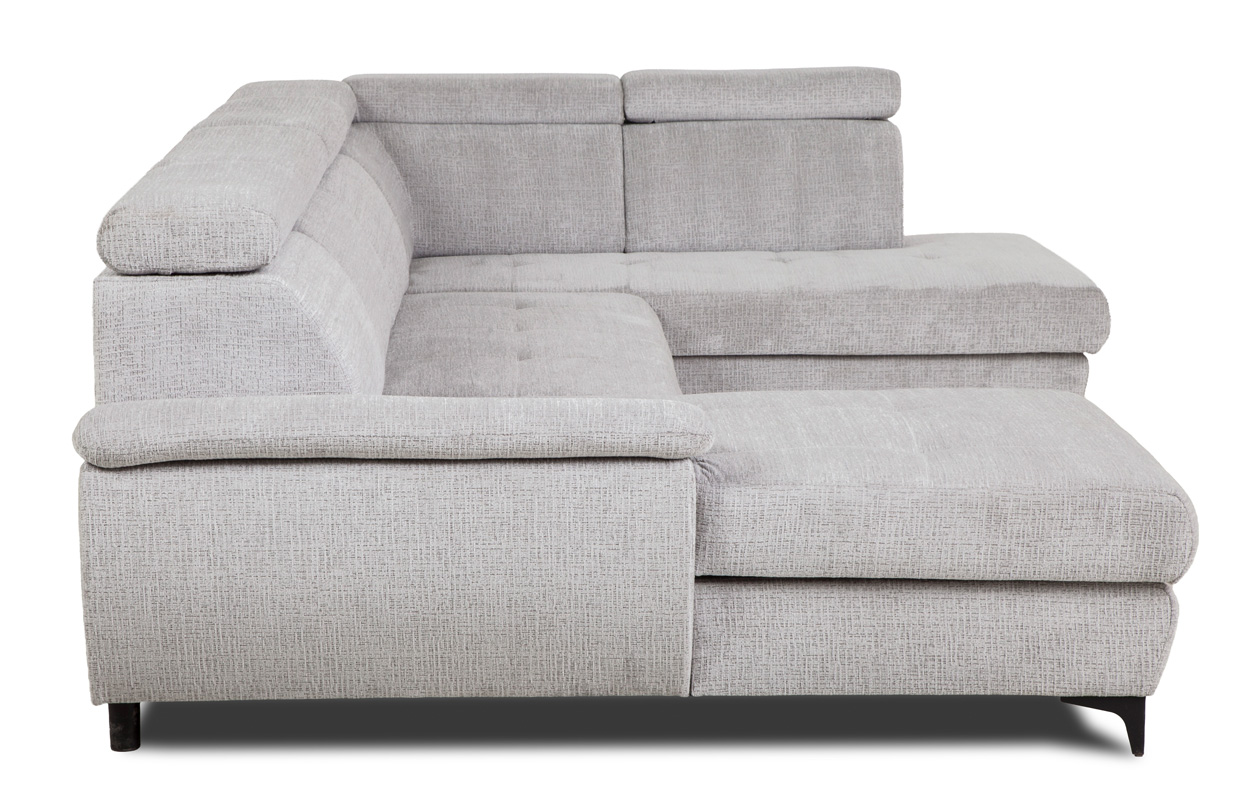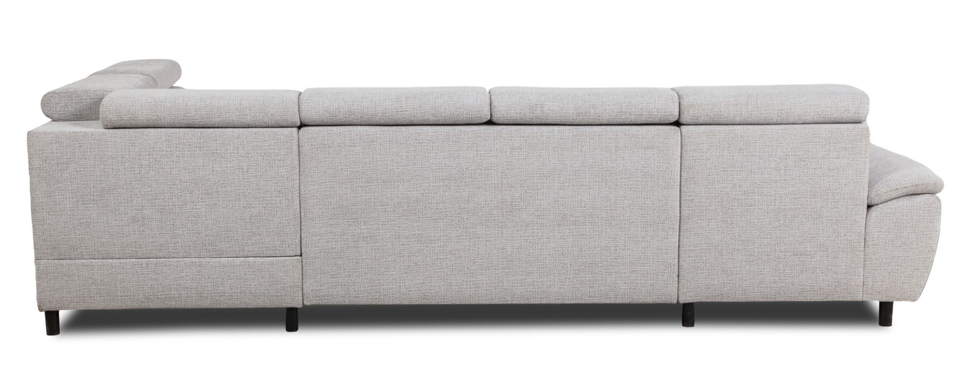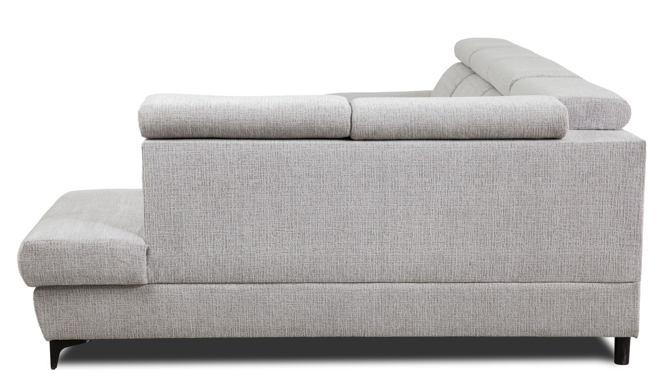 Regulowane zagłówki to jedno z największych udogodnień tego modelu. Pozwalają one ustawić kąt i wysokość podparcia, co ułatwia znalezienie wygodnej pozycji podczas oglądania filmów, czytania czy popołudniowego odpoczynku. Stałe poduchy oparciowe zapewniają stabilne wsparcie pleców, tworząc wygodną linię oparcia przez całą szerokość narożnika.