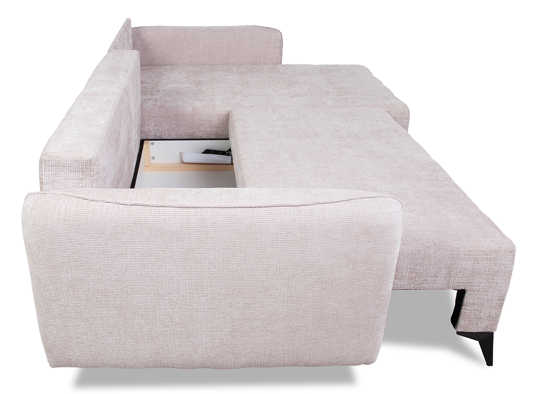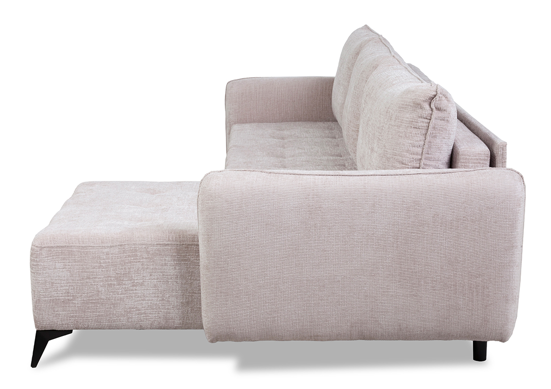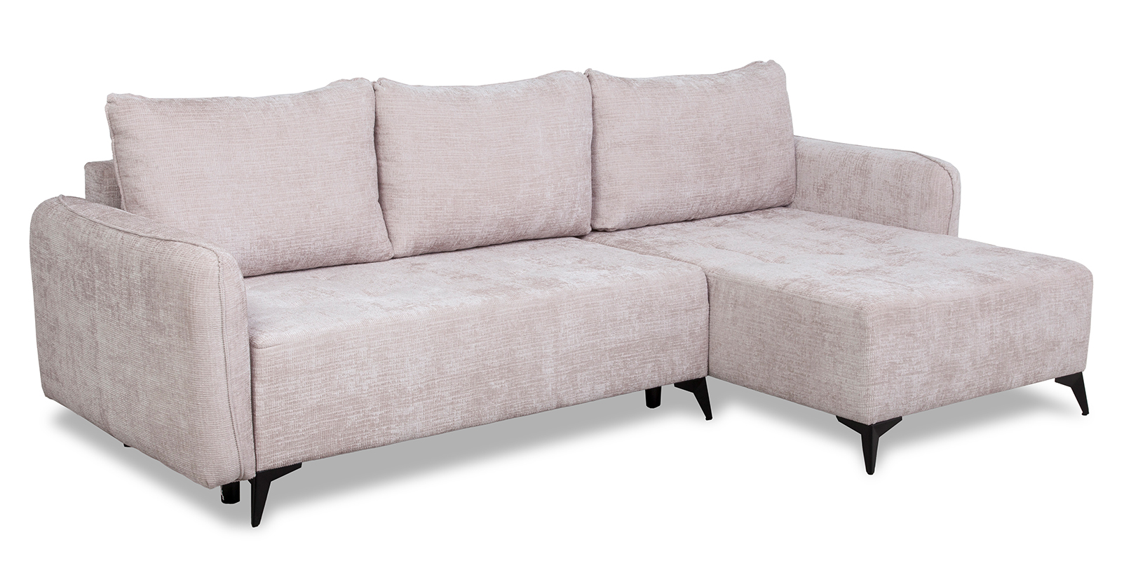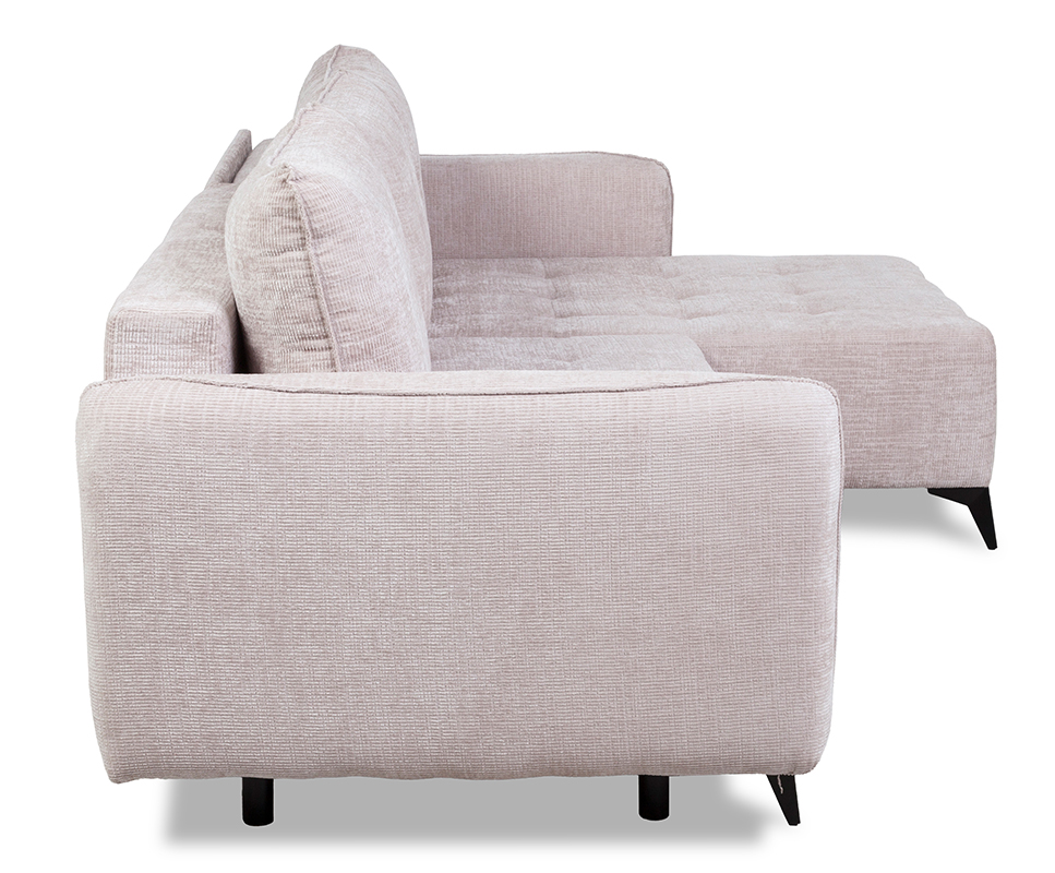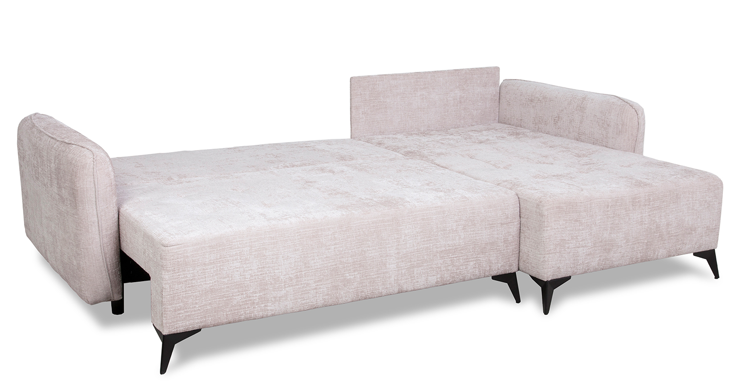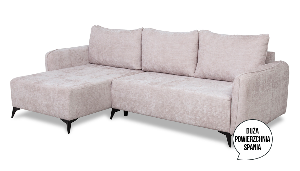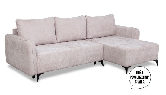 W siedzisku oraz oparciu zastosowano sprężyny faliste oraz piankę T30, co zapewnia wygodę użytkowania i długotrwałą wytrzymałość mebla. Dzięki uniwersalnej konstrukcji narożnika, można go łatwo dopasować do różnych ustawień w pomieszczeniu. Funkcja rozkładania w systemie „delfin” umożliwia szybkie przekształcenie narożnika w łóżko, a po rozłożeniu powierzchnia spania wynosi 145x245 cm, co zapewnia wygodny sen dla dwóch osób.