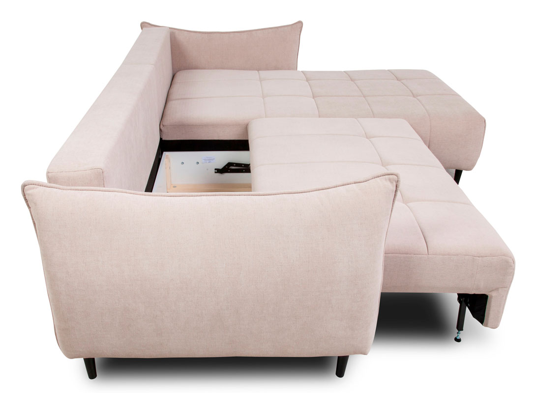 Sposób rozkładania Delfin pomaga szybko i bezproblemowo przekształcić kanapę w przestronne łóżko. Rozkładanie typu Delfin jest najczęściej spotykane w narożnikach - spod siedziska wysuwamy szufladę, a następnie podciągamy leżący element uzupełniający powierzchnię spania. Po rozłożeniu powierzchnia spania to 126x211cm, a pościel można schować do pojemnika umieszczonego pod siedziskiem zapewniając ład i porządek w pomieszczeniu.