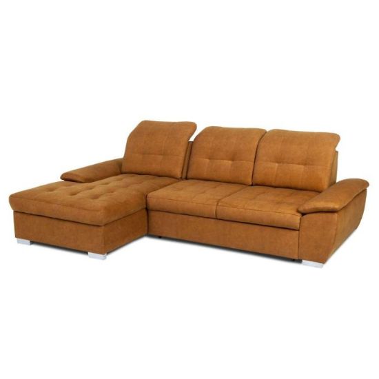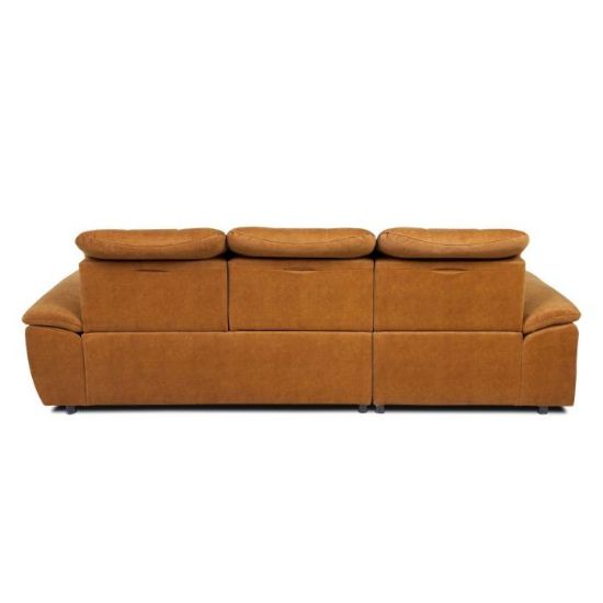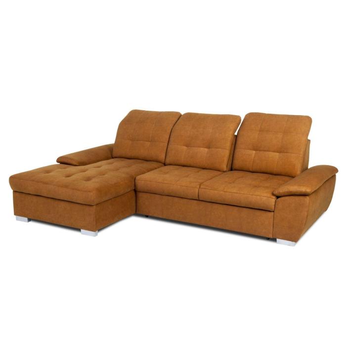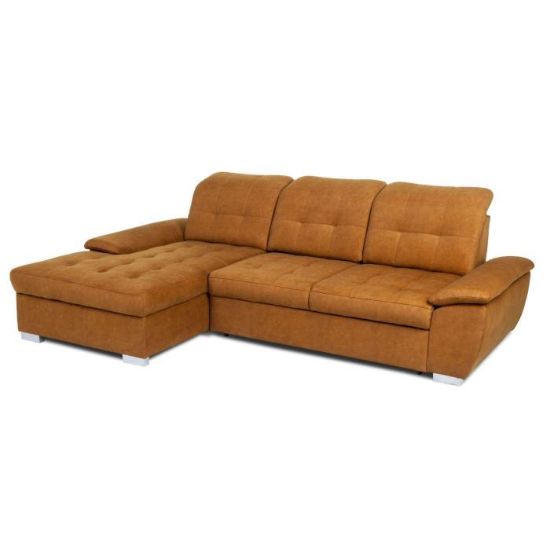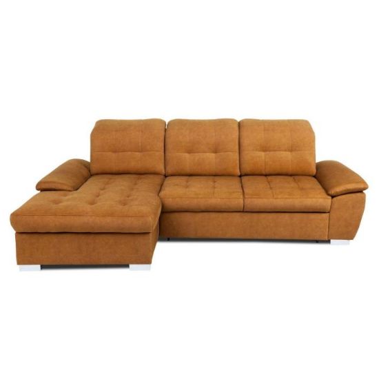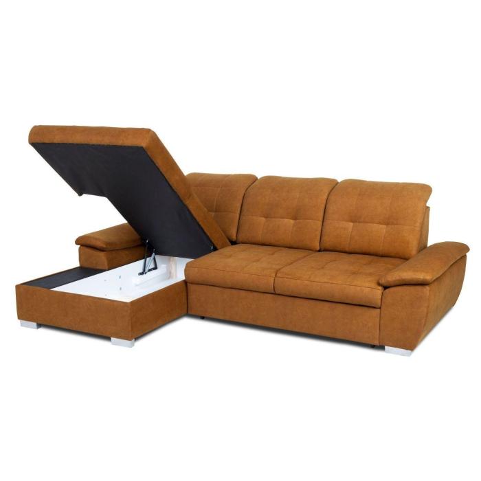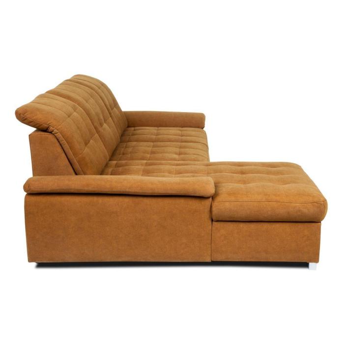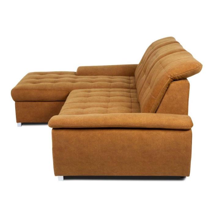 Narożnik z funkcją spania Andros to idealne rozwiązanie dla rodzin. Wykonany w tkaninie Vena w kolorze musztardowym. Kanapa narożna Andros dostępna jest w wersji prawej lub lewej. Wyposażony w jeden pojemnik na pościel. Regulowane oparcie (regulacja głębokości siedziska) posiada trzy regulowane zagłówki. W oparciu zastosowano pasy tapicerskie oraz piankę T21. W siedzisku narożnika zastosowano sprężynę falistą oraz piankę T30 co znacznie podnosi komfort wypoczynku. Narożnik tapicerowany świetnie sprawdzi się salonie lub innym pomieszczeniu. Meble wypoczynkowe wyposażone w funkcję spania to doskonały wybór na długie lata.