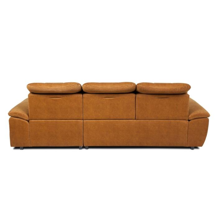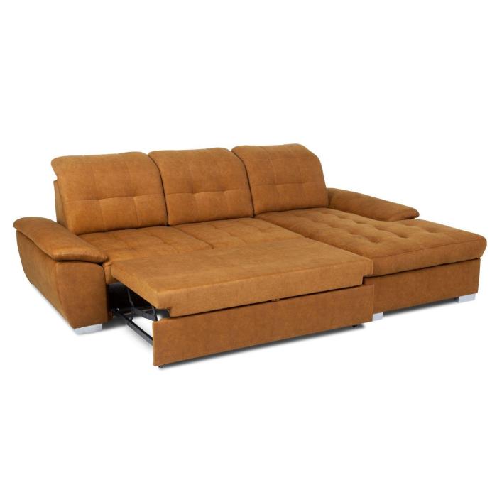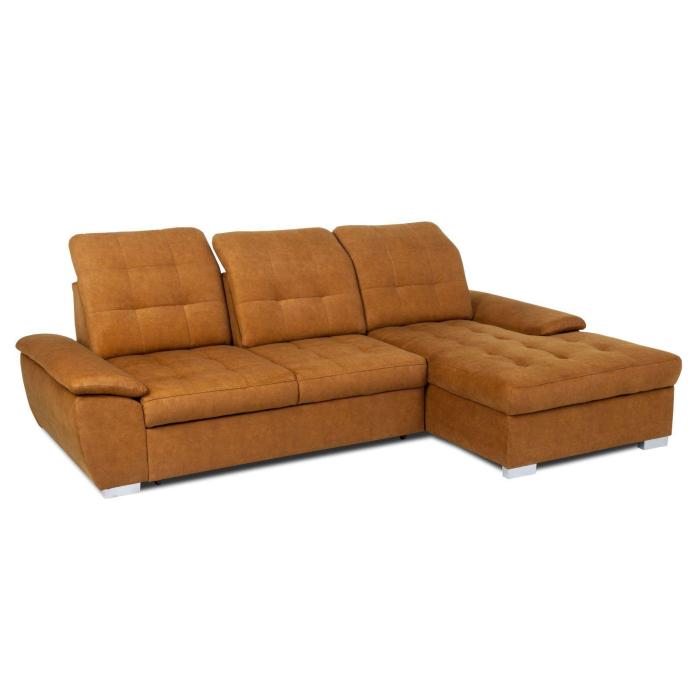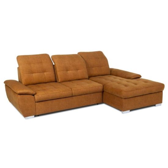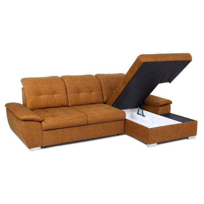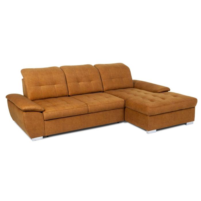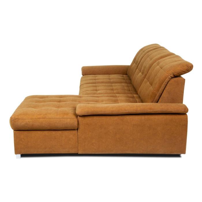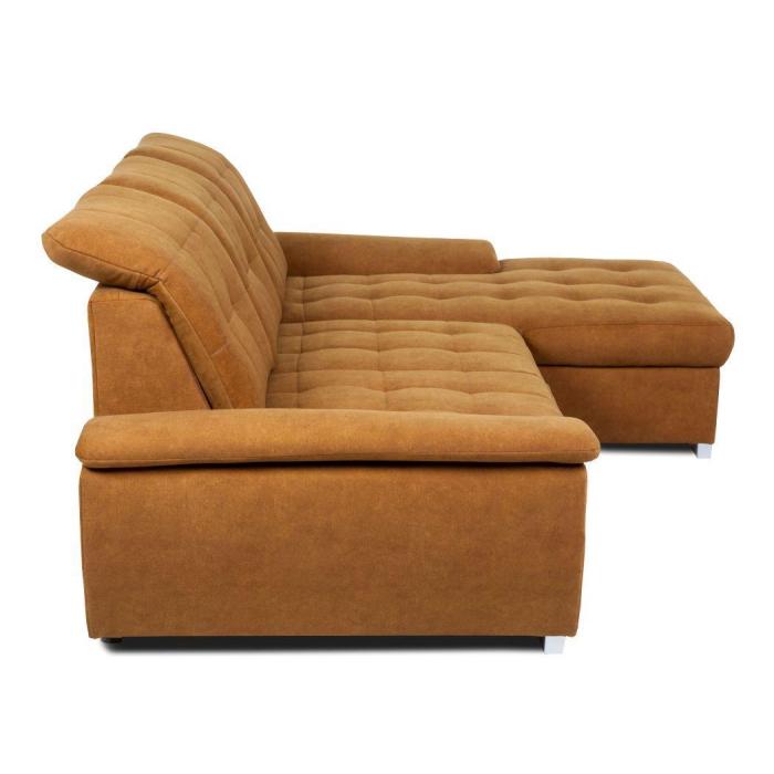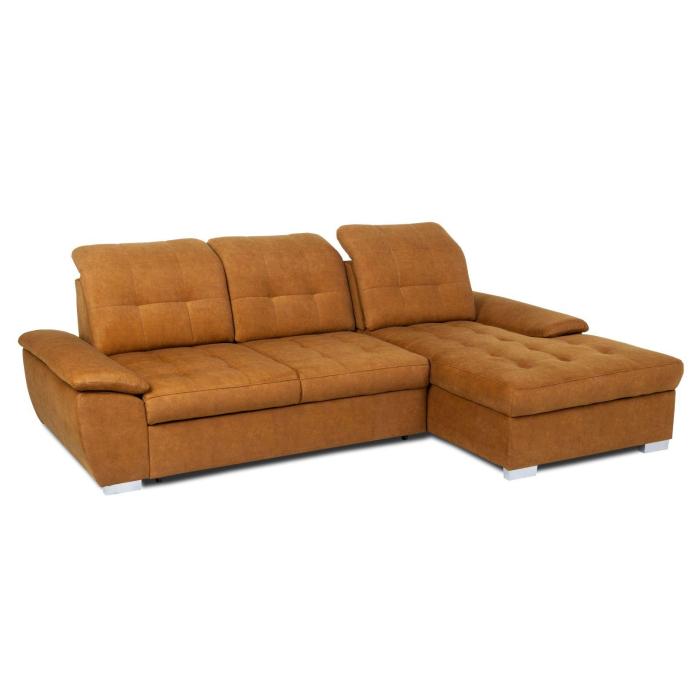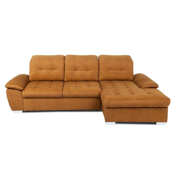 Narożnik z funkcją spania Andros to idealne rozwiązanie dla rodzin. Wykonany w tkaninie Vena w kolorze musztardowym. Kanapa narożna Andros dostępna jest w wersji prawej lub lewej. Wyposażony w jeden pojemnik na pościel. Regulowane oparcie (regulacja głębokości siedziska) posiada trzy regulowane zagłówki. W oparciu zastosowano pasy tapicerskie oraz piankę T21. W siedzisku narożnika zastosowano sprężynę falistą oraz piankę T30 co znacznie podnosi komfort wypoczynku. Narożnik tapicerowany świetnie sprawdzi się salonie lub innym pomieszczeniu. Meble wypoczynkowe wyposażone w funkcję spania to doskonały wybór na długie lata.