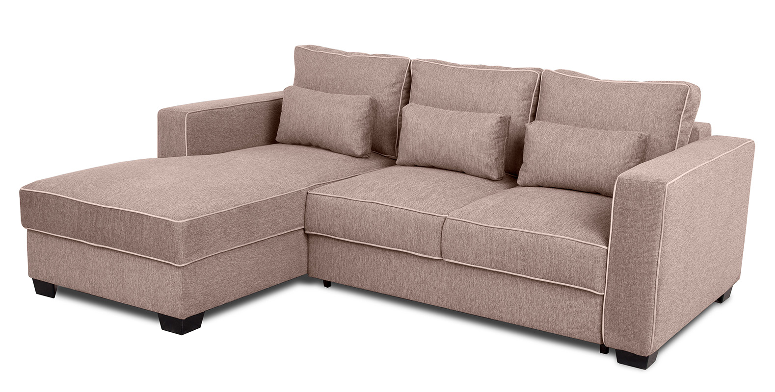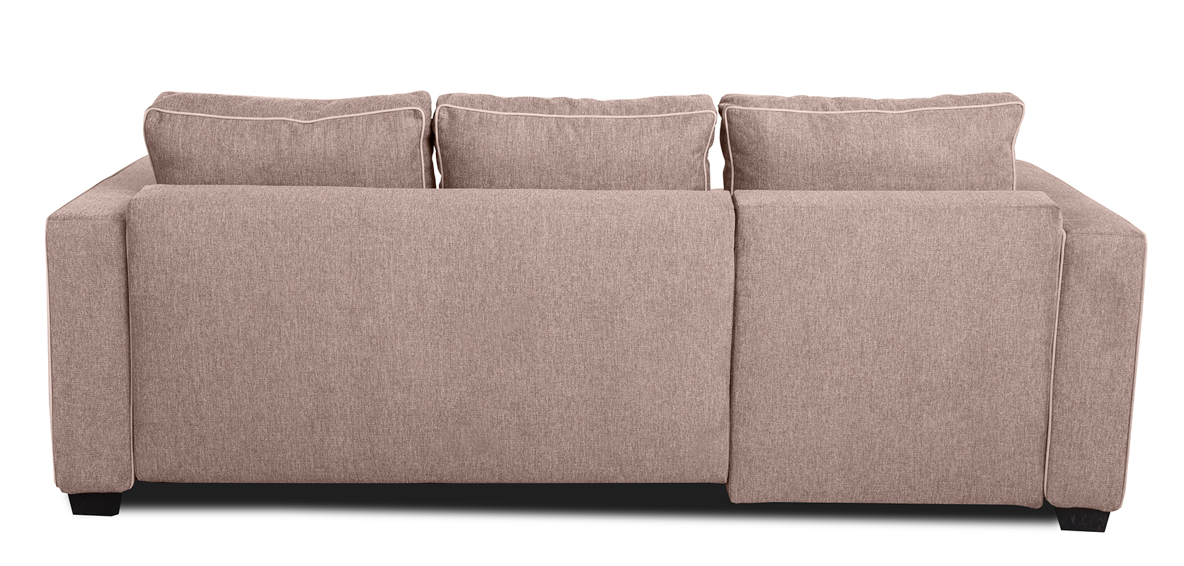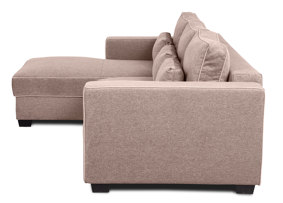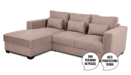 Narożnik rozkładany Ares to mebel z dwoma pojemnikami na pościel. Narożnik posiada trzy duże poduszki oparciowe oraz trzy mniejsze. W siedzisku jak również w oparciu zastosowano podwójną sprężynę (bonell oraz falista). Narożnik w dosteny jest konfiguracji prawy, lewy. Sposób rozkładania DL, po rozłożeniu otrzymujemy dużą powierzchnię spania o wymiarach 143x200 cm. Siedzisko narożnika znajduje się na wysokości 50 cm od podłogi. Narożnik tapicerowany tkaniną Brego w kolorze beżowym. Brego to tkanina z charakterystycznym wykończeniem tworzącym efekt trój wymiarowości i melanżu, jest odporna na ścieranie oraz na mechacenie i powstawanie "pilingu". Jako element dekoracyjny zastosowano ozdobne lamówki na siedzisku oraz bokach narożnika. Narożnik posiada drewniane nóżki w kolorze czarnym.