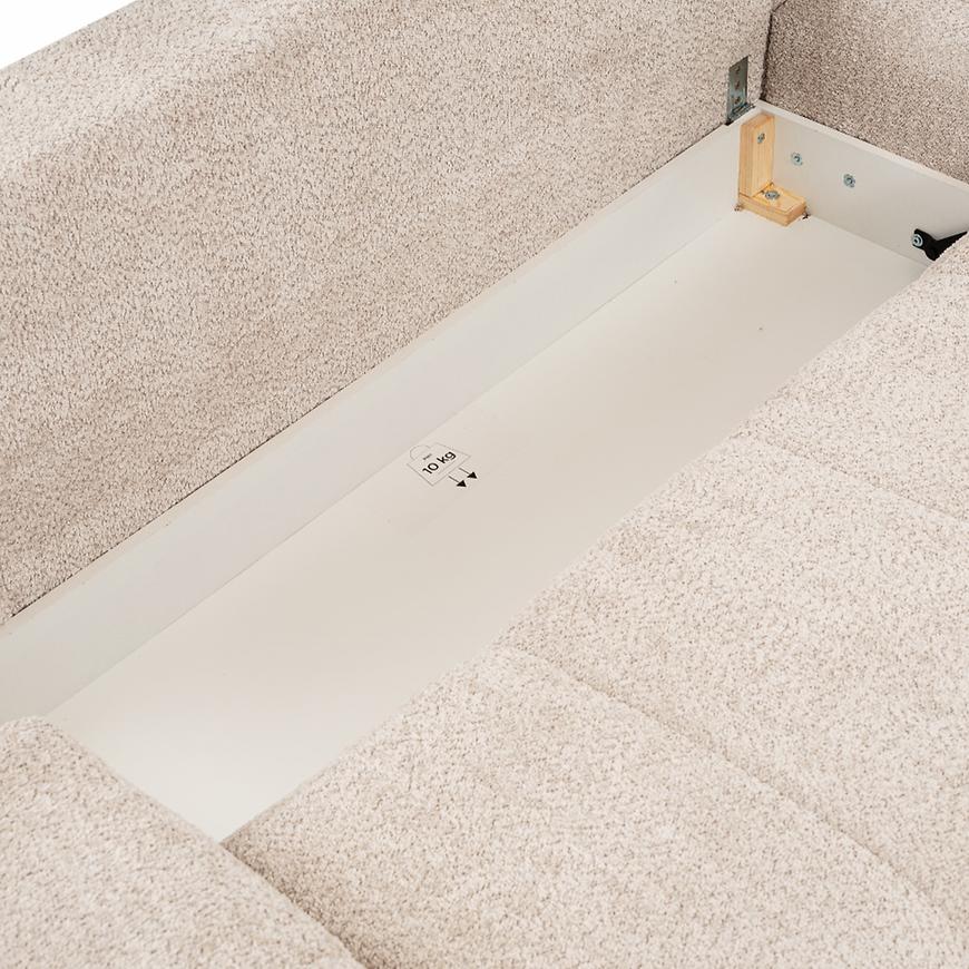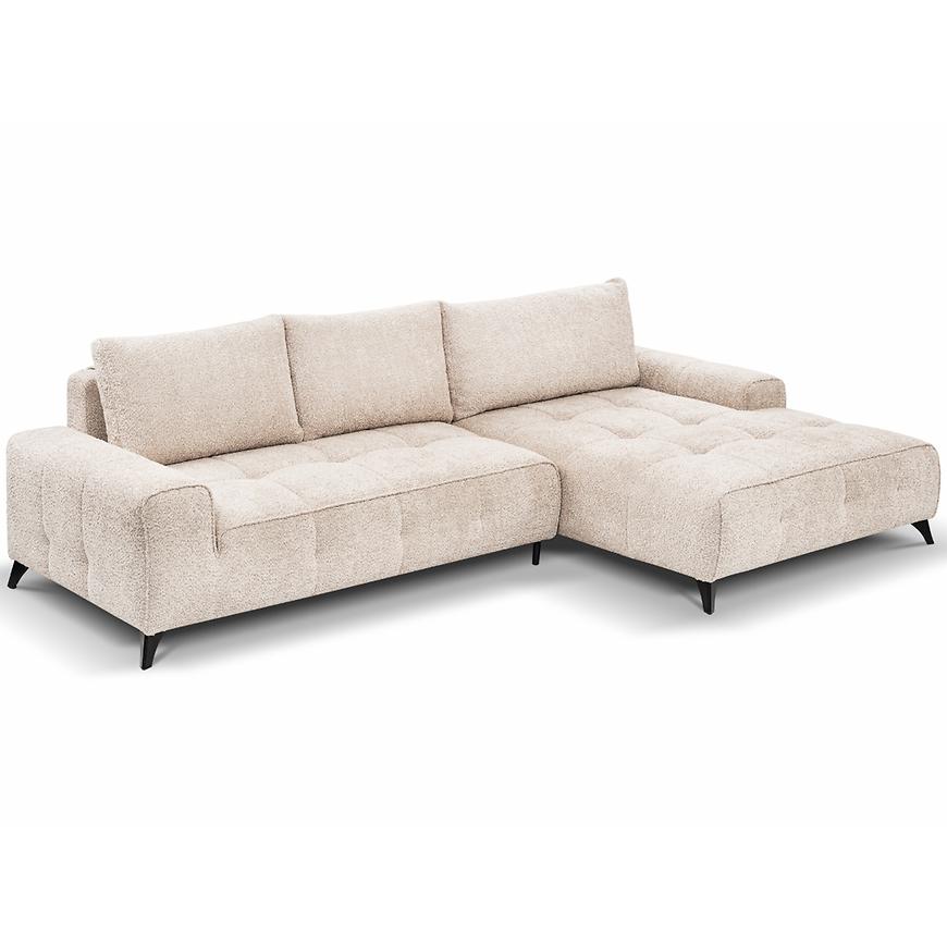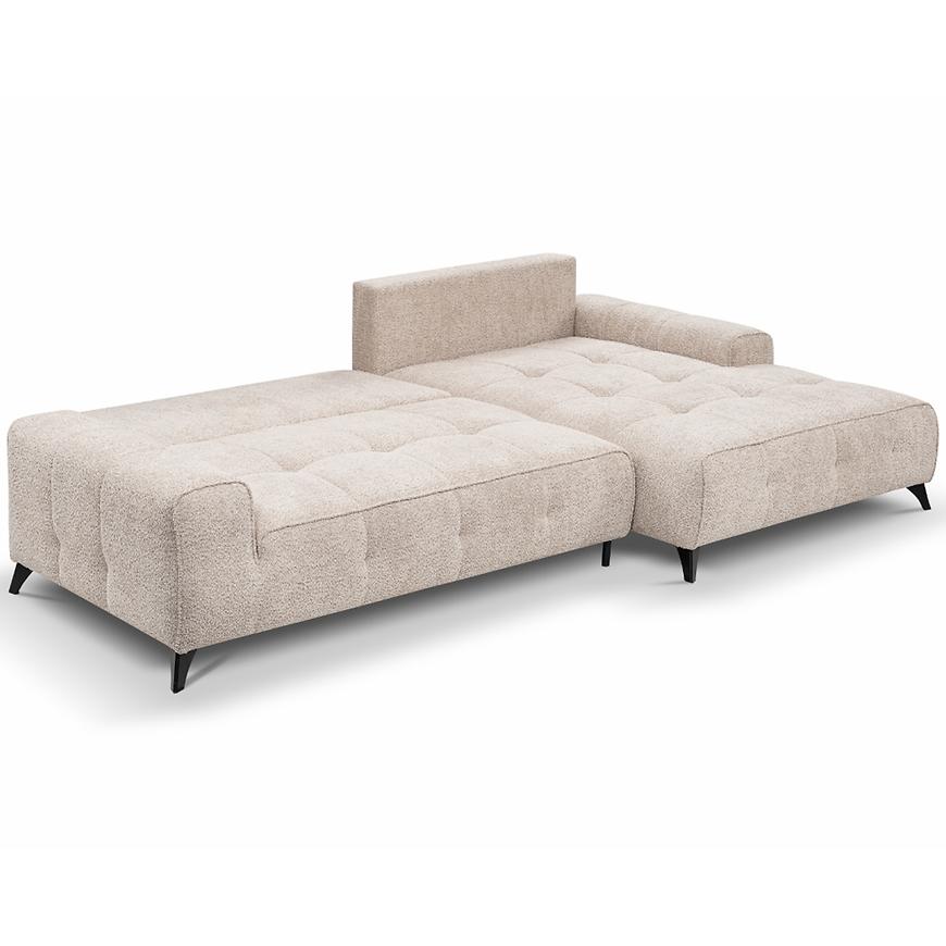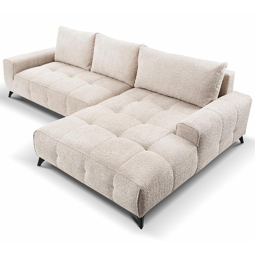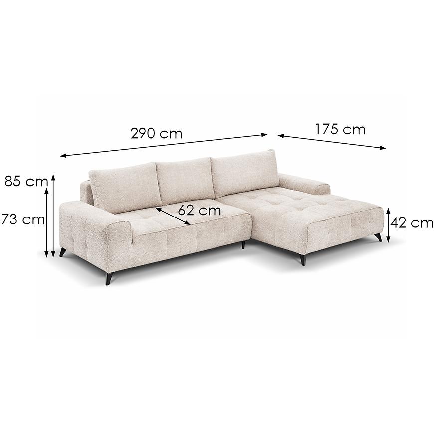 Prawostronna orientacja narożnika w kształcie litery L doskonale sprawdza się w ustawieniach narożnych, a brak zbędnych ozdobników, regulowanych zagłówków czy podłokietników wpisuje się w prostotę i funkcjonalność skandynawskiego designu. Mebel opiera się na stabilnych, czarnych nogach, które kontrastują z jasną tkaniną i dodają mu nowoczesnego charakteru. W zestawie znajdują się poduszki, które podkreślają jego przytulność i zwiększają komfort użytkowania.