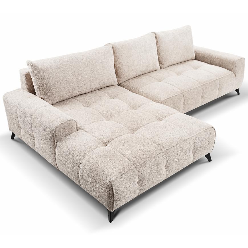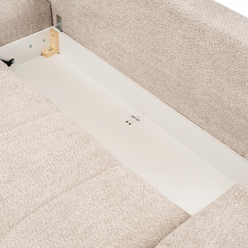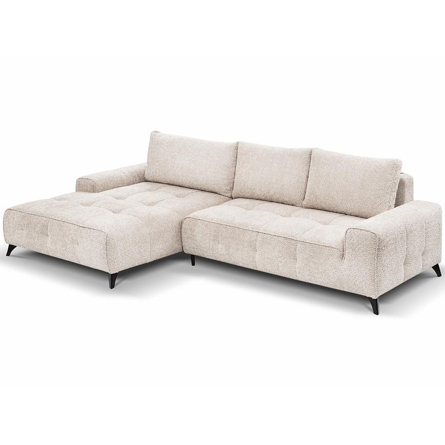 Wnętrze siedziska wypełnione sprężyną falistą zapewnia odpowiednie podparcie i komfort podczas siedzenia oraz spania. Dzięki lewostronnej orientacji narożnika w kształcie litery L, można go z łatwością dopasować do układu większości pomieszczeń. Prosta forma bez regulowanych zagłówków, podłokietników i oparcia, w połączeniu z czarnymi, minimalistycznymi nogami, doskonale wpisuje się w skandynawski design – lekki, funkcjonalny i ponadczasowy.