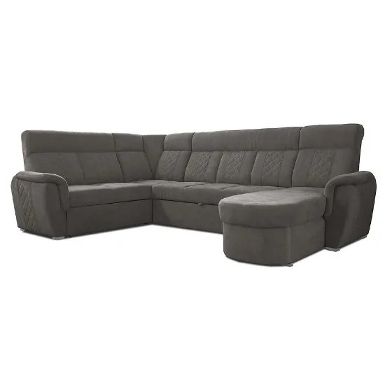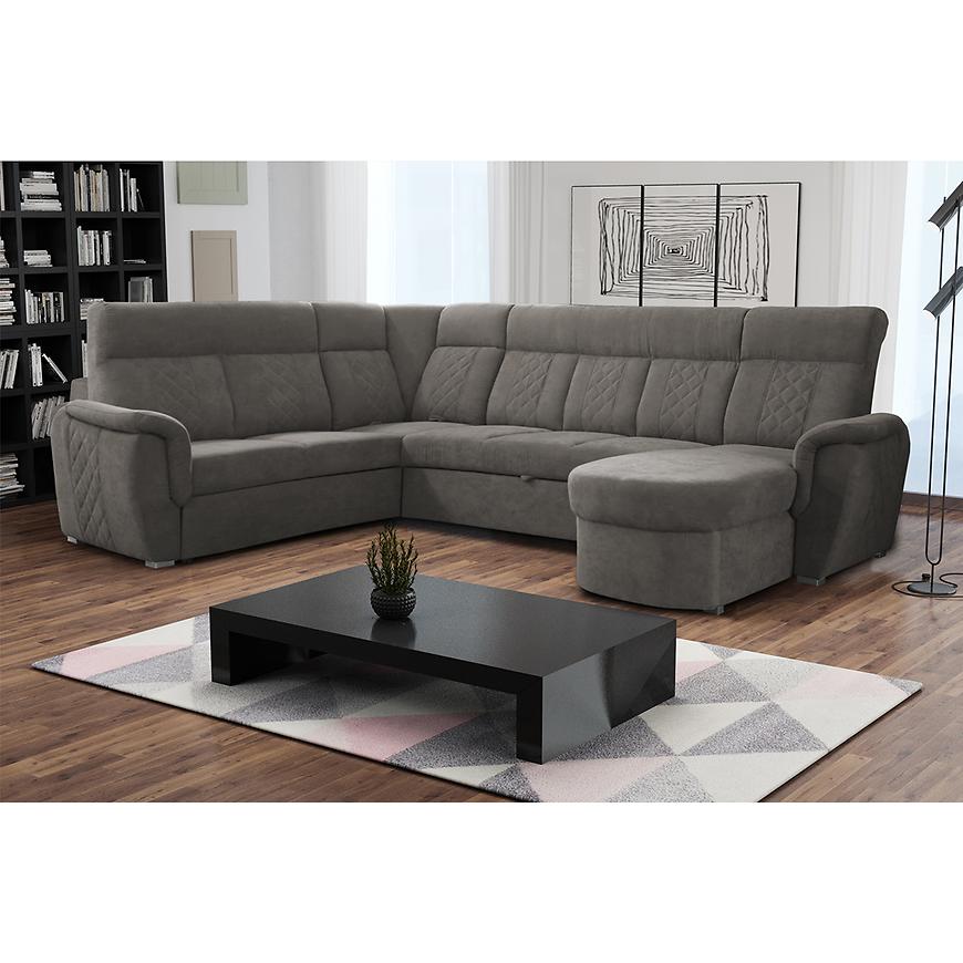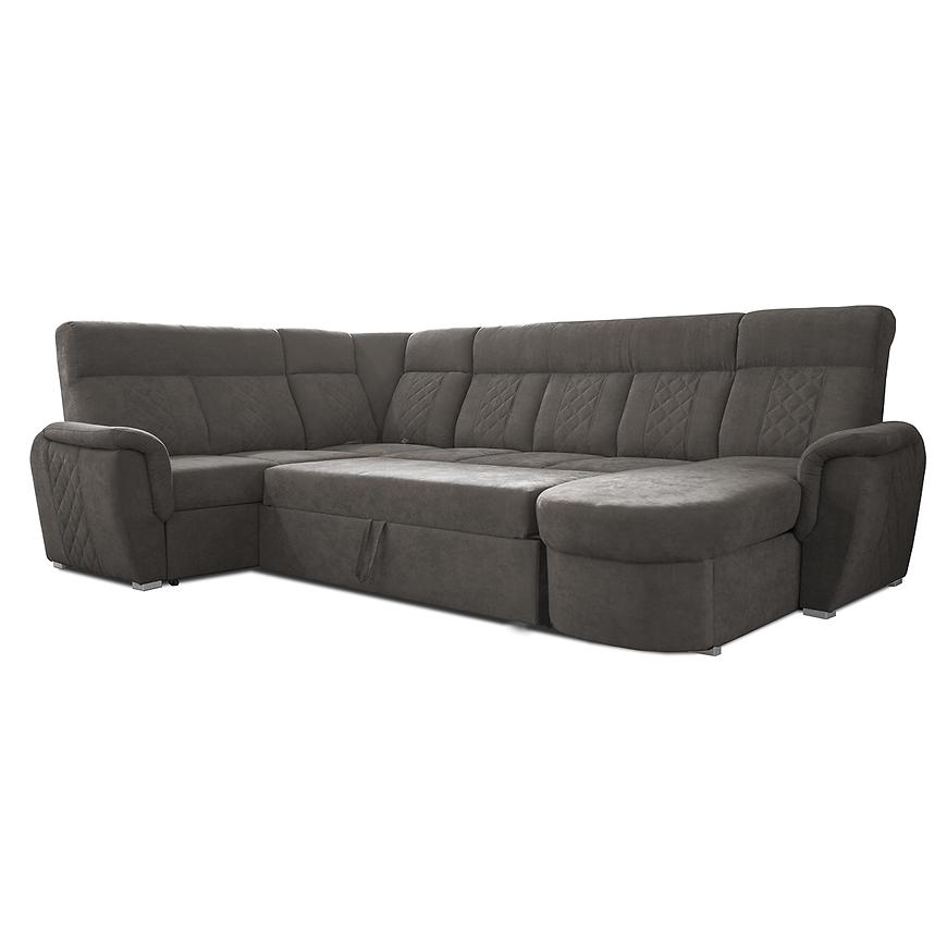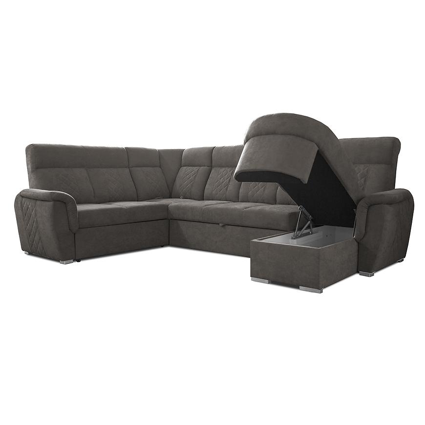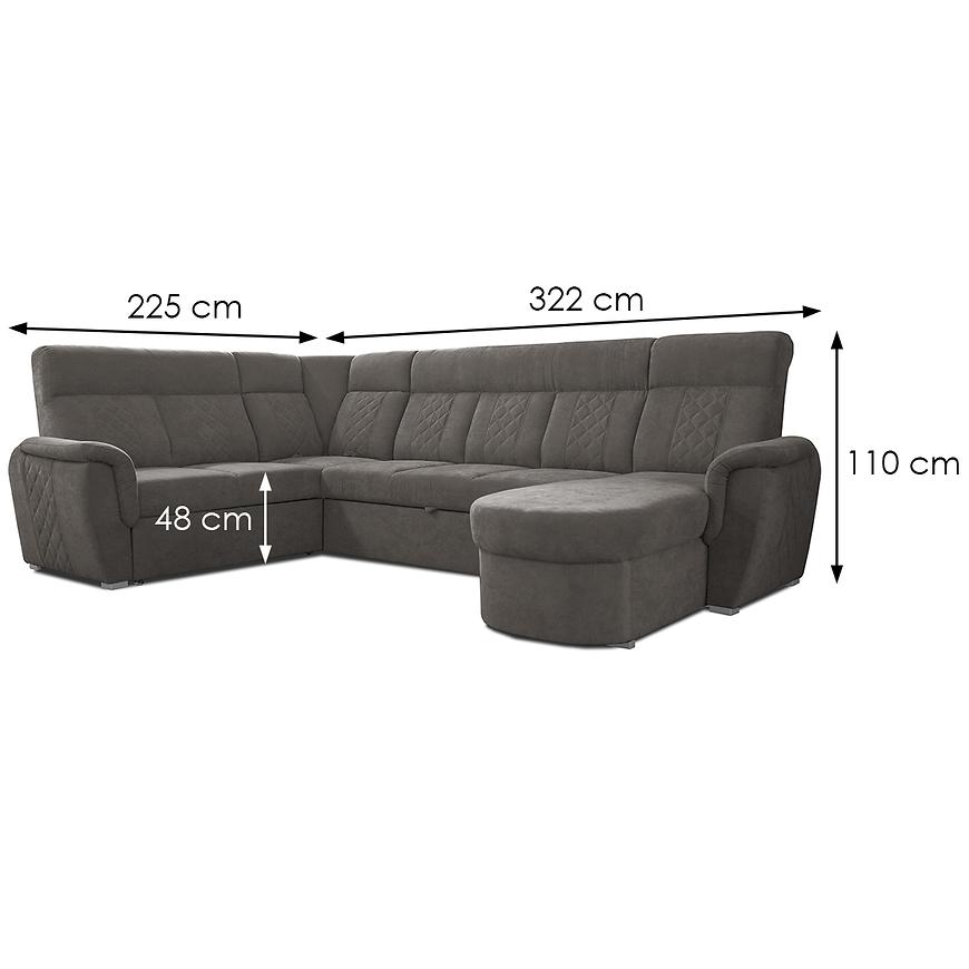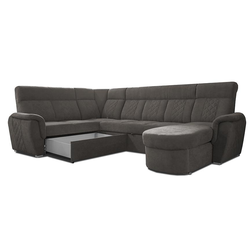 Narożnik Bahama Sally 3 prawostronny – przestronny narożnik w kształcie litery U z funkcją spania (255x120 cm) i dwoma pojemnikami na pościel. Tapicerka z brązowej tkaniny, wypełnienie sprężyną bonell, chromowane nogi i regulowane oparcie. Wysokość siedziska 48 cm. Wymaga złożenia. Stylowy i funkcjonalny mebel, łączący wygodę z praktycznością.