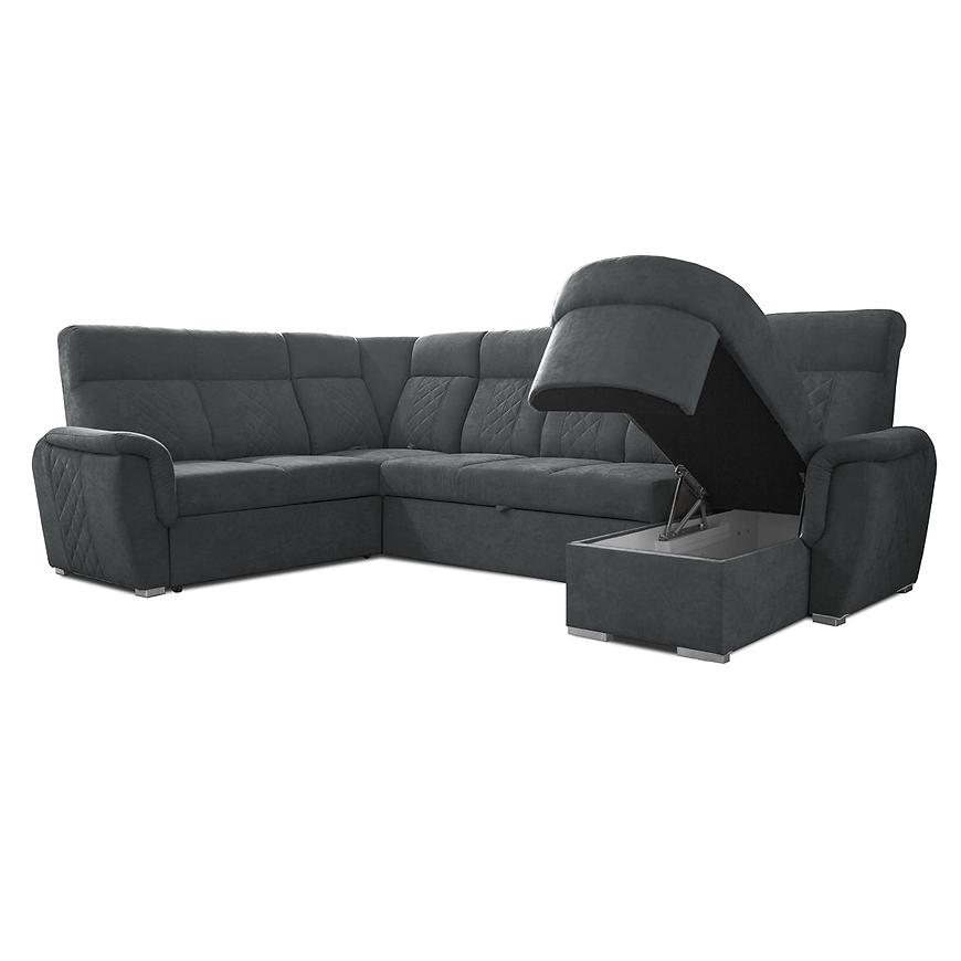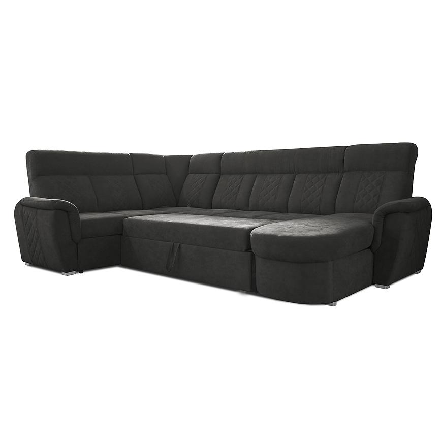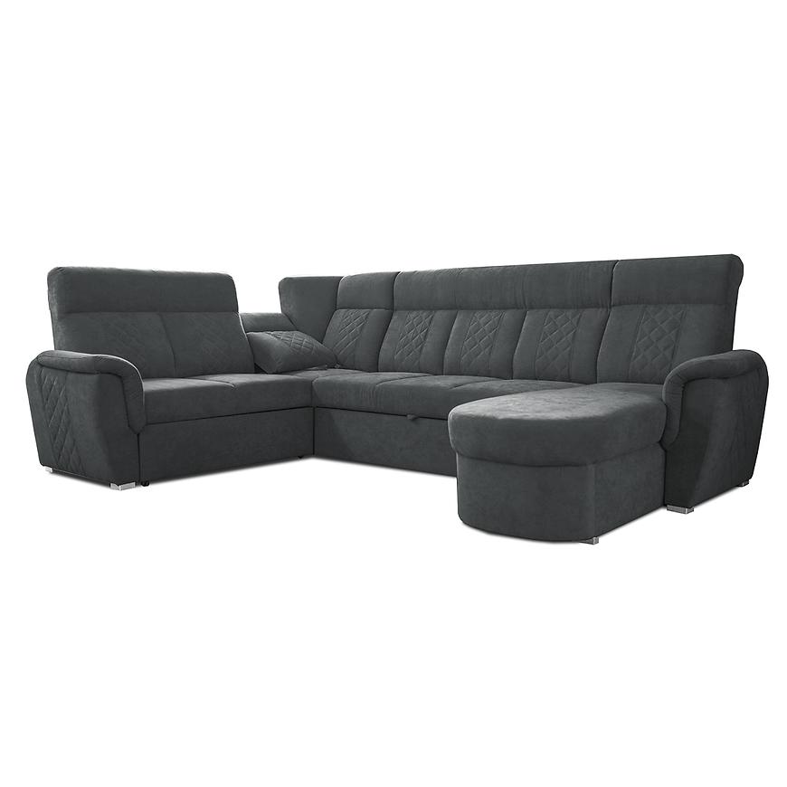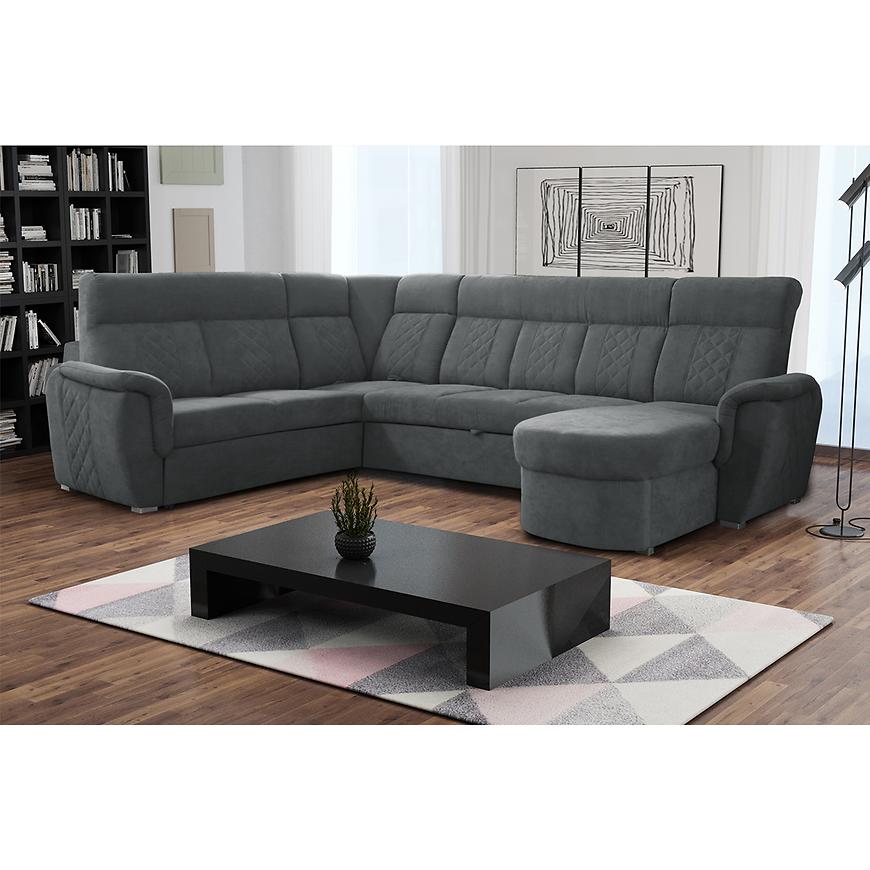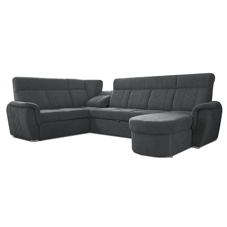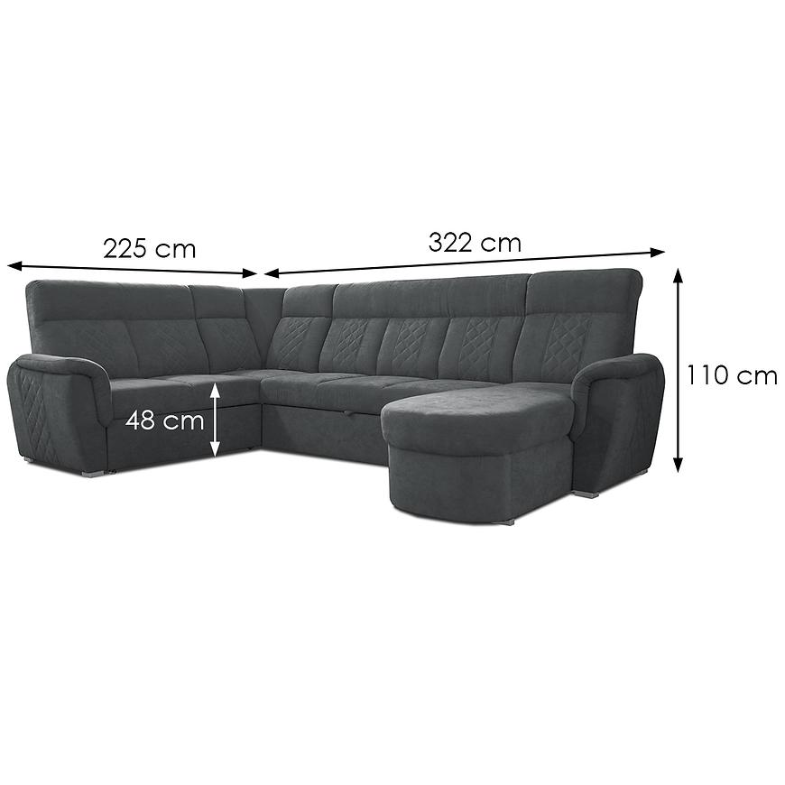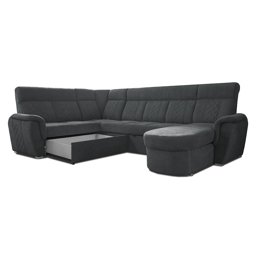 Narożnik Bahama Sally 9 prawostronny – przestronny narożnik w kształcie litery U z funkcją spania (255x120 cm) i dwoma pojemnikami na pościel. Tapicerka w szarej tkaninie, sprężyste wypełnienie sprężyną bonell, chromowane nogi oraz regulowane oparcie. Wysokość siedziska 48 cm. Wymaga złożenia. Idealne połączenie komfortu, stylu i praktyczności do każdego wnętrza.