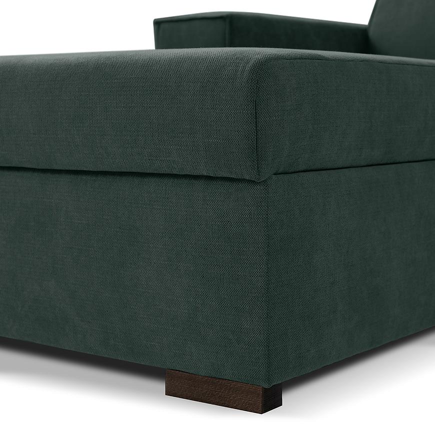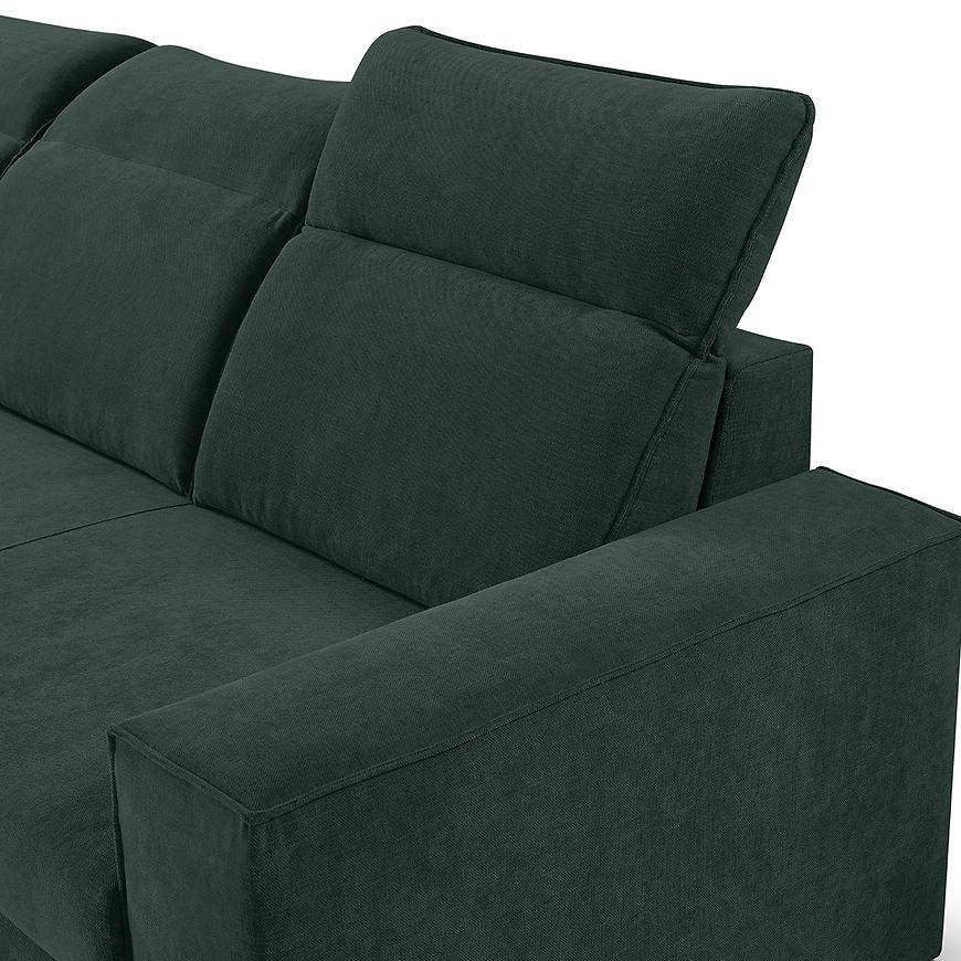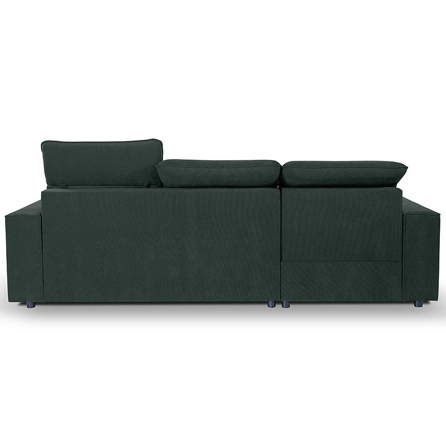 Narożnik Bali posiada również funkcję spania, którą można aktywować w prosty sposób dzięki "sposobowi rozkładania delfin". Po rozłożeniu to okazjonalne miejsce do spania. Dodatkowym atutem jest schowek na pościel, który umożliwia przechowywanie pościeli lub innych dodatków w sposób dyskretny i oszczędzający miejsce. Jeden pojemnik na pościel dodatkowo ułatwia organizację przestrzeni i przechowywanie niezbędnych rzeczy. Regulowany zagłówek to kolejny element, który podnosi komfort użytkowania tego narożnika. Możesz dostosować go do swoich potrzeb, aby cieszyć się idealnym wsparciem podczas czytania, oglądania filmów czy relaksu. Narożnik Bali wspierany jest solidnymi nogami w kolorze ciemnego orzecha, które nadają mu wyjątkowej elegancji i stabilności.