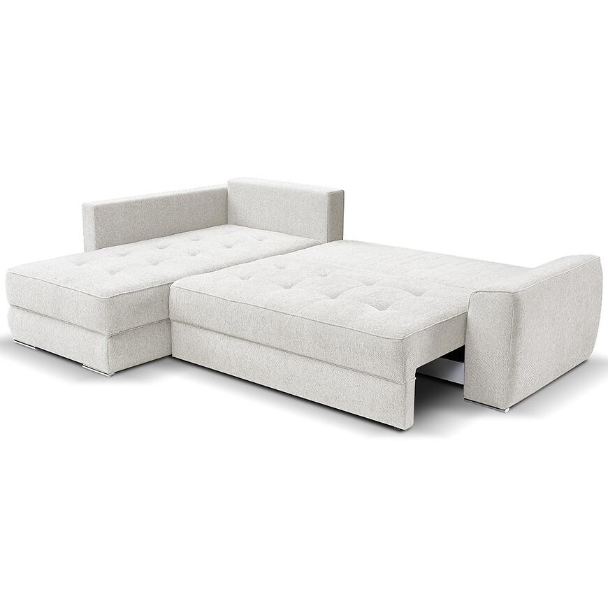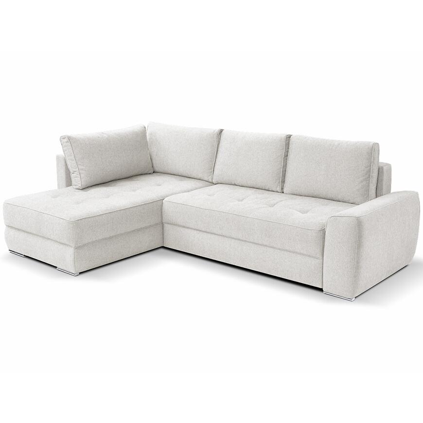 Narożnik Bari Kate został wyposażony w mechanizm rozkładania typu DL, co sprawia, że obsługa jest prosta i bezproblemowa. Dodatkowym atutem jest praktyczny pojemnik na pościel, który ułatwia przechowywanie i pozwala zachować porządek w salonie. Model posiada eleganckie, chromowane nogi nadające całości lekkości oraz dołączone poduszki, które podnoszą komfort siedzenia i stanowią gustowny element dekoracyjny. Uniwersalna orientacja narożnika daje swobodę w aranżacji przestrzeni, dzięki czemu mebel z łatwością dopasuje się do układu pomieszczenia.